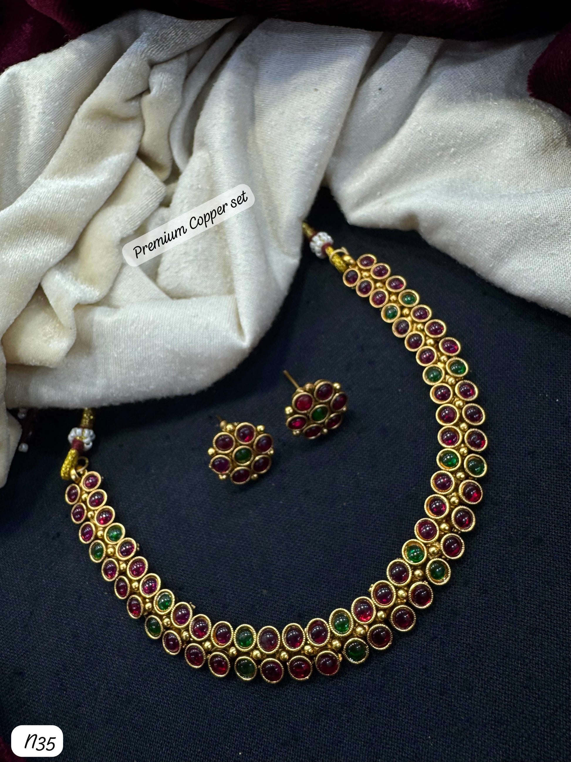 This elegant traditional copper necklace set features a beautifully crafted design with vibrant red and green stones, perfect for adding a touch of classic charm to any outfit. The set includes a matching necklace and stud earrings, showcasing intricate detailing and a polished finish that enhances the rich colors of the stones. Ideal for festive occasions, weddings, or everyday wear, this premium copper set combines timeless style with lasting durability.