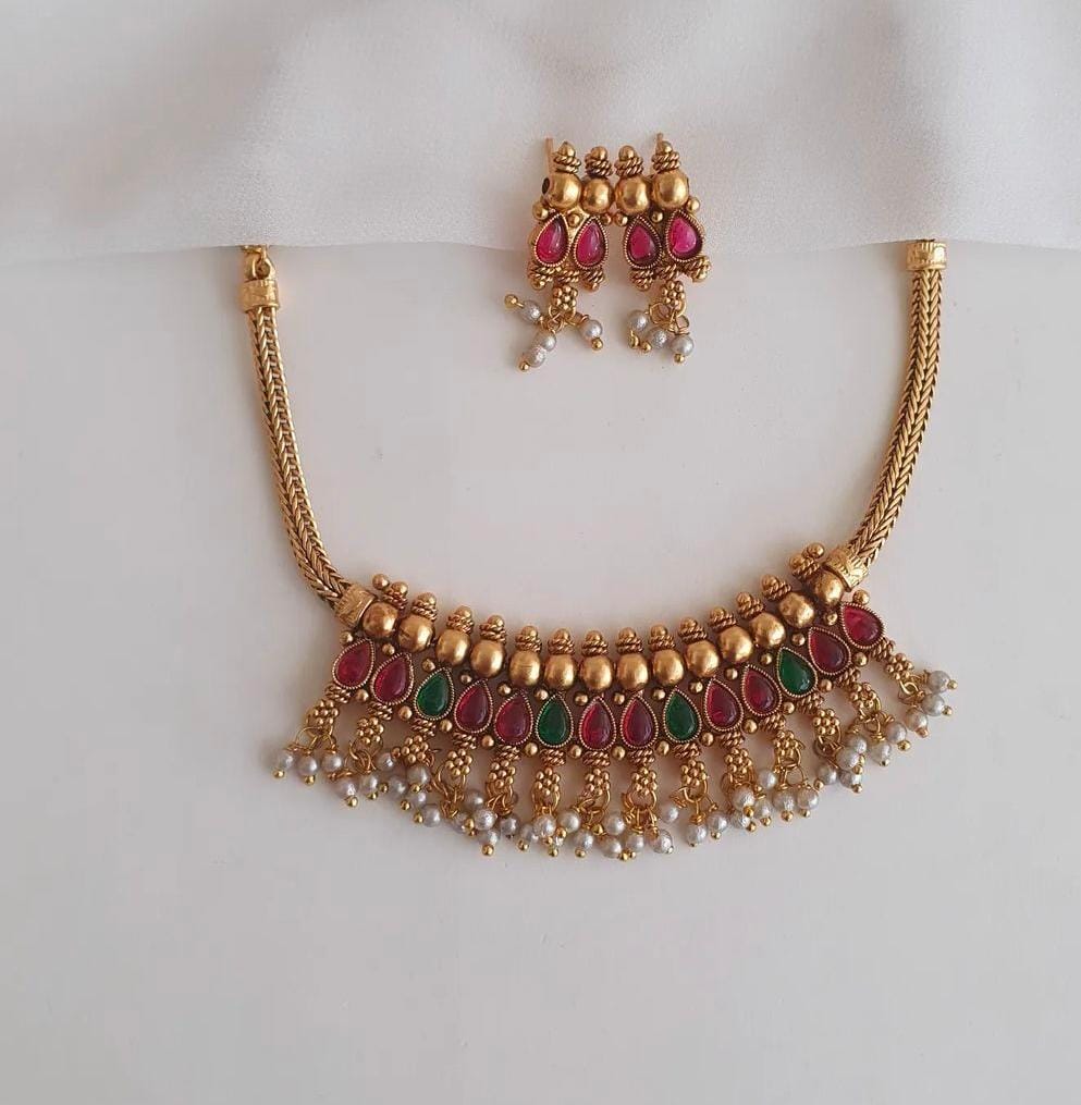 Celebrate timeless heritage with this exquisite Temple-Style Necklace and Earring Set, inspired by traditional South Indian craftsmanship. Adorned with intricate motifs, drop accents, and delicate pearl hangings, this set exudes cultural charm and sophistication. Crafted with attention to detail, it’s the perfect choice for weddings, classical events, and festive celebrations. Pair it with silk sarees or traditional wear to complete your regal look.