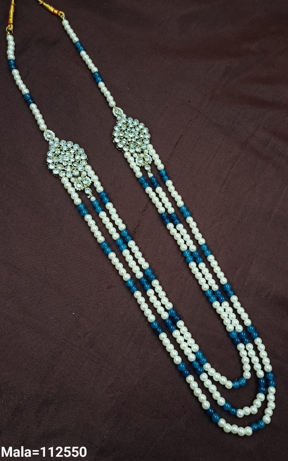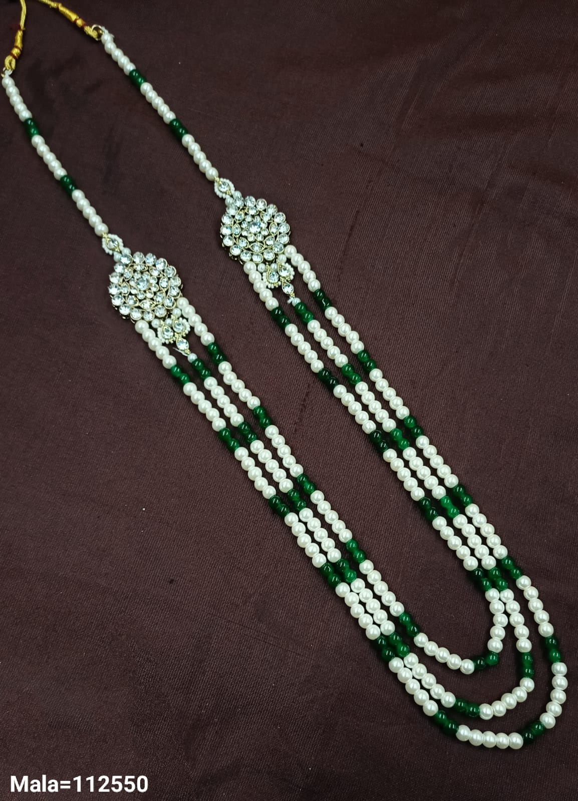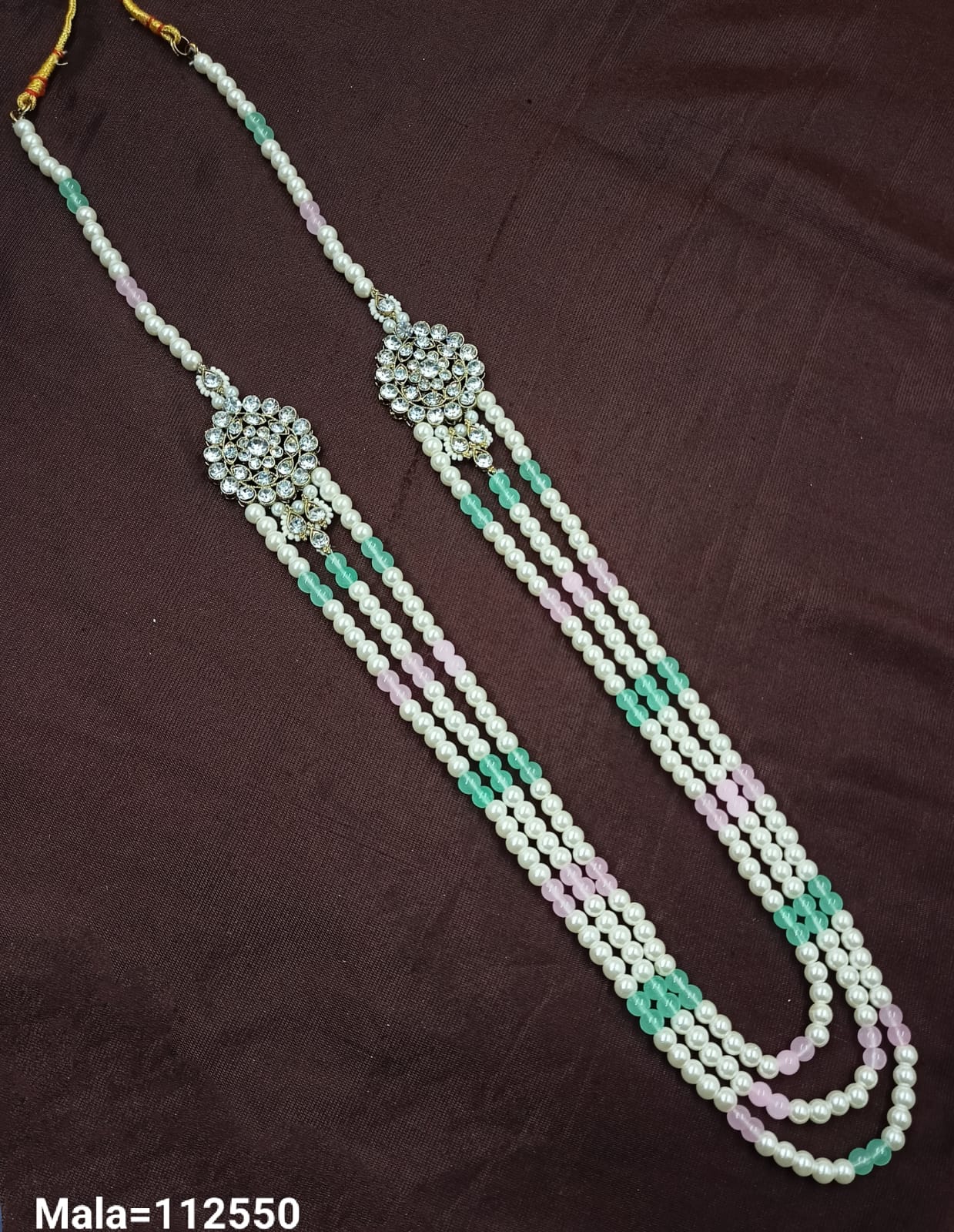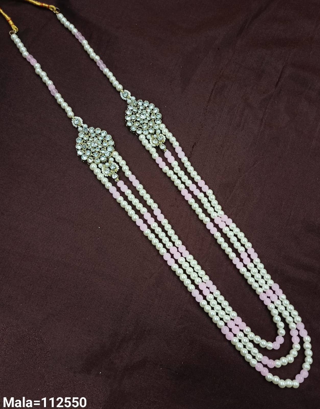 This elegant multi-strand beaded necklace features lustrous pearls interspersed with delicate beads and intricate stonework motifs. The design blends traditional craftsmanship with a contemporary aesthetic, making it perfect for both formal occasions and festive celebrations.