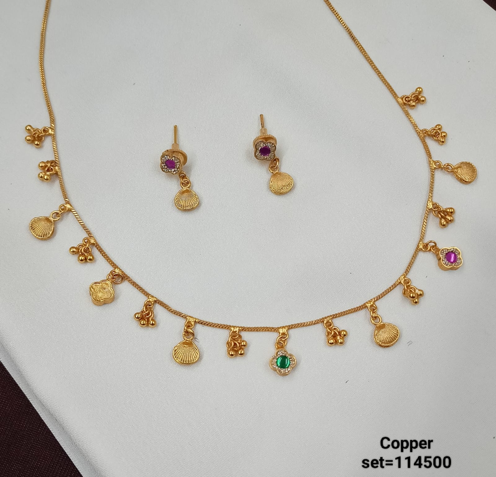This gold-plated traditional choker necklace set features intricate craftsmanship that highlights classic elegance. Paired with matching earrings, it offers a harmonious and sophisticated look perfect for cultural events and celebrations. The durable gold plating ensures lasting brilliance, making it a valuable addition to your jewellery collection.