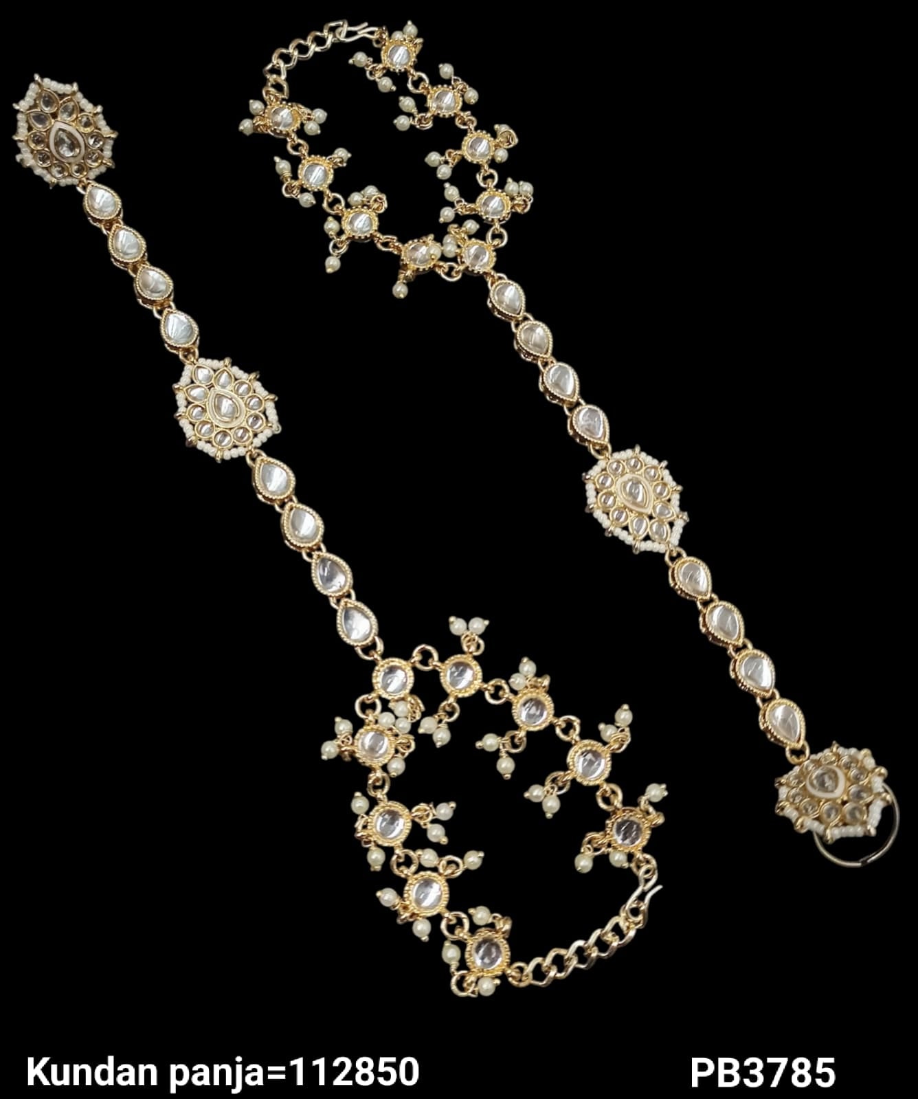 This exquisite set features a traditional Kundan Hathpanja design, elegantly finished with gold plating to enhance its classic appeal.