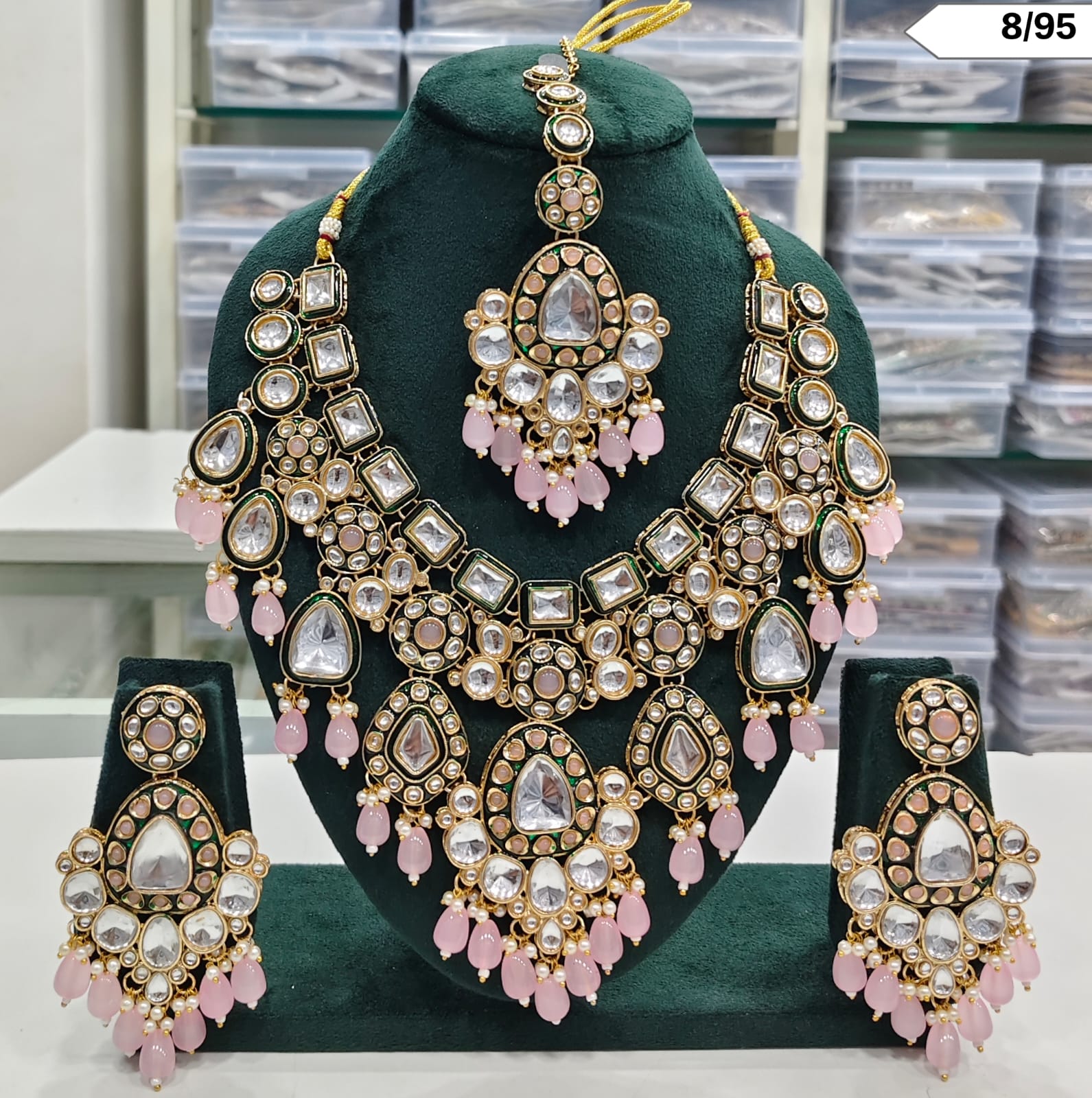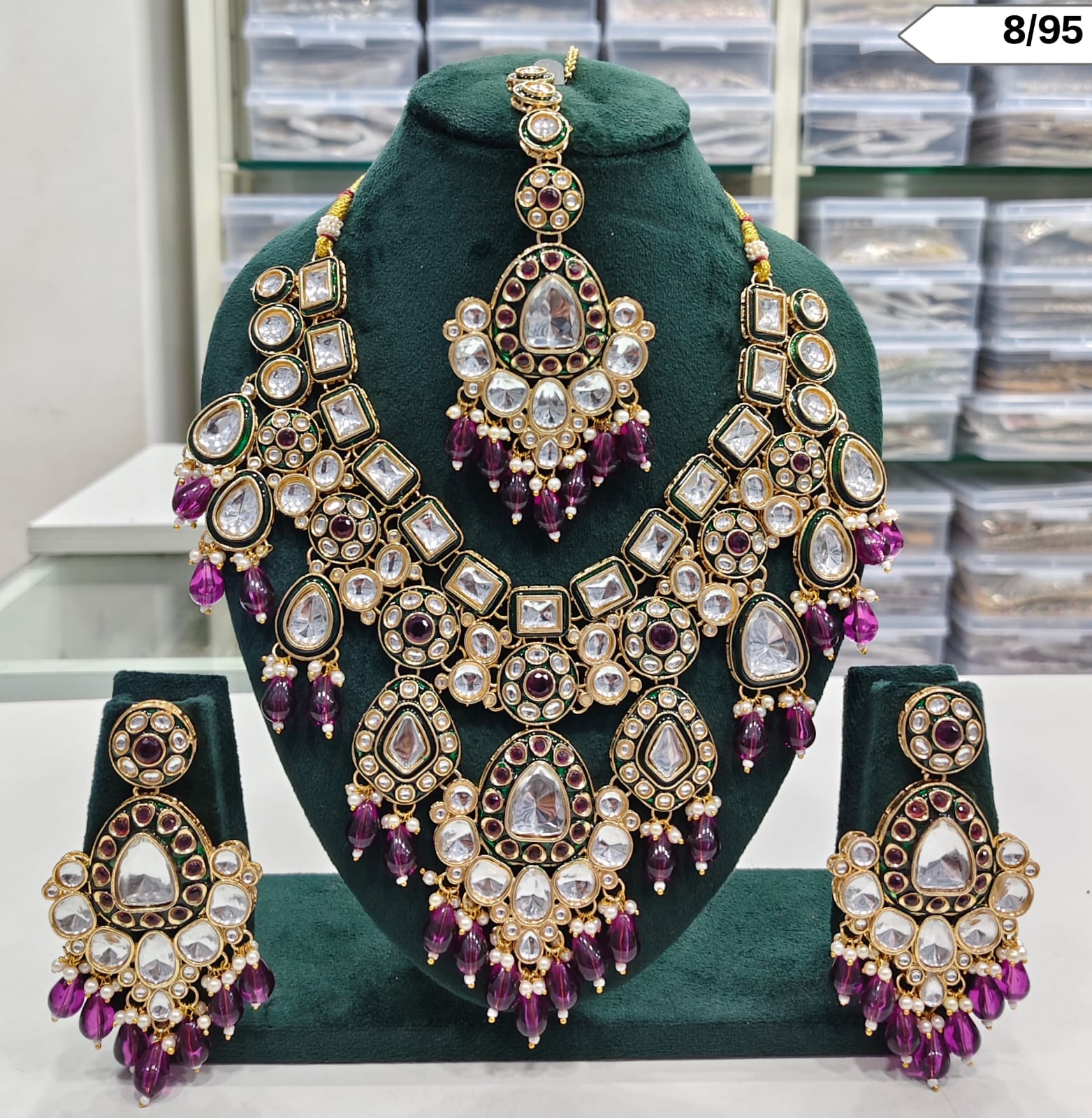 Elevate your bridal look with this Grand Bridal CZ Stone Necklace Set, crafted with premium quality materials and traditional artistry. This stunning set features an intricate arrangement of hand-set Pachi Kundan stones accented with delicate beads for a regal touch. Perfect for weddings, receptions, and grand celebrations, the set includes a statement necklace, matching earrings, and a maang tikka to complete your royal ensemble.