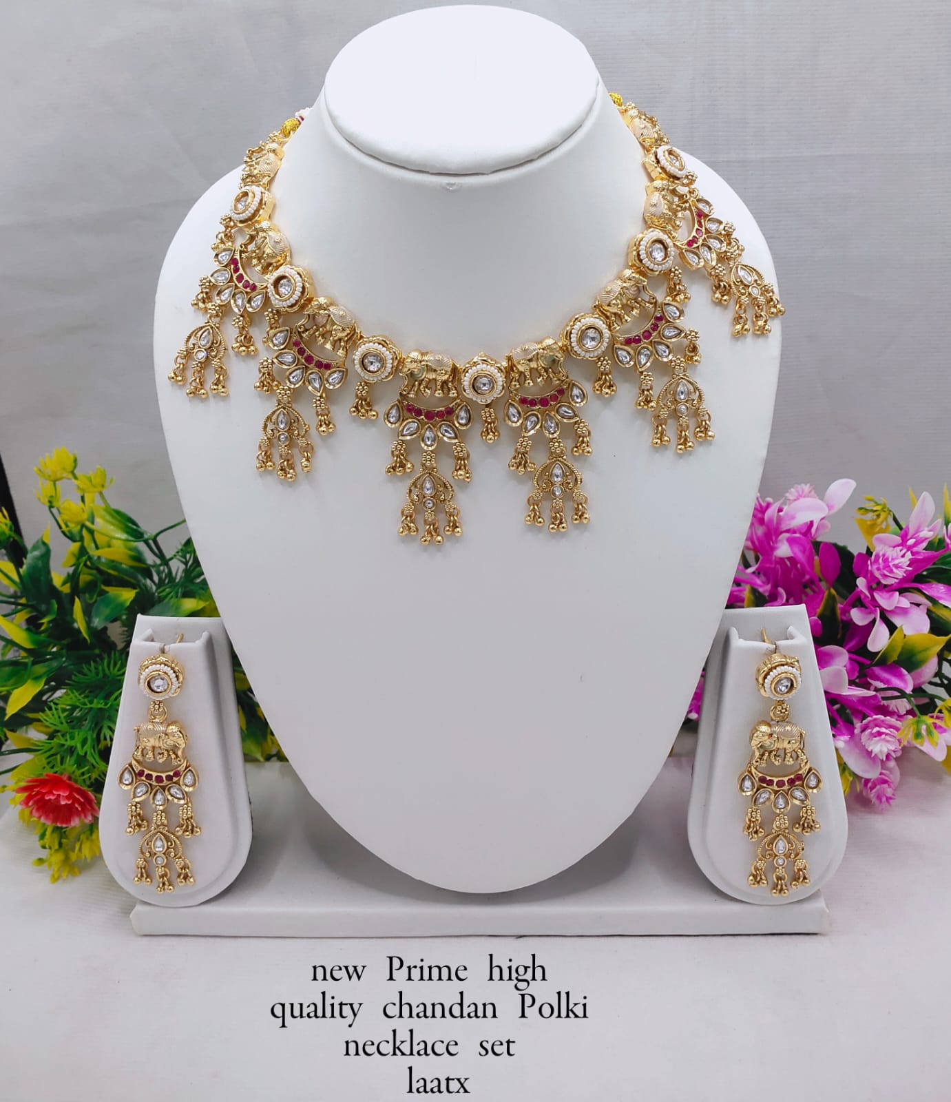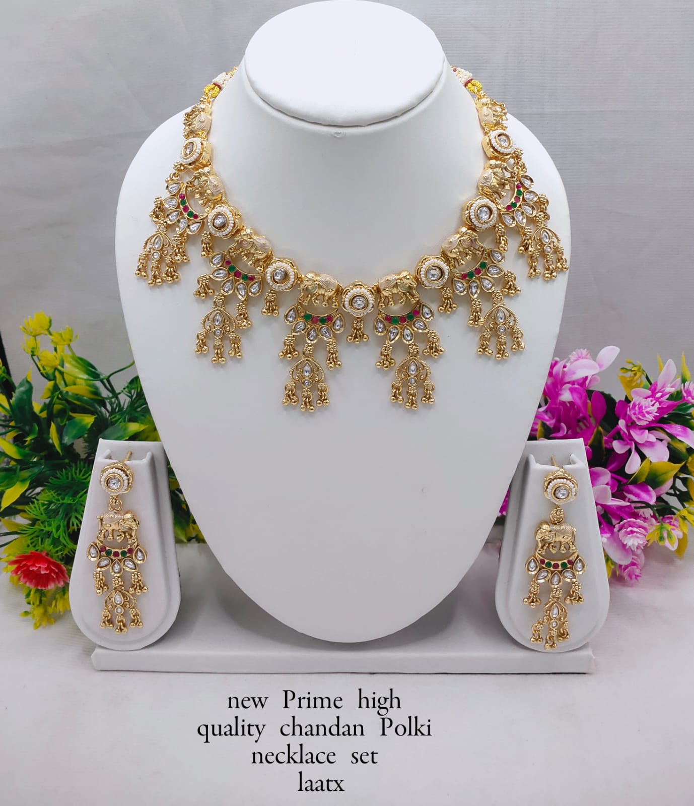 Elevate your traditional look with this exquisite Heavy Bridal Chandan Polki Necklace Set. Crafted with prime quality copper finish and adorned with intricate polki stones, this set features beautiful multi-jhumka motifs that add elegance and charm. Perfect for weddings, festivals, and special occasions, this necklace set brings together classic design and superior craftsmanship to complement any ethnic outfit.
