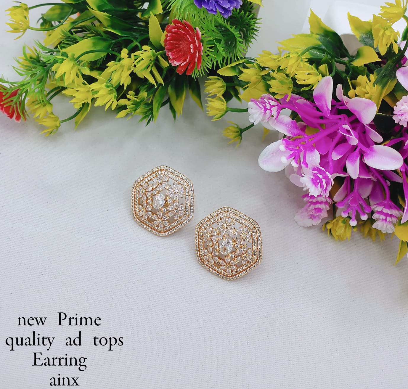 These Hexagon Floral American Diamond Stud Earrings feature an intricate floral motif set within a unique hexagon frame, offering a blend of modern elegance and traditional charm. The precisely cut American diamonds provide a brilliant sparkle, making them ideal for weddings, parties, or daily glam looks.