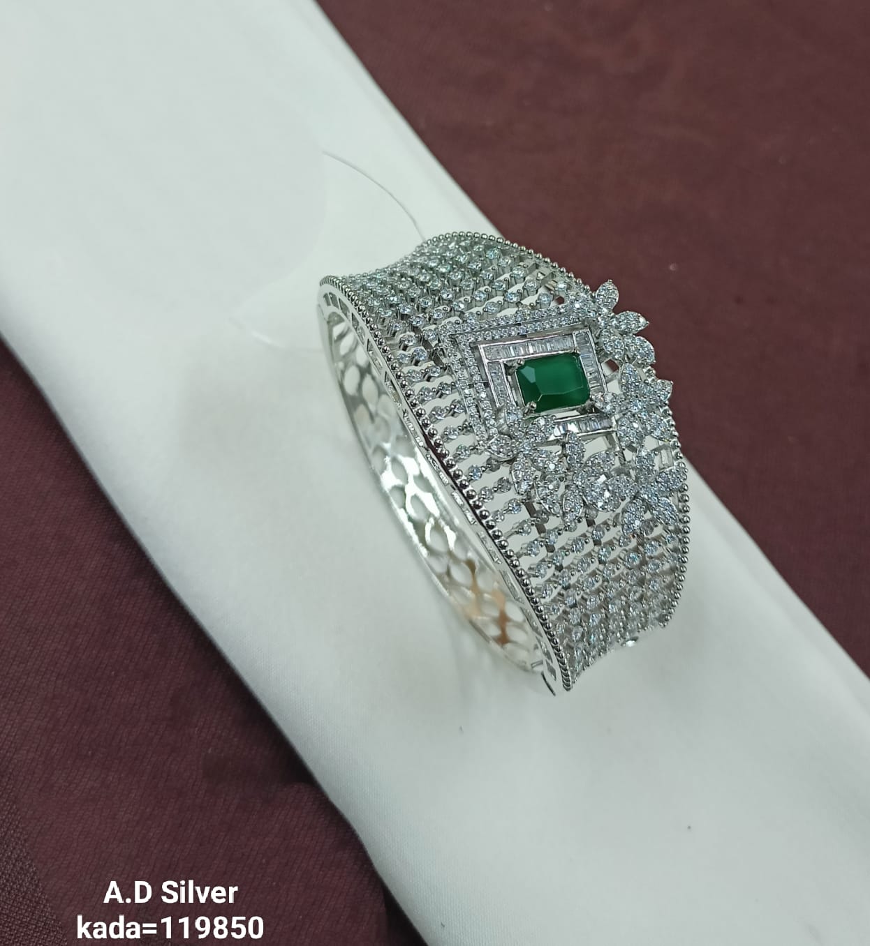 Make a bold and timeless statement with this exquisite A.D. Silver Bracelet, featuring a regal emerald-green center stone framed by intricate floral-inspired American Diamond (A.D.) detailing. The wide band design and high-polish silver finish give it a luxurious, royal look, perfect for weddings, festive events, or elegant evening wear.Crafted with precision and attention to detail, this bracelet beautifully balances classic charm with contemporary sophistication.