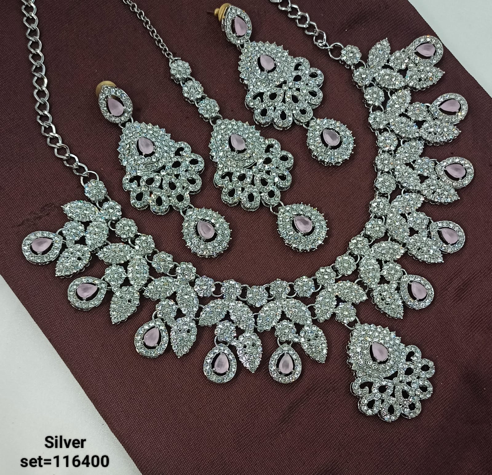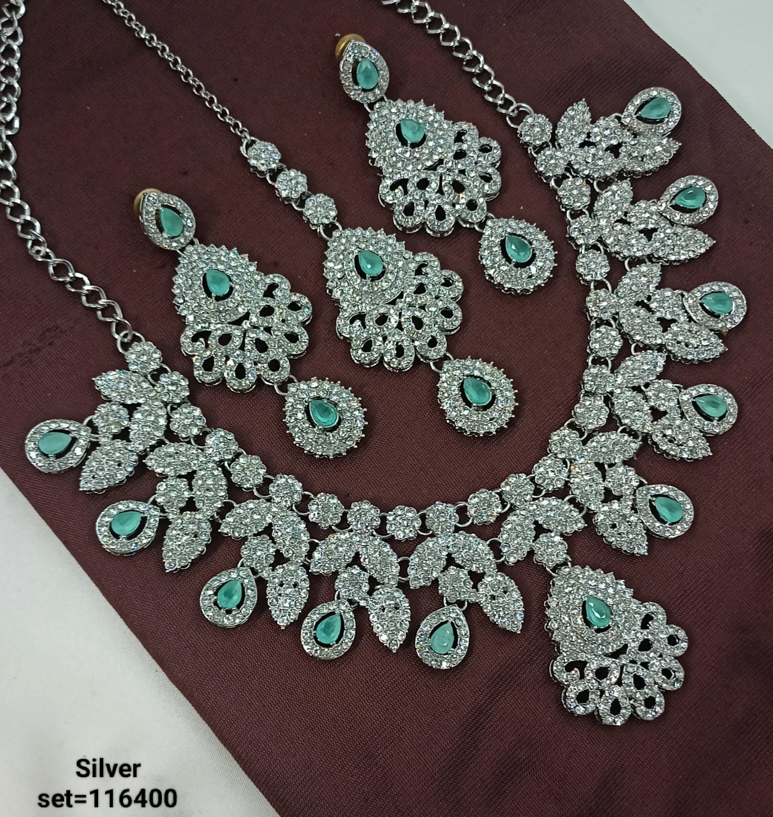 Radiate elegance with our Intricate Silver Necklace & Earrings Set, designed for those who appreciate fine detail and luxurious craftsmanship. This beautifully ornate set features a graceful arrangement of floral and teardrop motifs, encrusted with dazzling stones that capture the light with every movement. Whether worn by a bride or for a formal celebration, this statement set ensures a regal and refined appearance that stands out in any crowd.