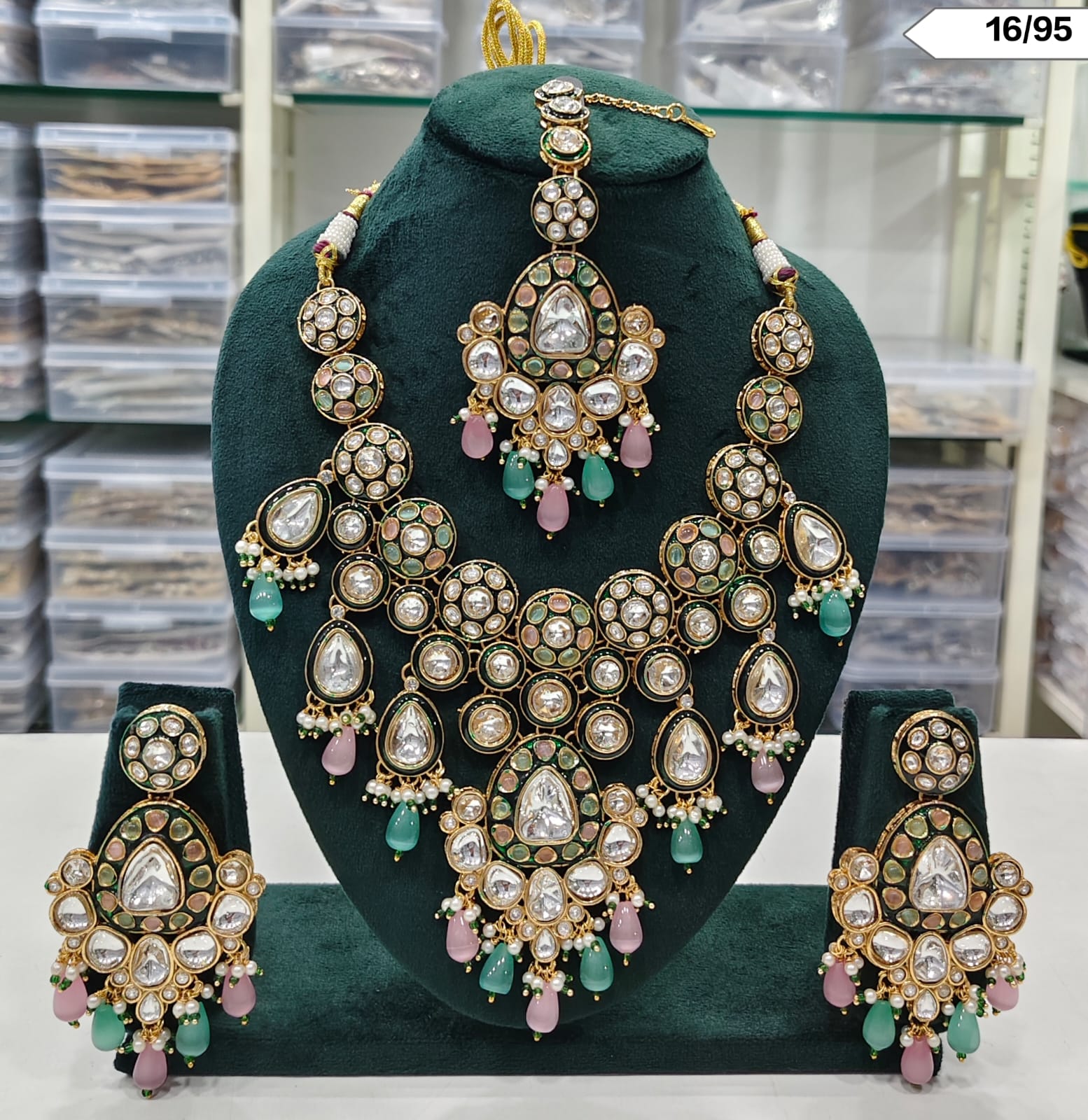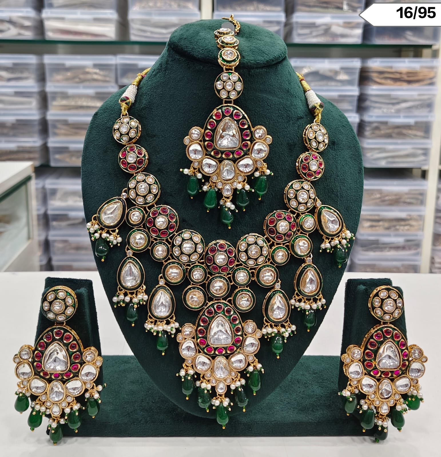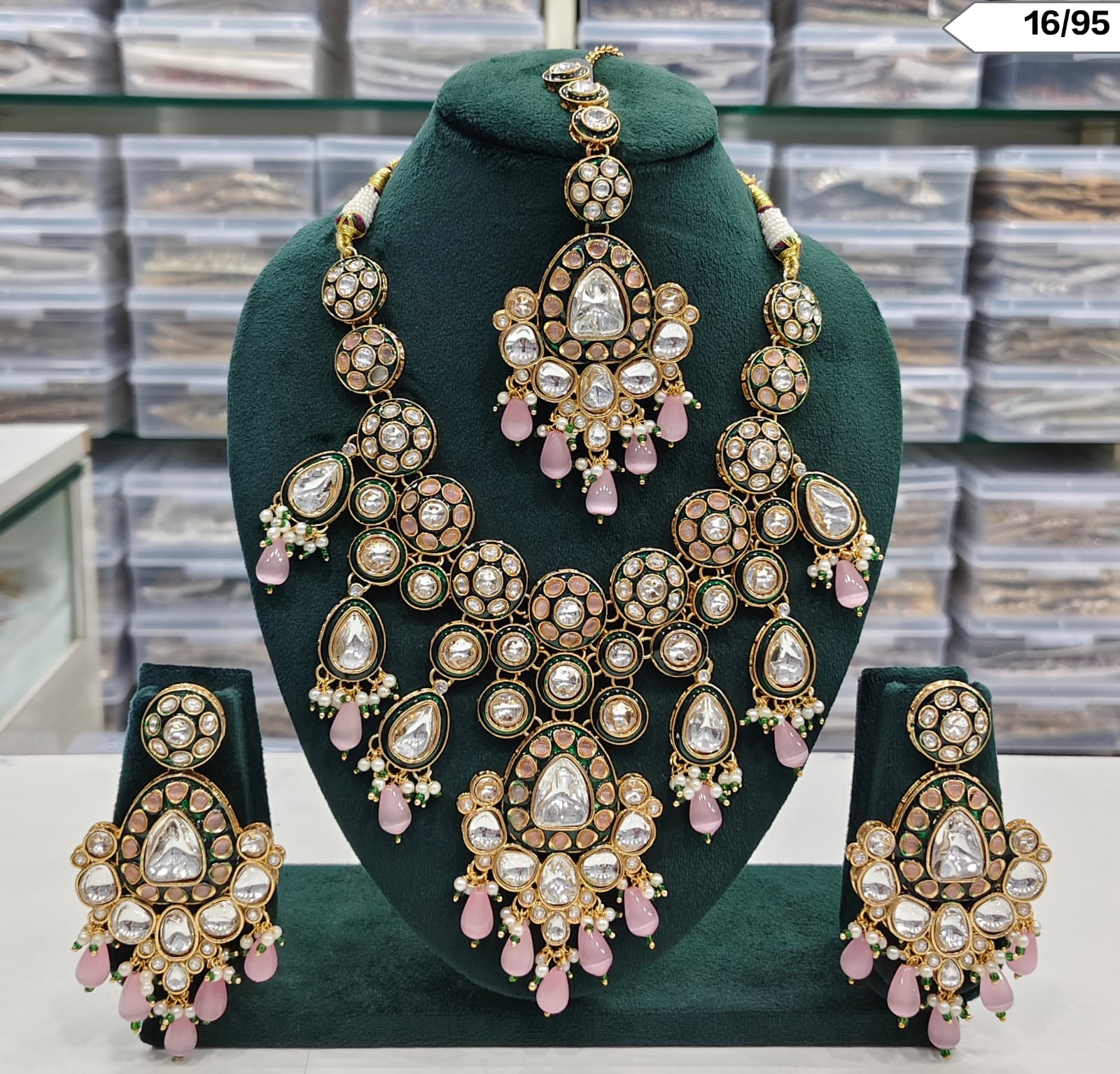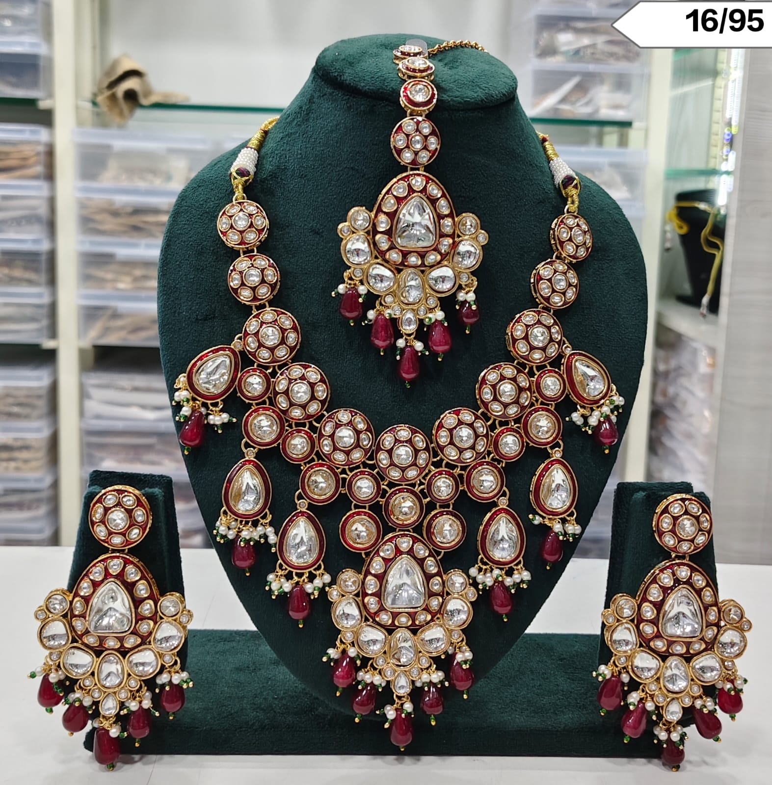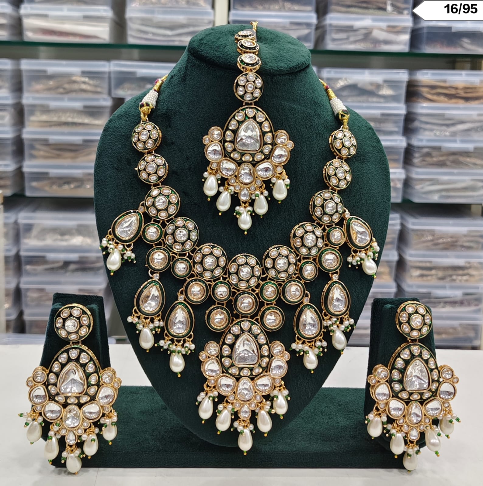 Elevate your bridal look with this exquisite Kundan Bridal Jewellery Set, complete with a matching Maang Tikka and statement earrings. Featuring high-quality Kundan stones, lustrous bead drops, and intricate gold plating, this set is designed to add regal elegance to your wedding or festive attire. Perfect for traditional occasions, it offers a luxurious finish that stands out in photos and in person.