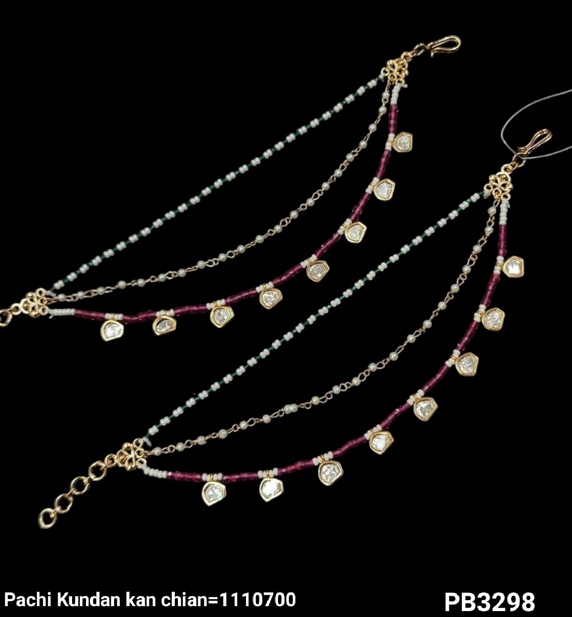 This set features long ear chains elegantly plated with gold and adorned with traditional Kundan craftsmanship.