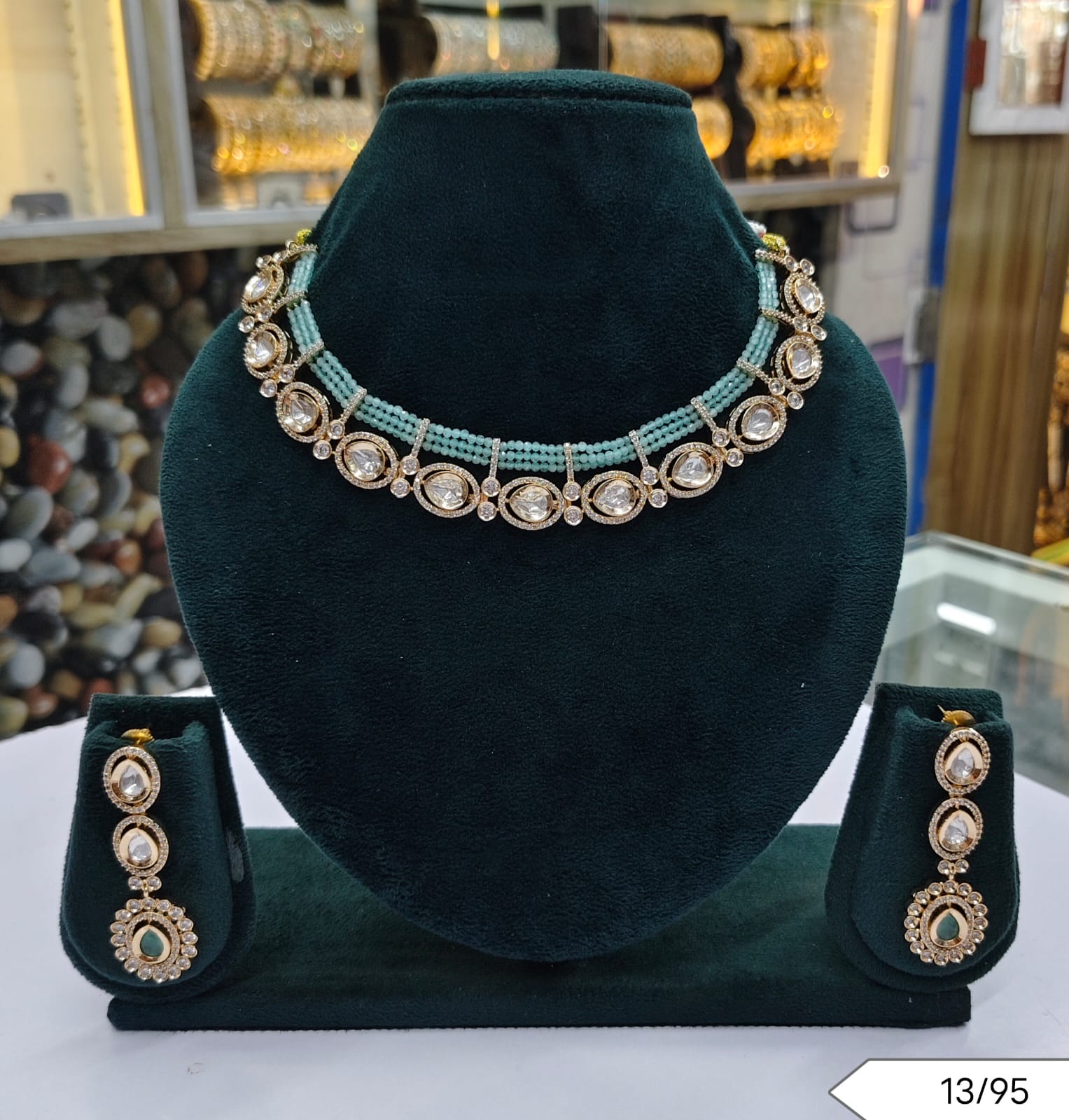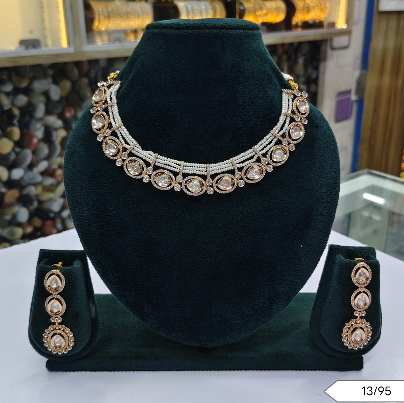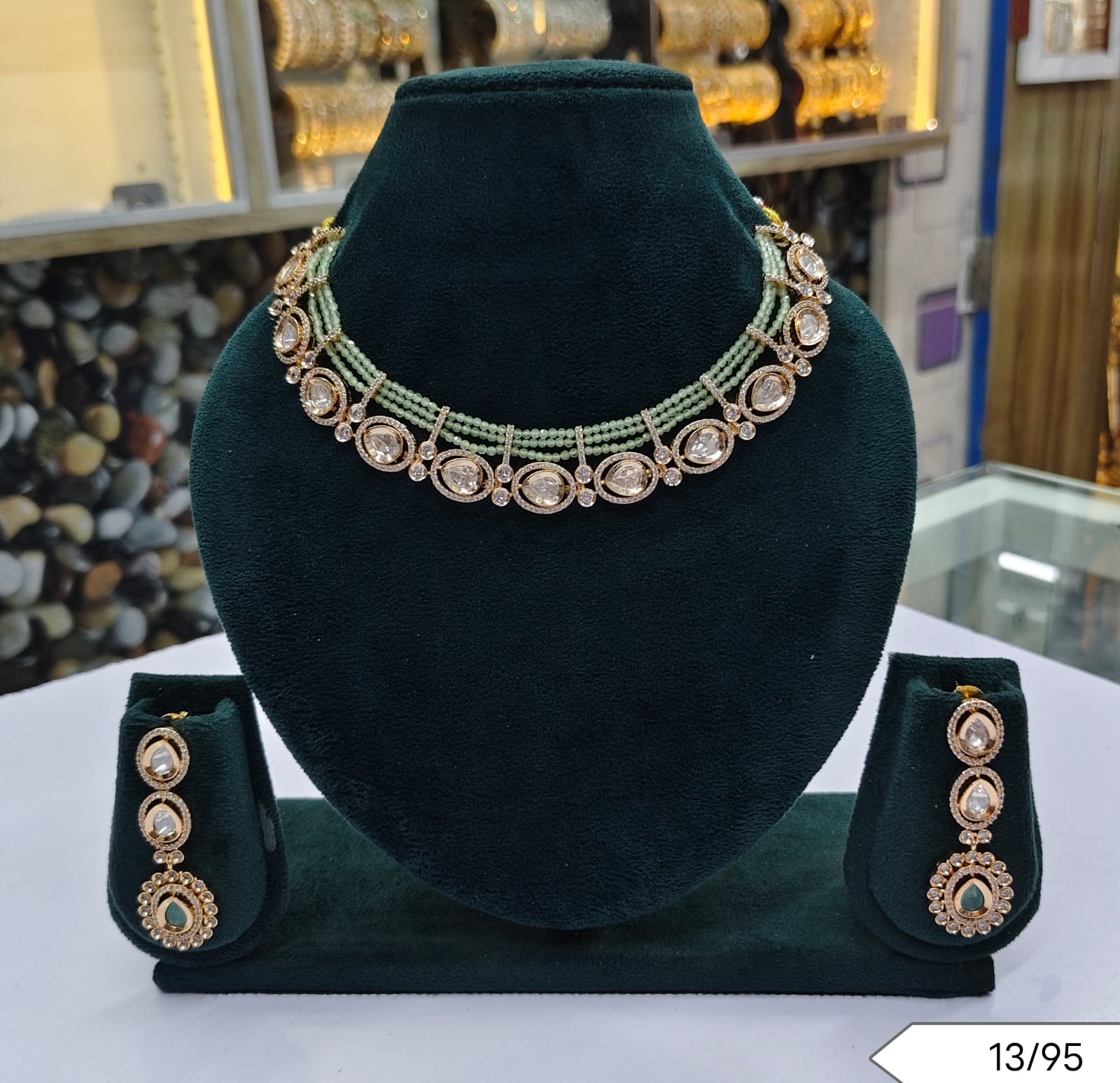 Make a regal statement with this Kundan Polki beaded necklace set, designed for elegance and grace. The necklace features beautifully arranged Polki stones framed in intricate detailing, complemented by multi-layer beads and matching drop earrings. Perfect for weddings, receptions, festive events, and parties, this jewellery set blends traditional artistry with modern sophistication. Lightweight and comfortable, it ensures you can shine effortlessly all day and night.