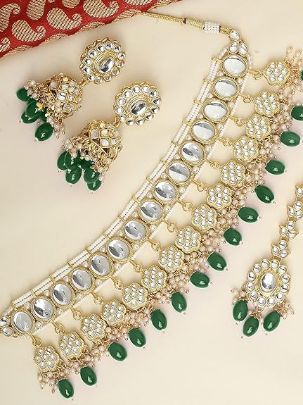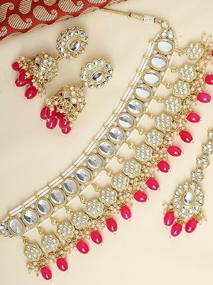 Expertly crafted with intricate details, this Kundan Stone Gold Plated Choker Jewellery Set is a stunning addition to any wardrobe. The vibrant kundan stones add a touch of elegance and opulence, while the gold plating provides a luxurious finish. Perfect for special occasions or adding a touch of glamour to everyday outfits.