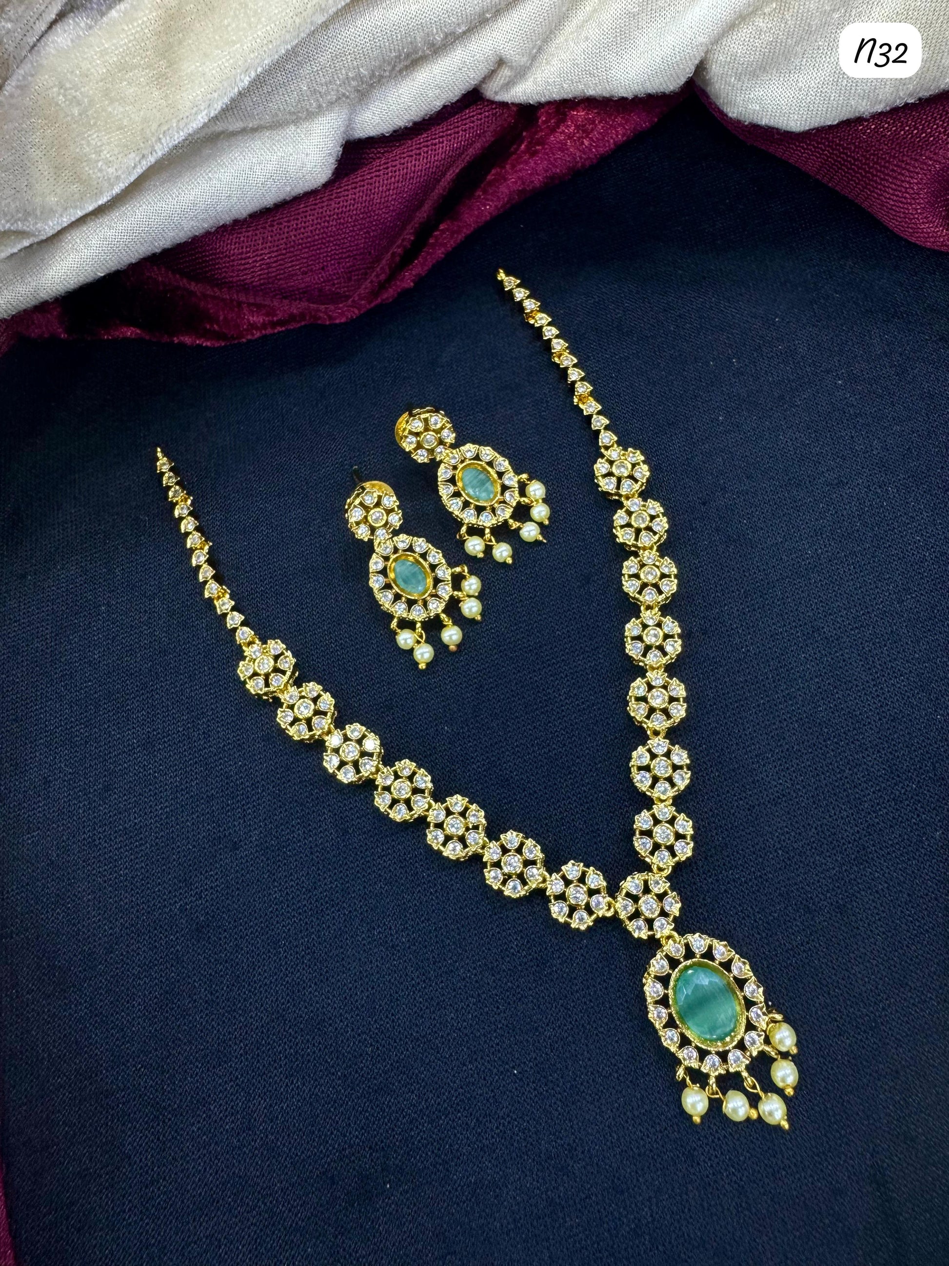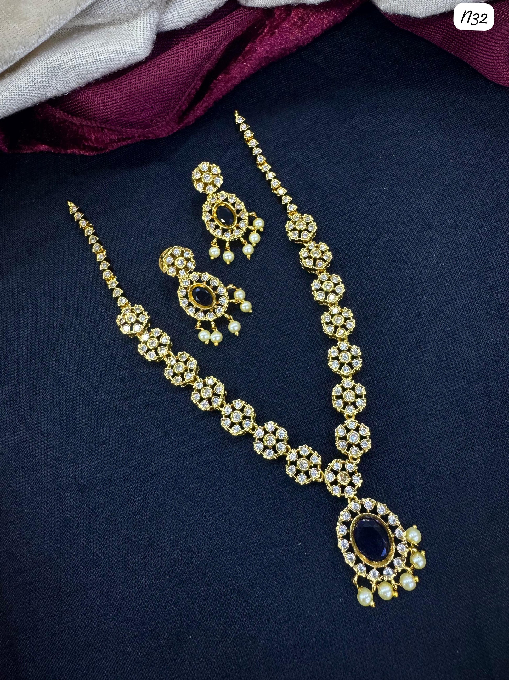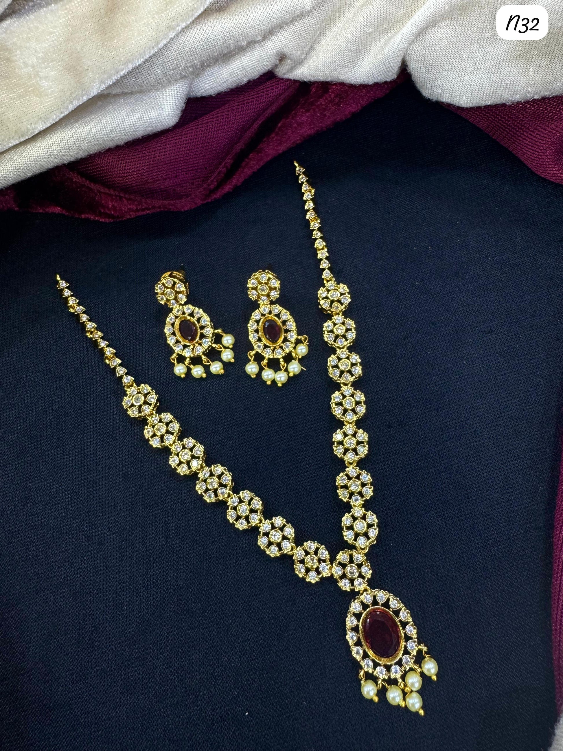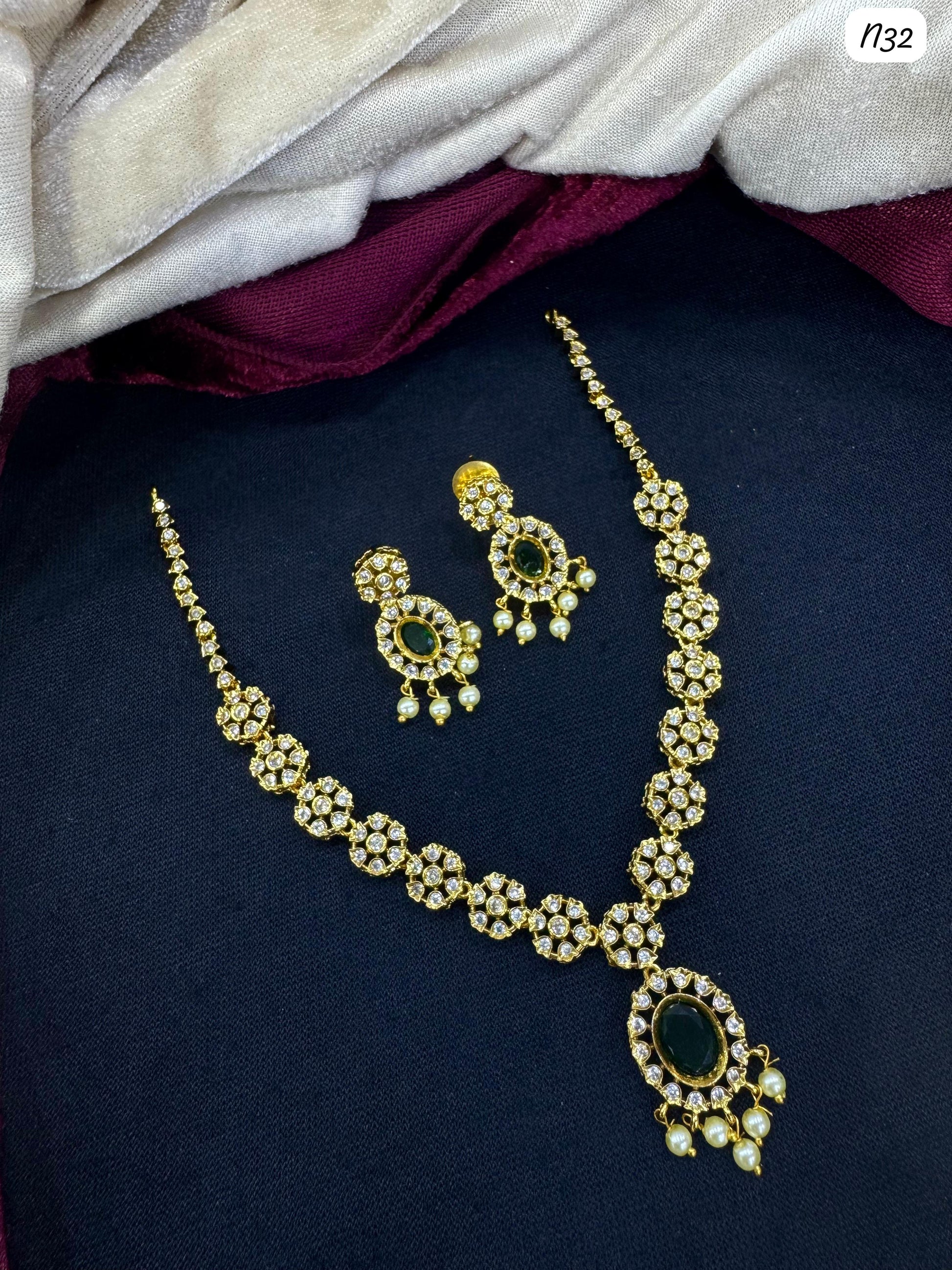 Grace your special occasions with this exquisite Kundan-style AD necklace and earring set. Designed with precision, it features a stunning arrangement of sparkling stones, a rich central accent, and delicate pearl drops that add a timeless charm. The traditional floral motif blends beautifully with modern craftsmanship, making it a perfect accessory for weddings, festive events, or elegant gatherings. Pair it with ethnic or fusion wear to complete your regal look.