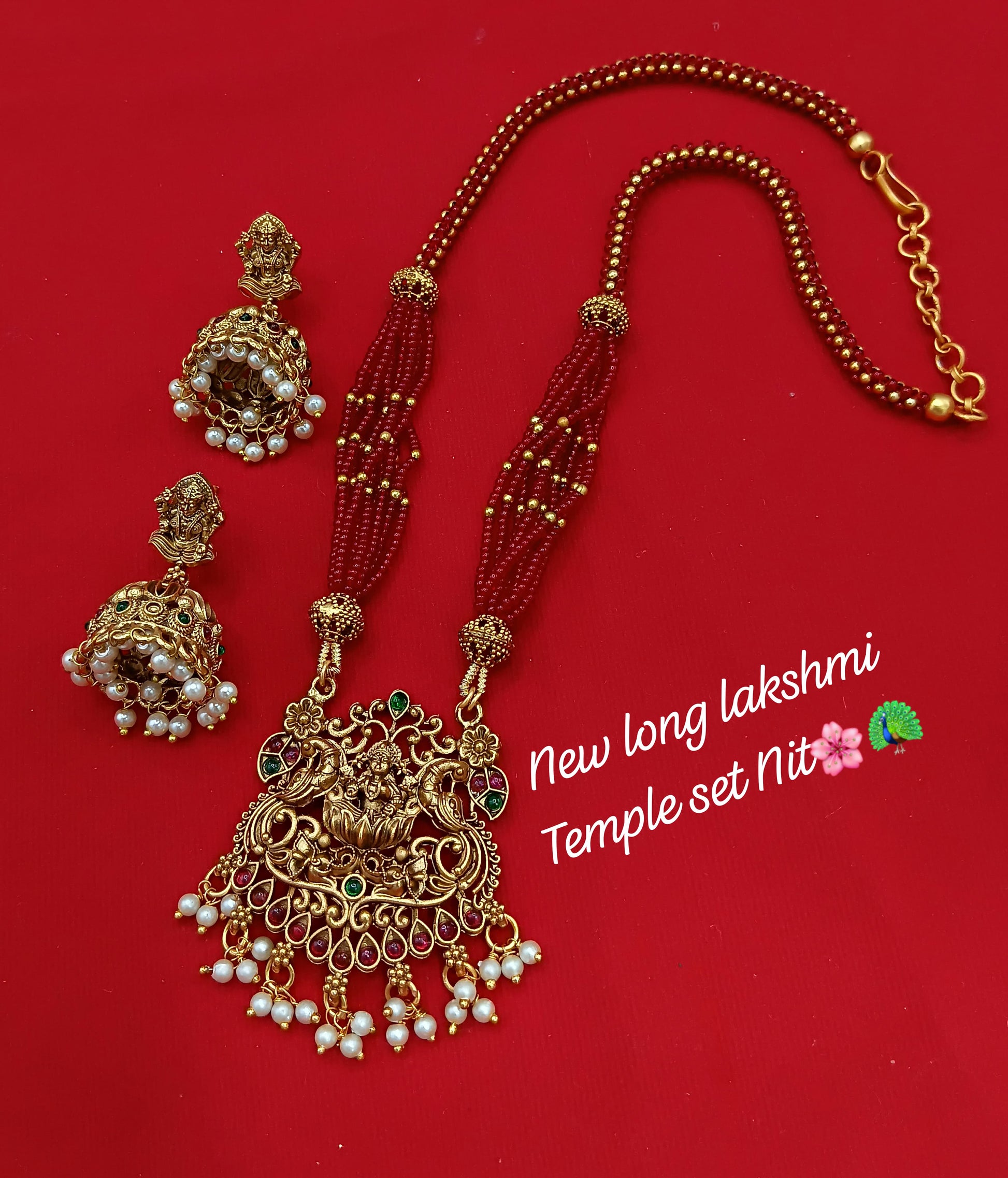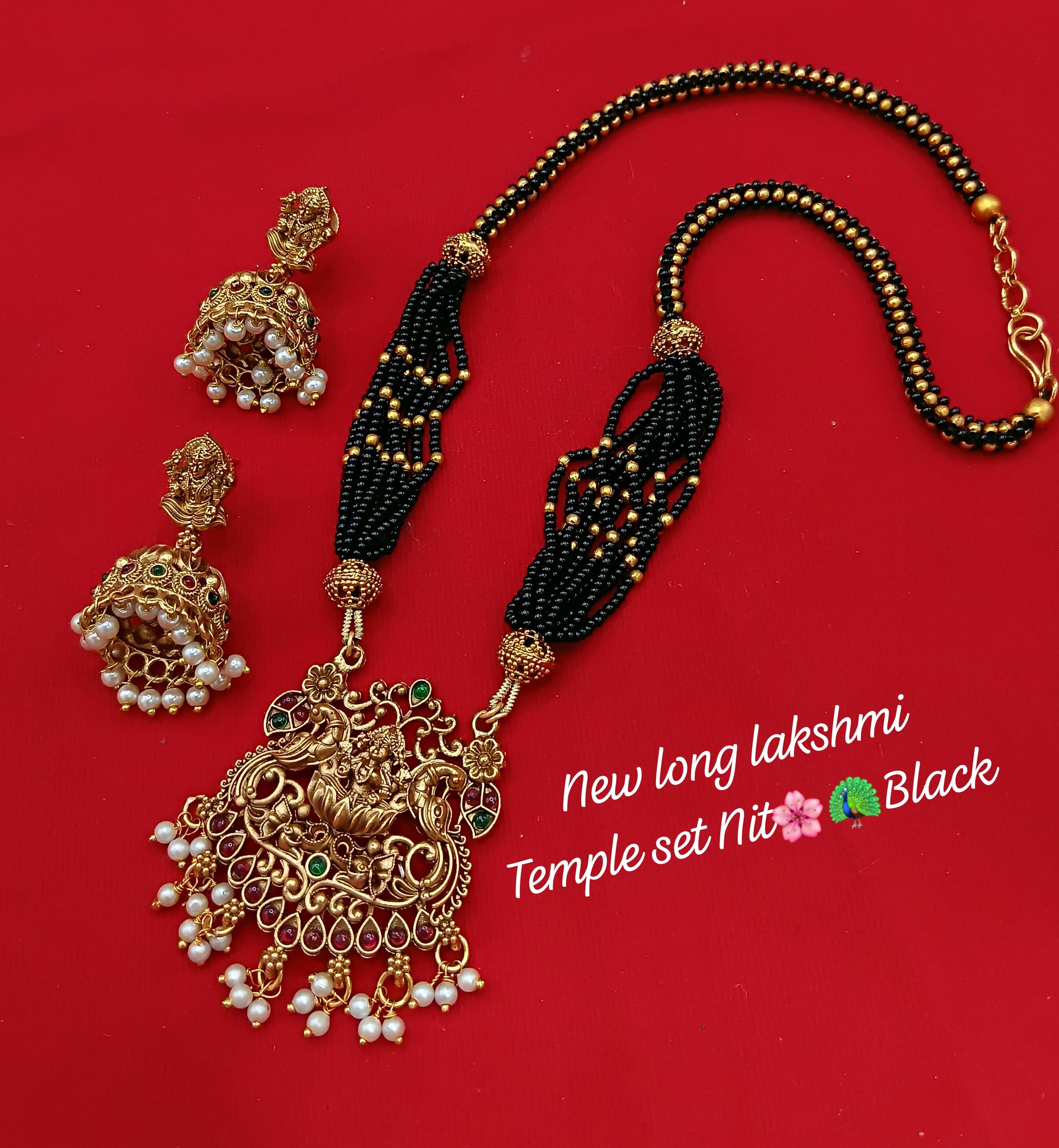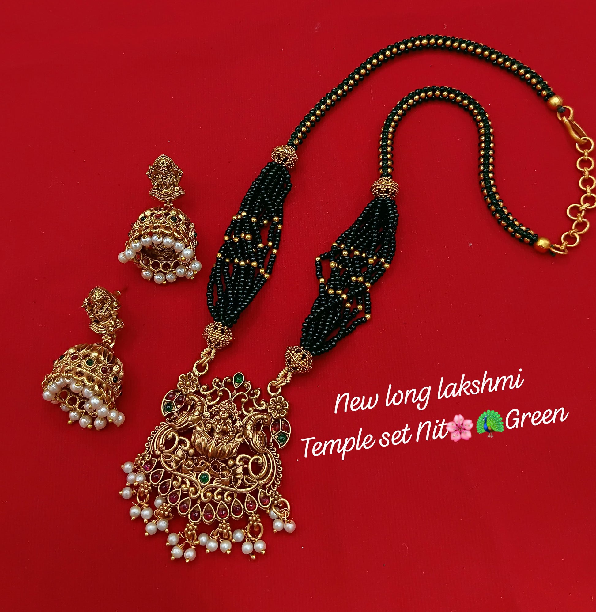 Embrace tradition and grace with this Long Lakshmi Temple Necklace Set, designed with an intricately crafted Lakshmi pendant symbolizing prosperity and blessings. The necklace is paired with matching temple-style jhumka earrings for a complete ethnic look. The unique long black-beaded chain enhances the temple jewellery charm, making it a perfect choice for weddings, festive occasions, and cultural celebrations. This set beautifully complements sarees, lehengas, and other traditional outfits, adding a regal and divine touch to your style.