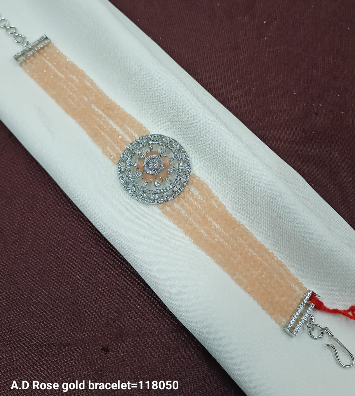 Elevate your style with this exquisite Rose Gold Multi-Strand Bracelet, designed to add a touch of elegance and sophistication to any outfit. Featuring Seven delicate strands of shimmering rose gold beads, this bracelet is beautifully accented with a dazzling diamond-encrusted centerpiece that catches the light from every angle. Perfect for both everyday wear and special occasions, this bracelet effortlessly combines modern design with timeless charm. Adjustable clasp ensures a comfortable fit for any wrist size.