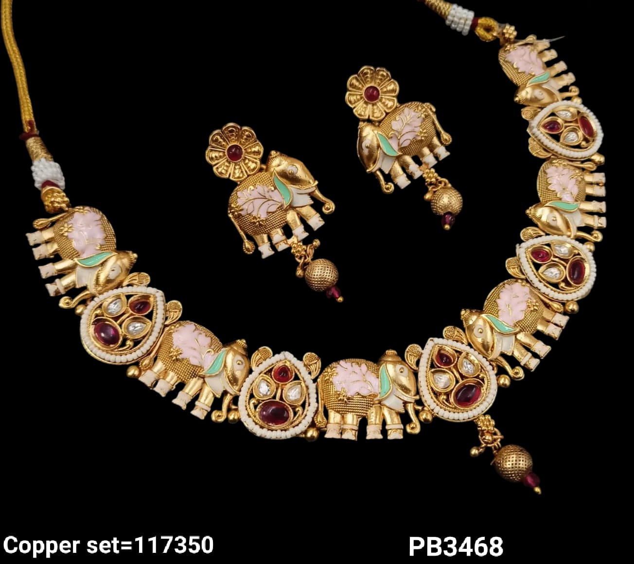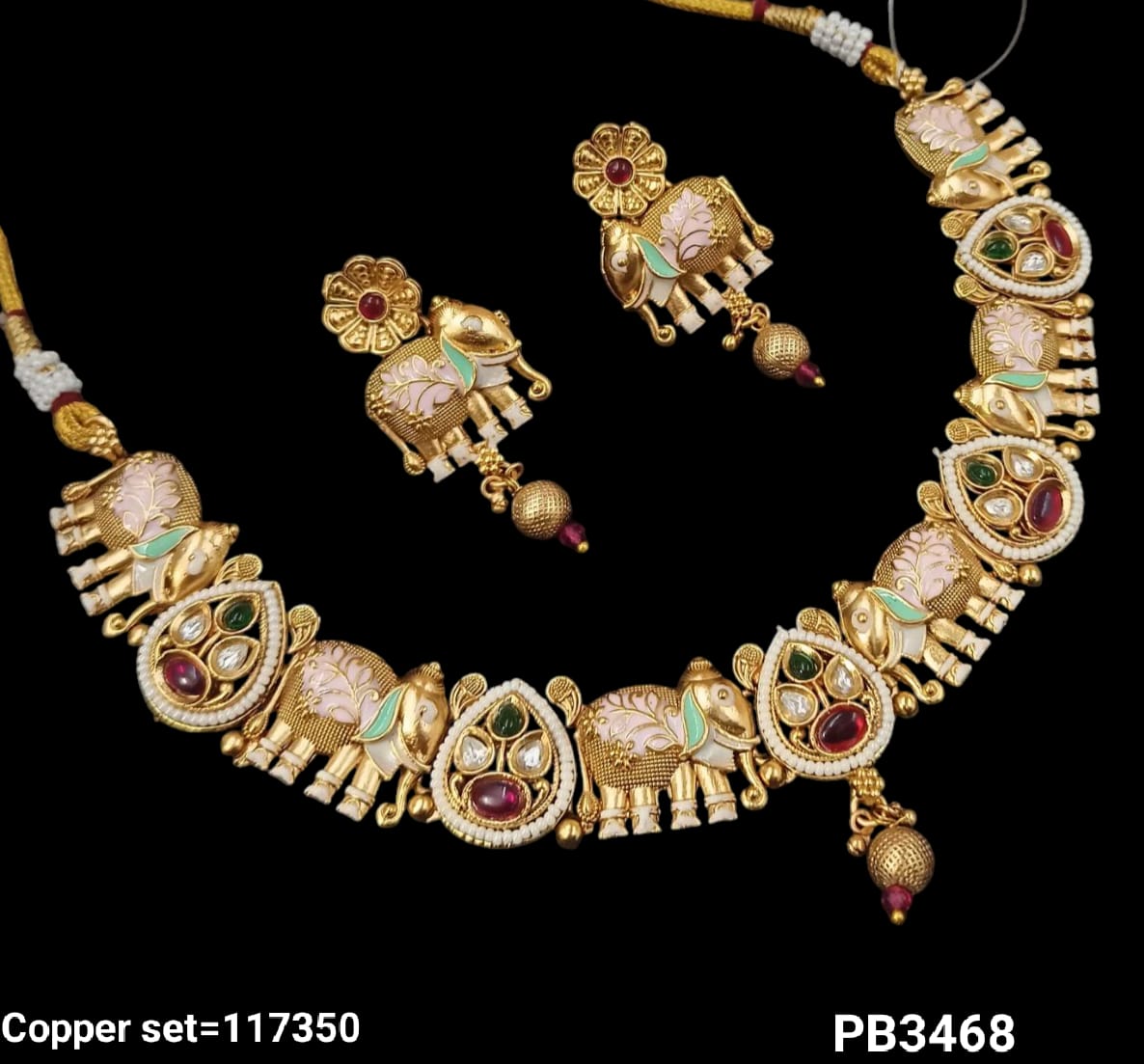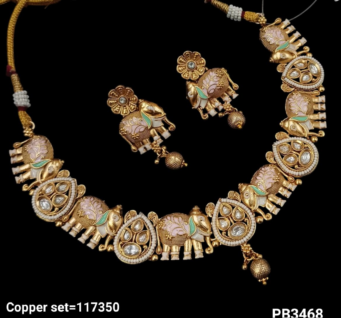 The Minakaari necklace set is crafted from copper and enhanced with a refined gold plating, reflecting expert artistry and classic design.