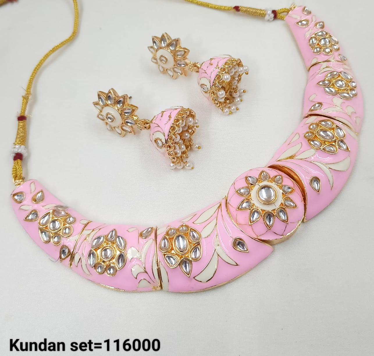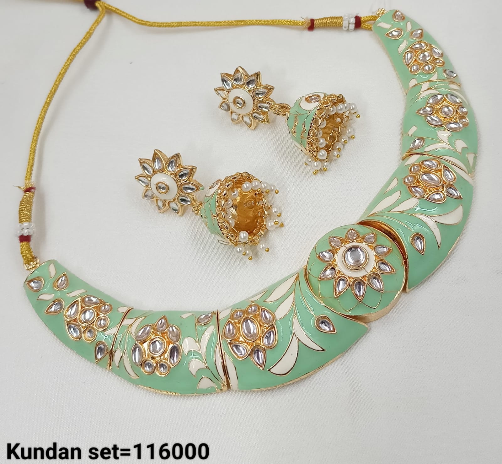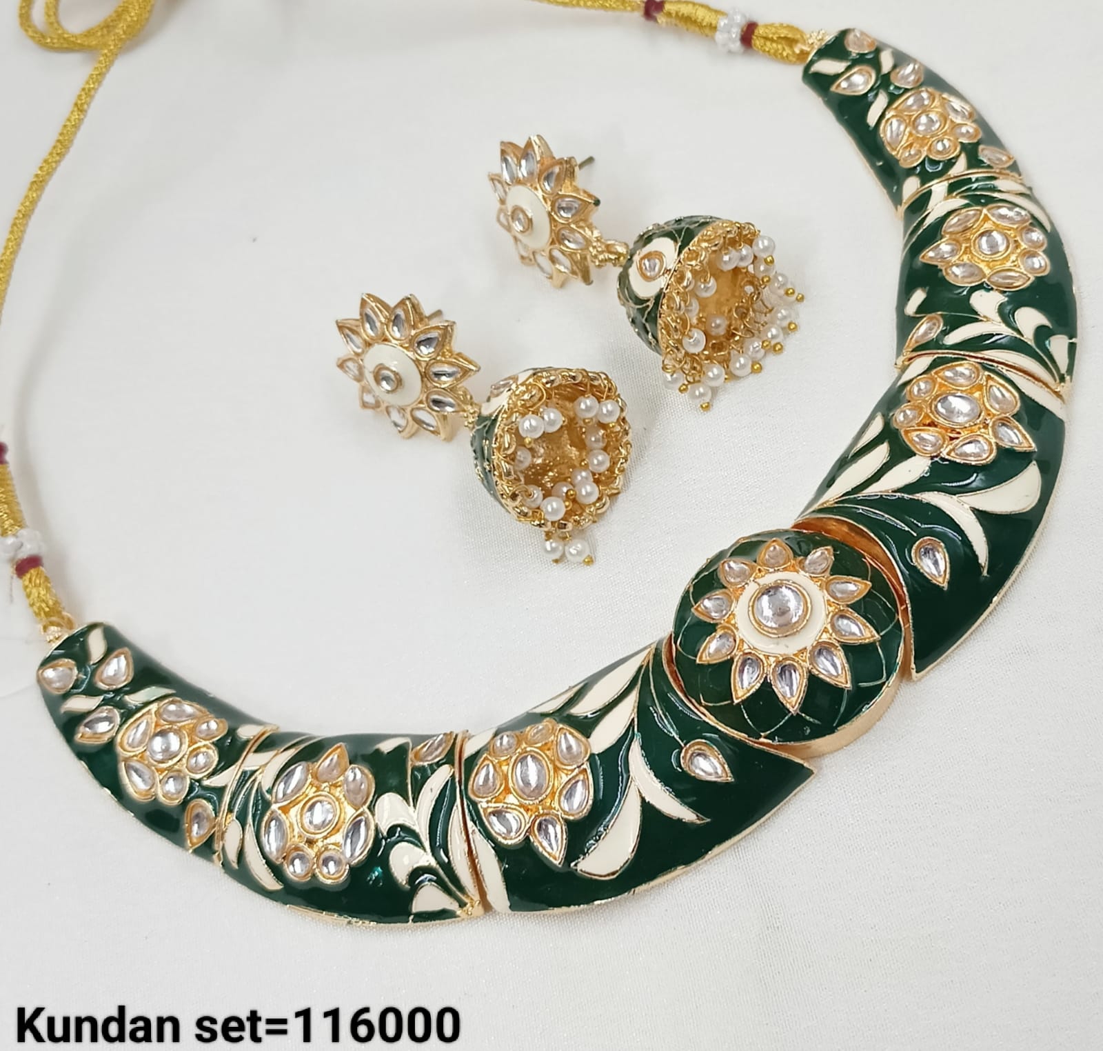 This exquisite jewellery set features gold plating combined with intricate Minakaari and Kundan craftsmanship, showcasing a refined blend of traditional artistry and elegant design.