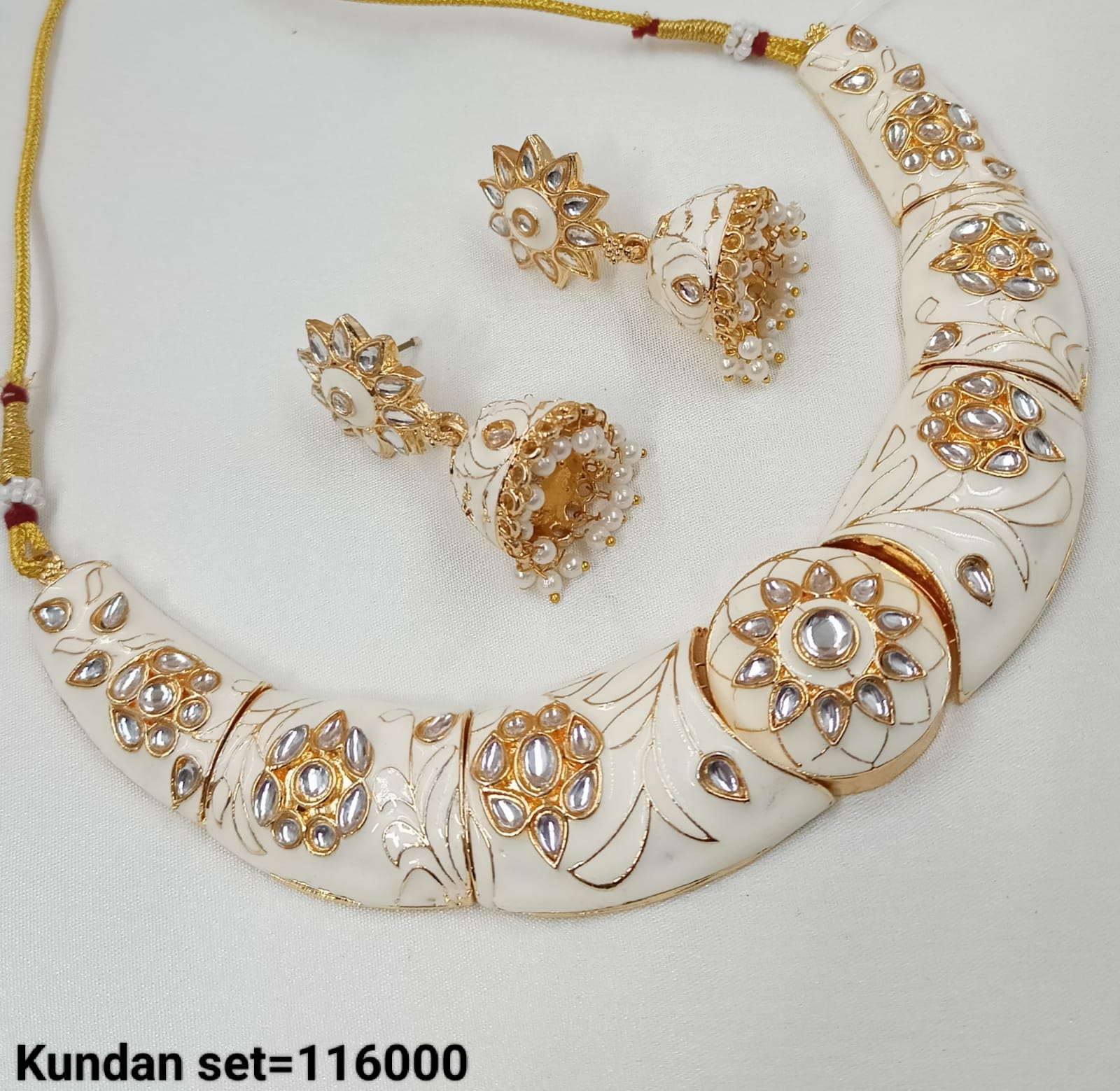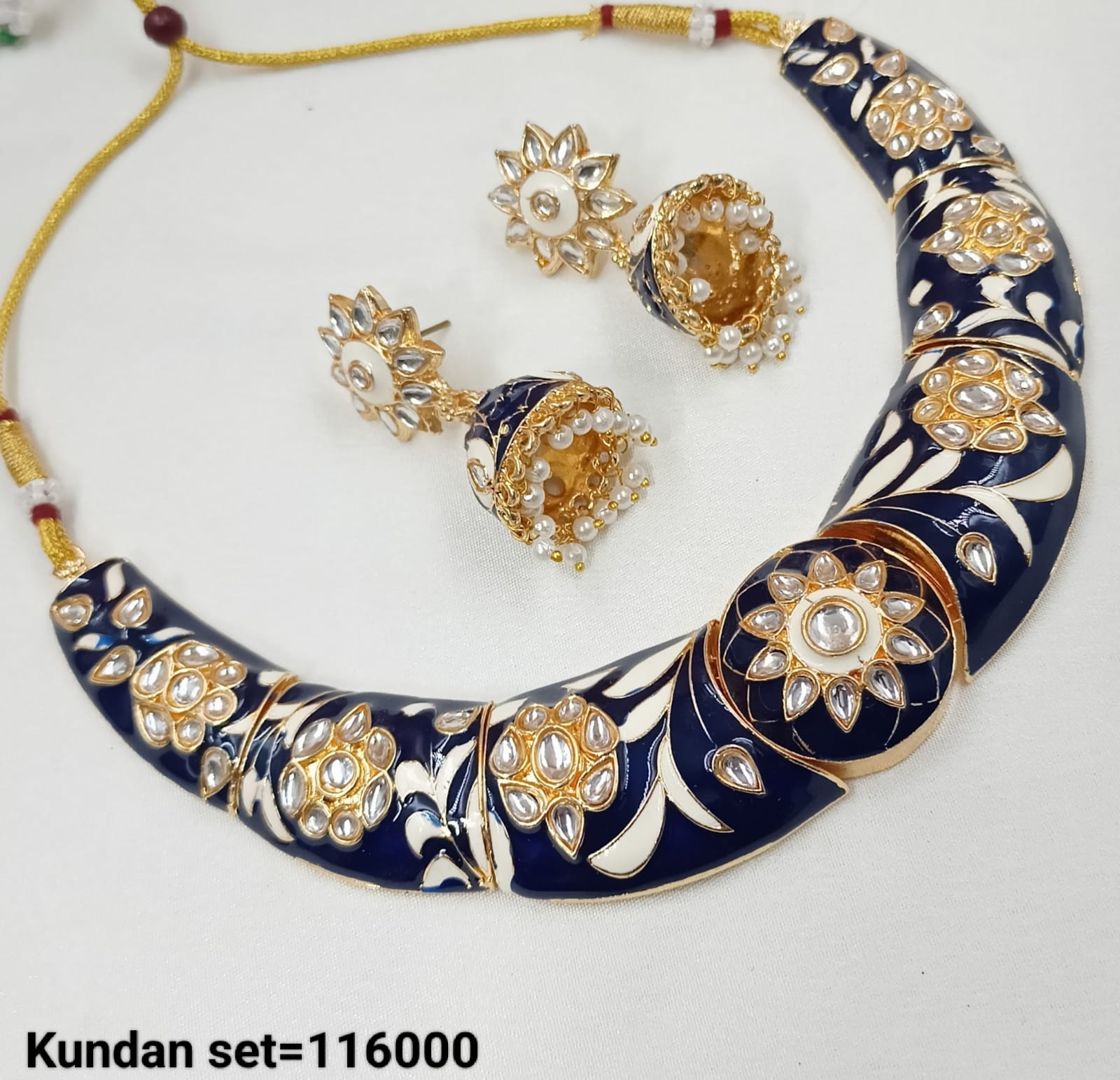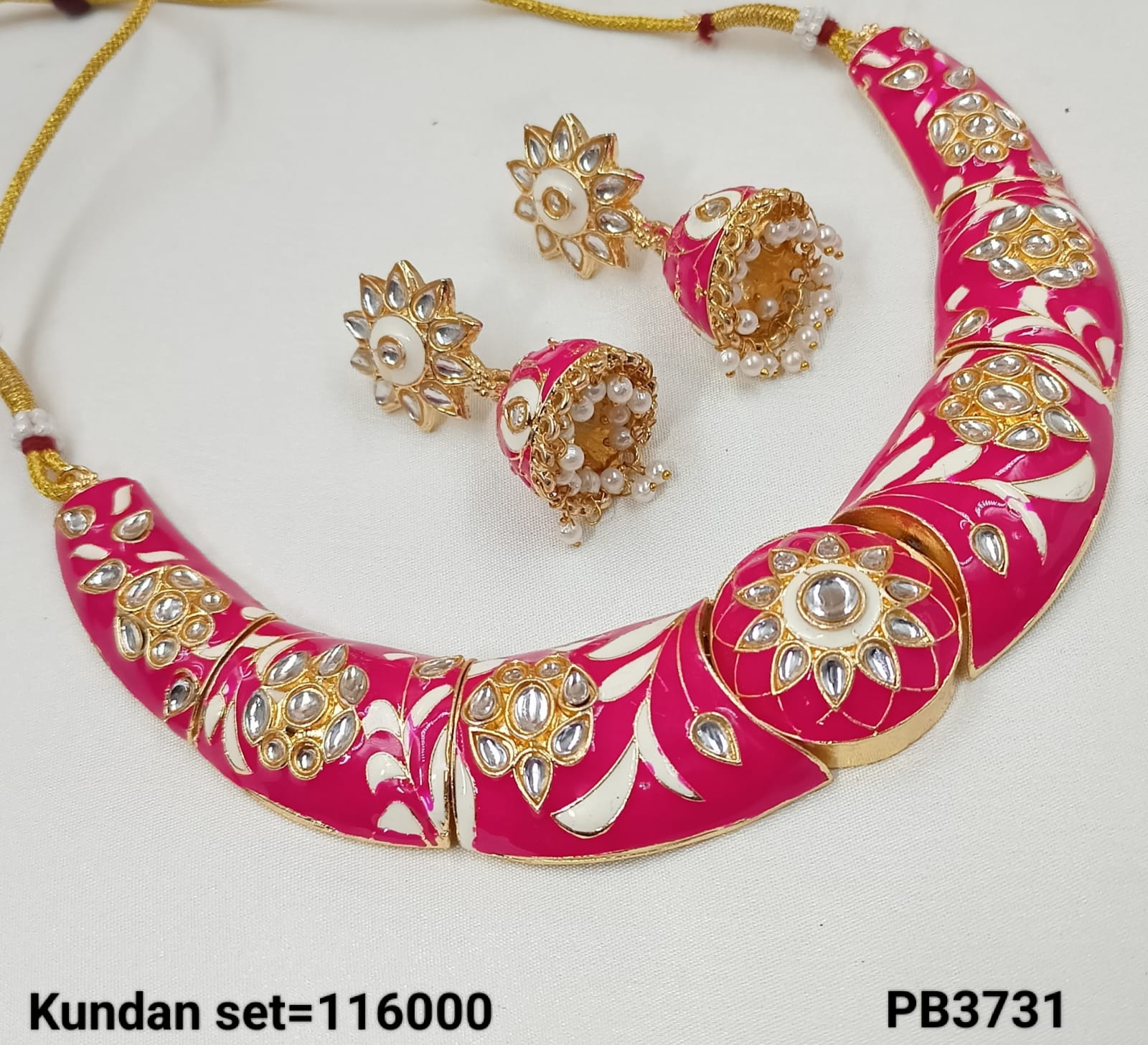 This exquisite jewellery set features gold plating combined with intricate Minakaari and Kundan craftsmanship, showcasing a refined blend of traditional artistry and elegant design.