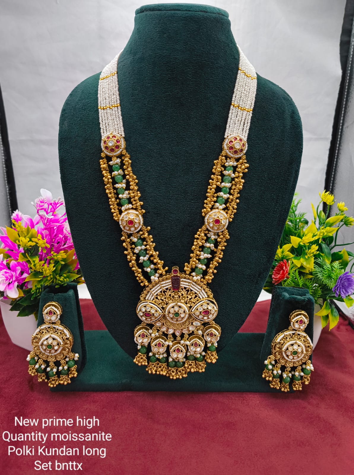 Material: High-quality moissanite, Polki Kundan stones with pearl and green bead detailing