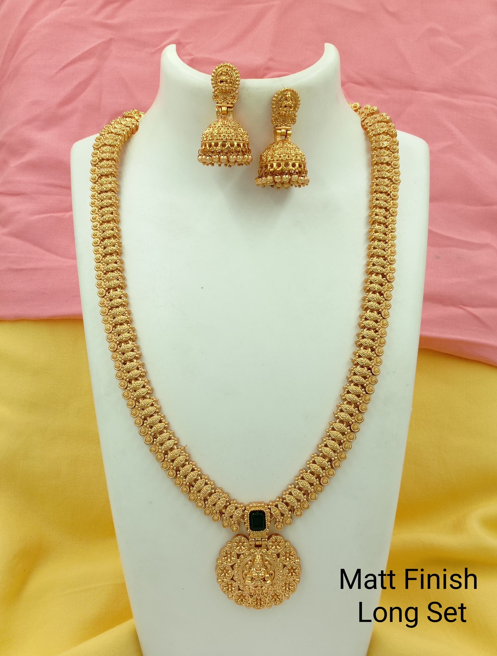 New Ethnic Gold Plated Darkgreen Studded Kundan Laxami Temple Long Necklace With Beautiful Jhumkhi Earring Jewellery Set For Women And Girls