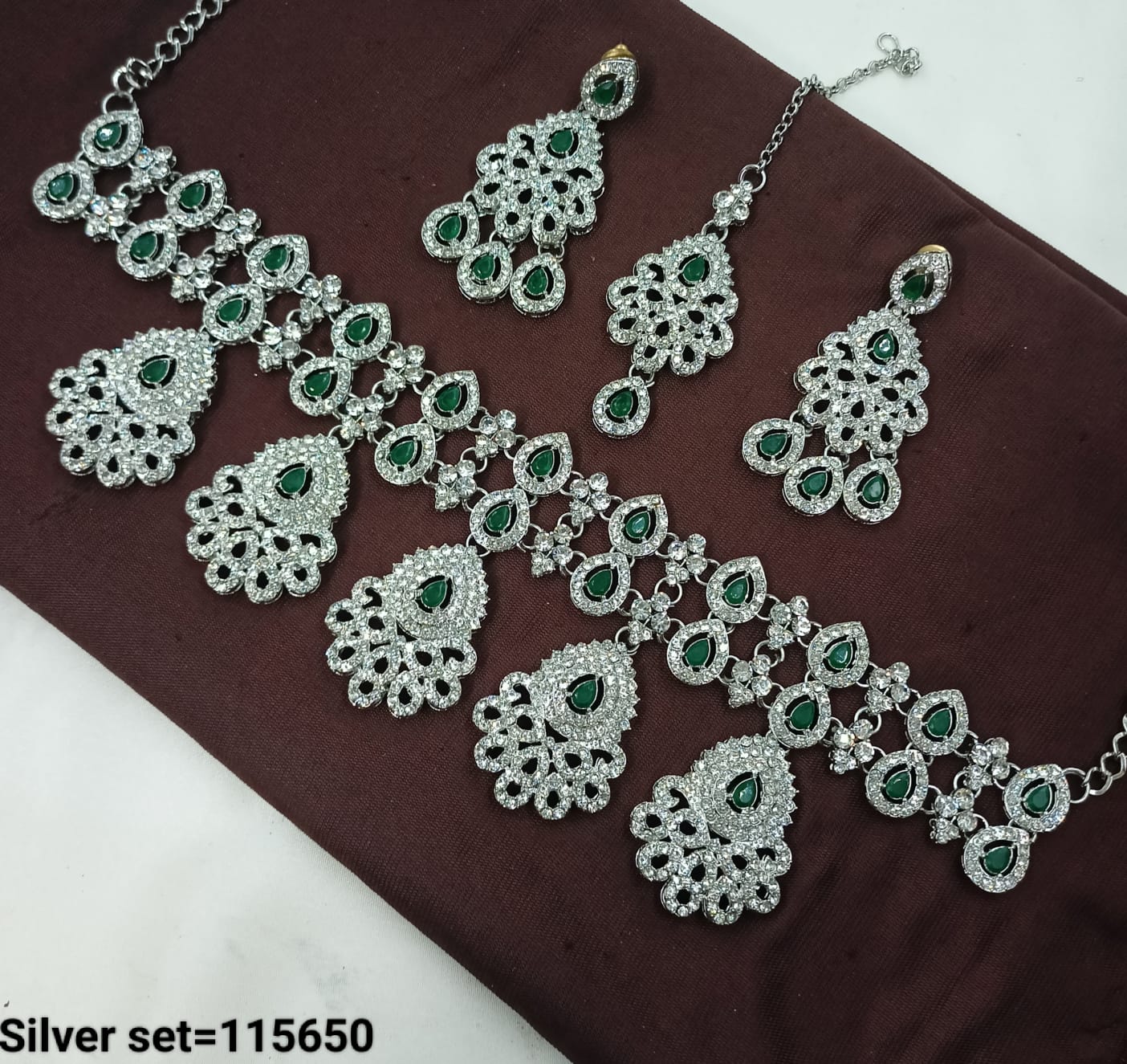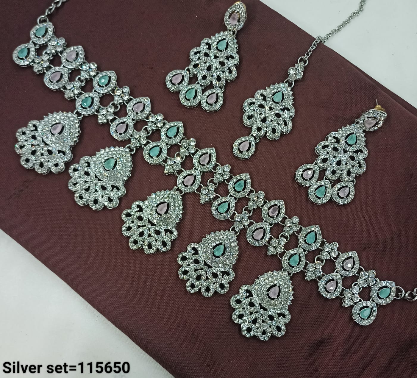 Step into the spotlight with our Ornate Silver Necklace & Earrings Set, a captivating ensemble designed for the modern bride and fashion-forward celebrant. This intricately crafted set features an elegant cascade of teardrop and filigree patterns, expertly embellished with sparkling stones. The balance of traditional craftsmanship with contemporary flair makes this set perfect for weddings, festive occasions, and special events where you want to make a grand impression.
