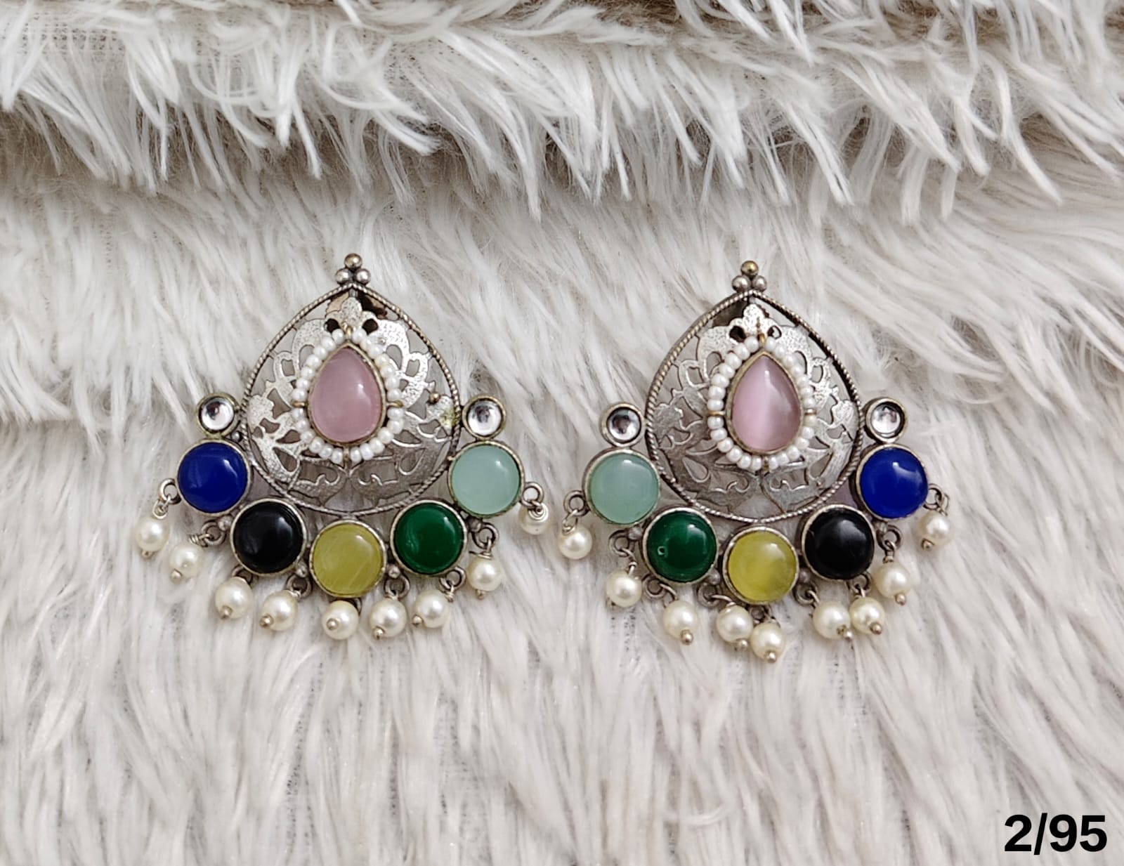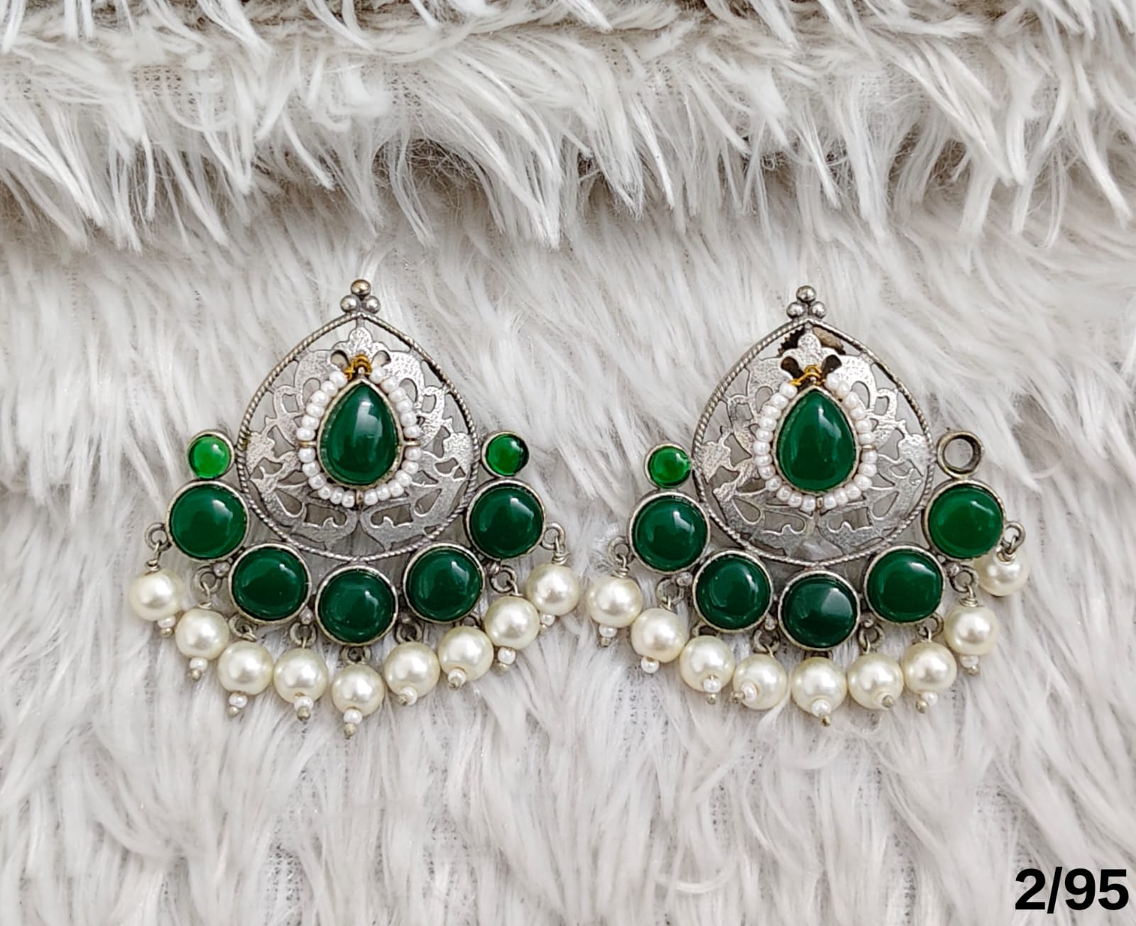 Add a touch of regal charm to your look with these beautifully handcrafted oxidised chandbali earrings. Designed with intricate floral engraving and adorned with round stones and dangling pearl-like beads, these earrings perfectly combine traditional elegance with a statement-making appeal. Ideal for festive occasions, weddings, or ethnic celebrations, they’re sure to elevate any outfit.