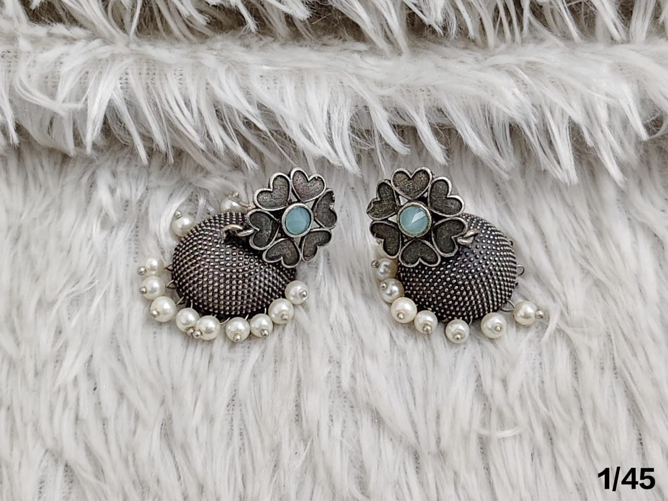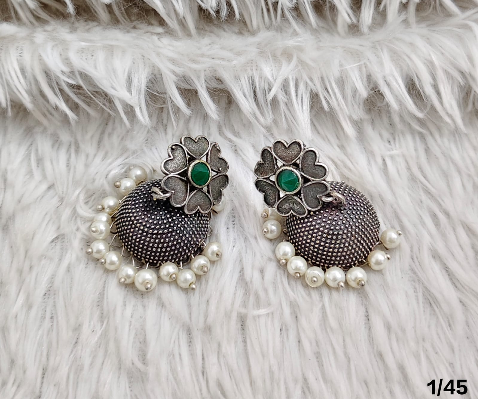 Add timeless elegance to your accessory collection with these beautifully crafted oxidised dome stud earrings. Featuring a textured dome base adorned with delicate pearl-like beads and a floral top accent, these earrings offer a perfect blend of vintage charm and modern sophistication. Ideal for pairing with ethnic and Indo-western outfits, they are a versatile pick for festive and everyday wear.