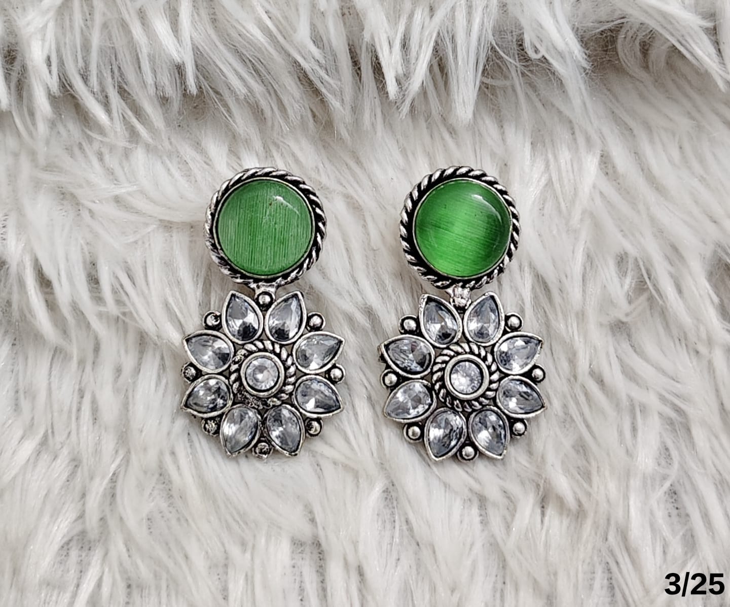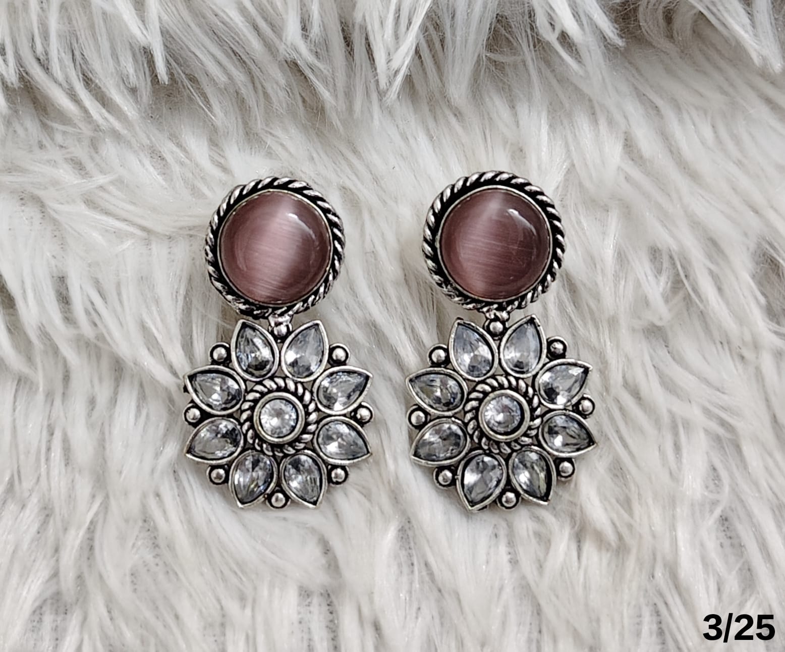 Oxidised Floral Drop Earrings with Stone Stud – Antique Silver Finish