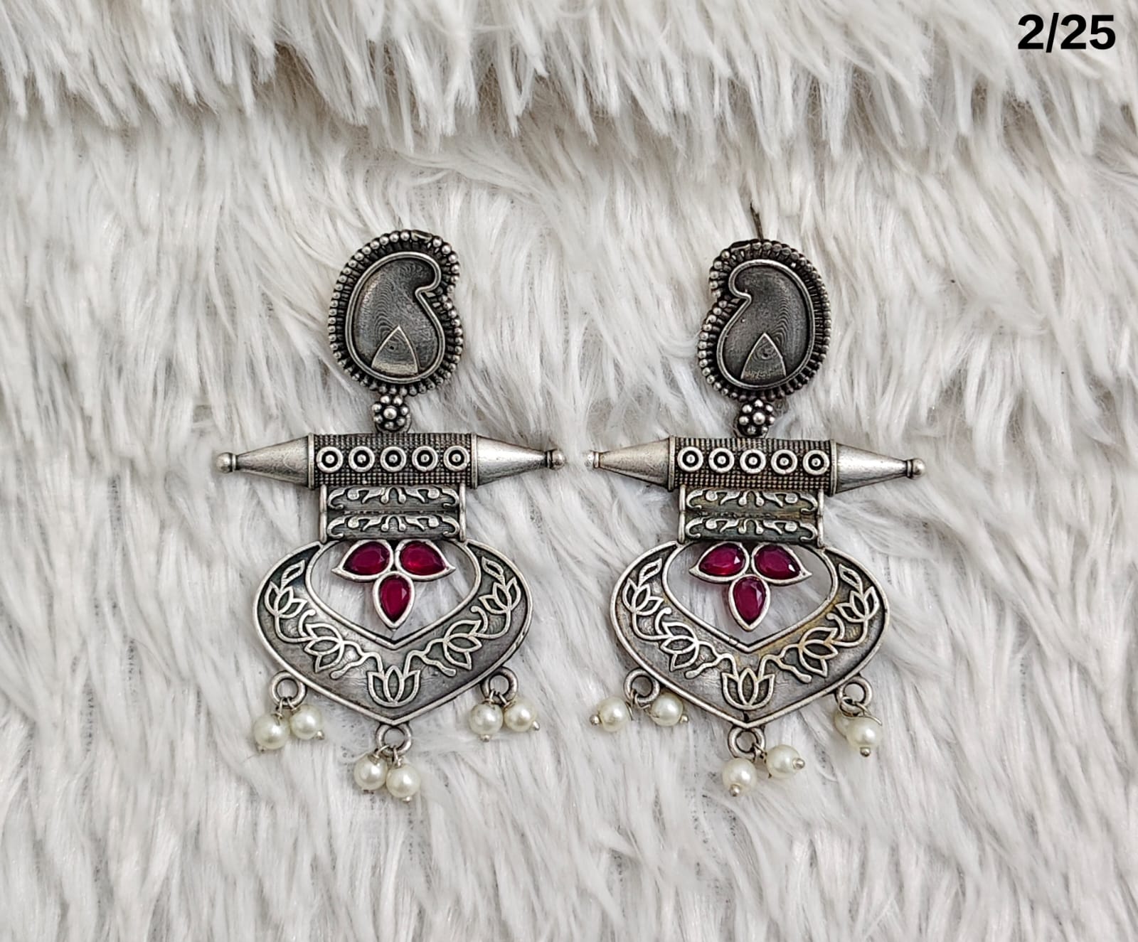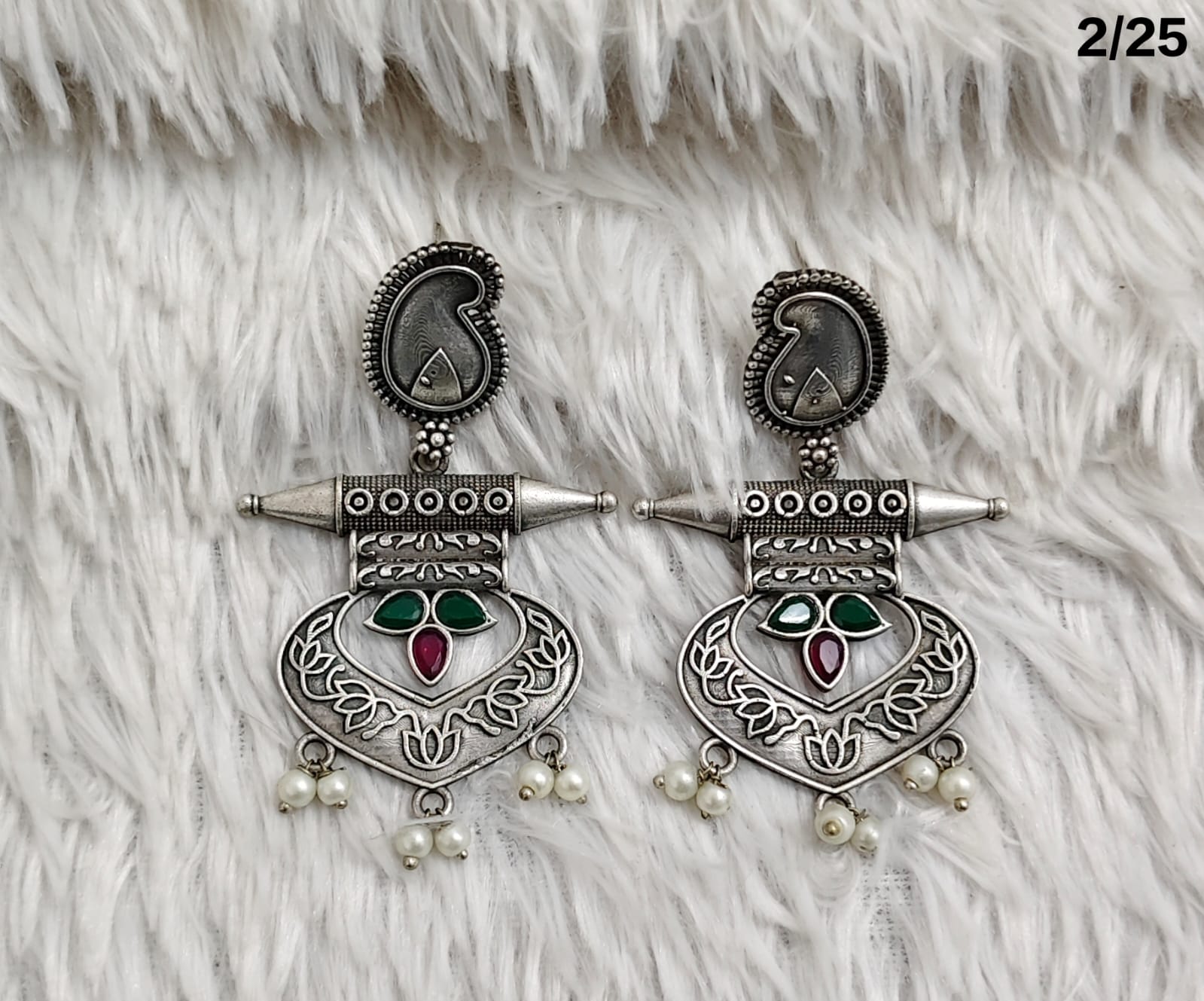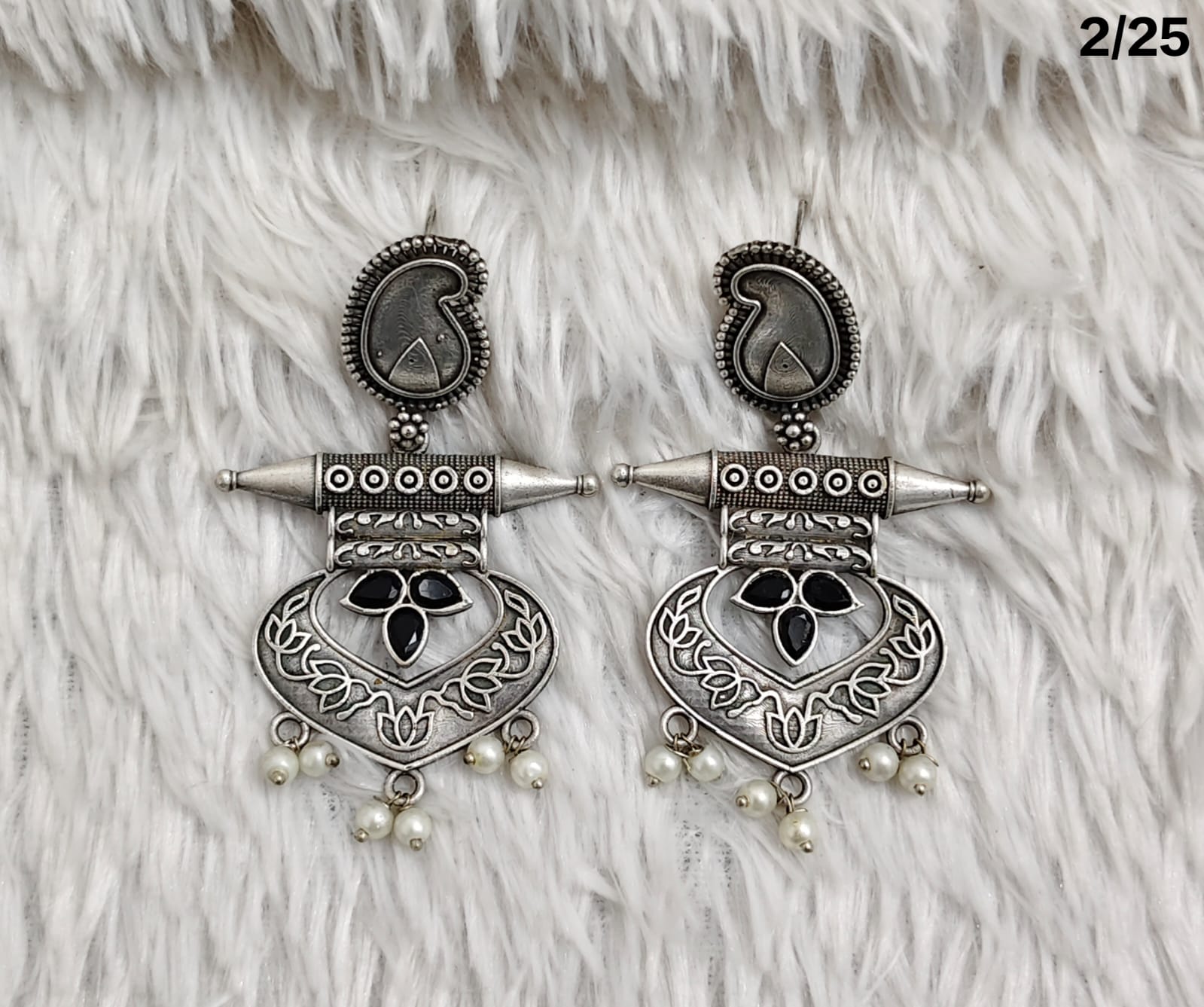 Add a bold and traditional edge to your look with these handcrafted oxidised tribal drop earrings. Featuring intricate engravings, a unique heart-inspired motif, and delicate pearl-like danglers, these earrings reflect rich cultural artistry with a rustic charm. Ideal for ethnic wear, festive outfits, or boho-chic ensembles, they make a striking addition to your jewelry collection.