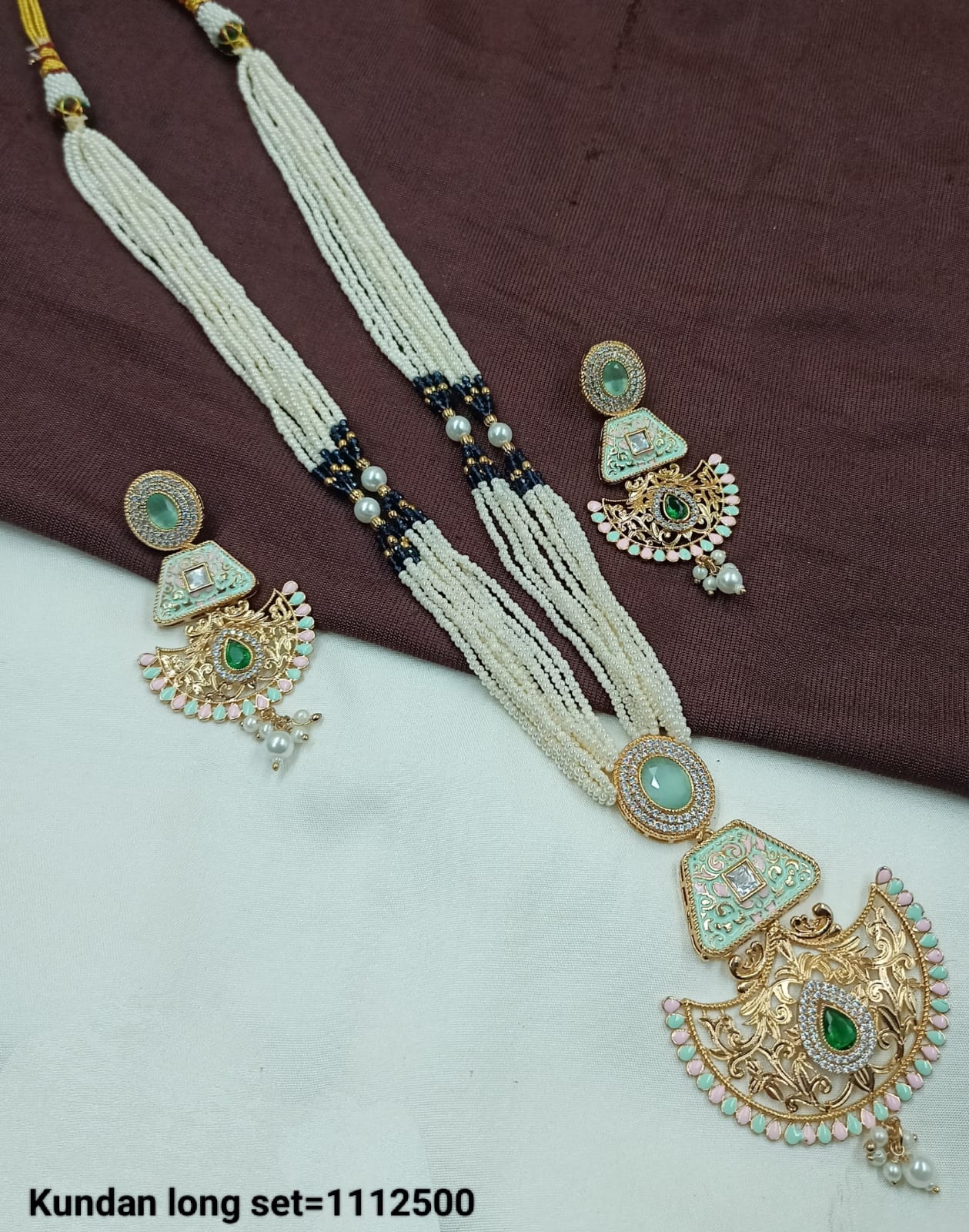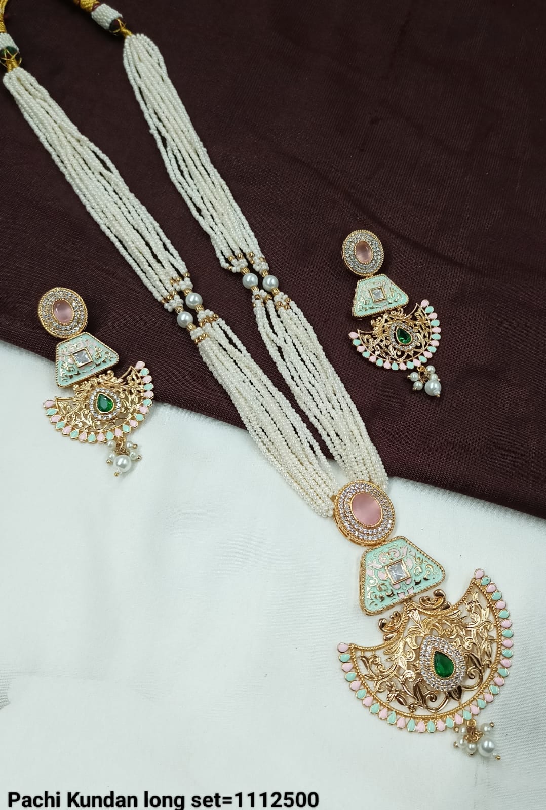 Elevate your elegance with this exquisite Pachi Kundan long necklace set, beautifully gold-plated to enhance its traditional charm.