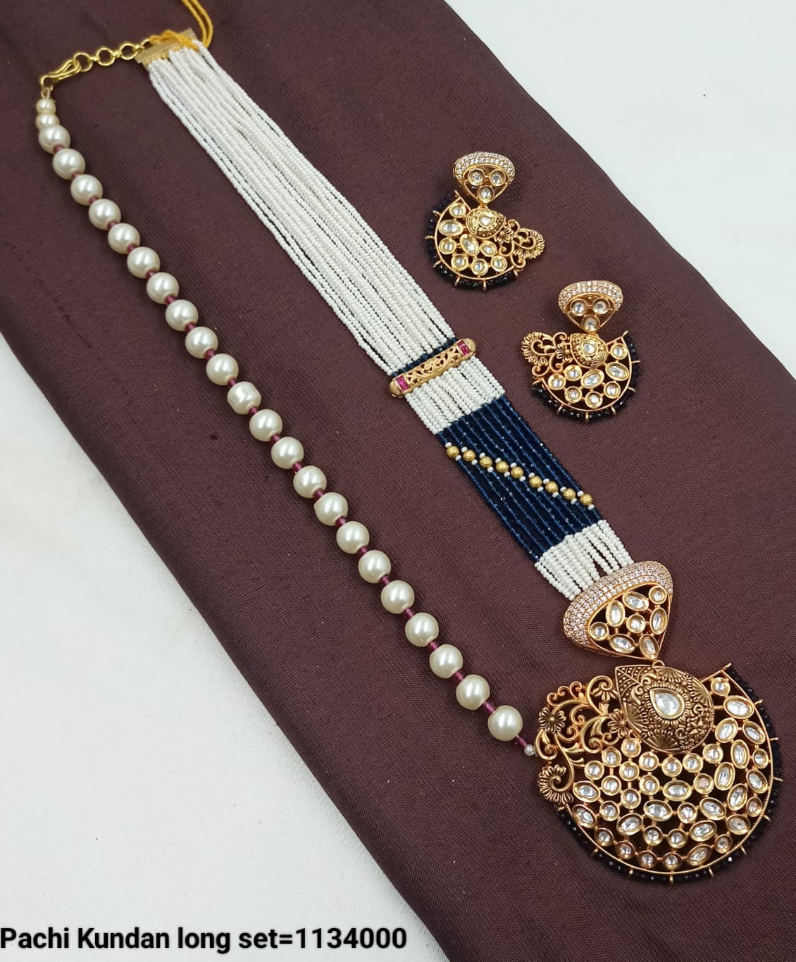 Pachi Kundan Long Necklace Set with Matching Earrings – Pearl & Bead Traditional Jewellery