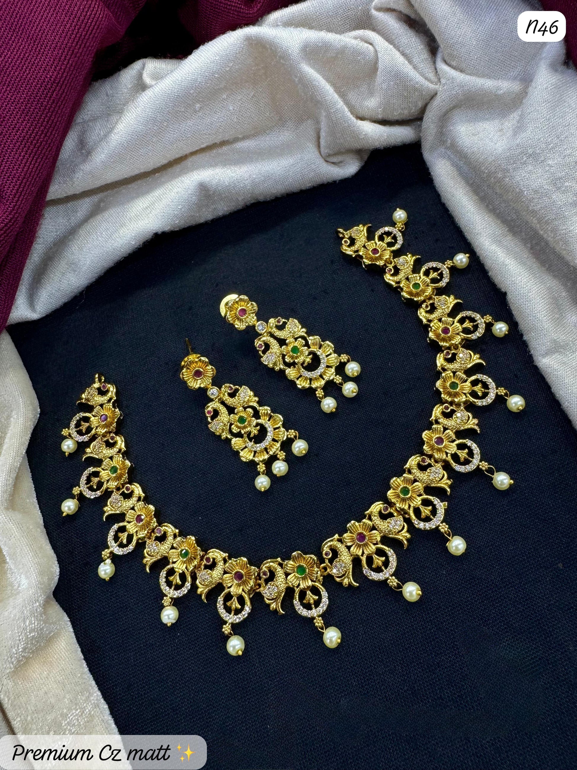 Premium AD Gold Necklace & Earrings Set – Elegant Floral Design with Pearls