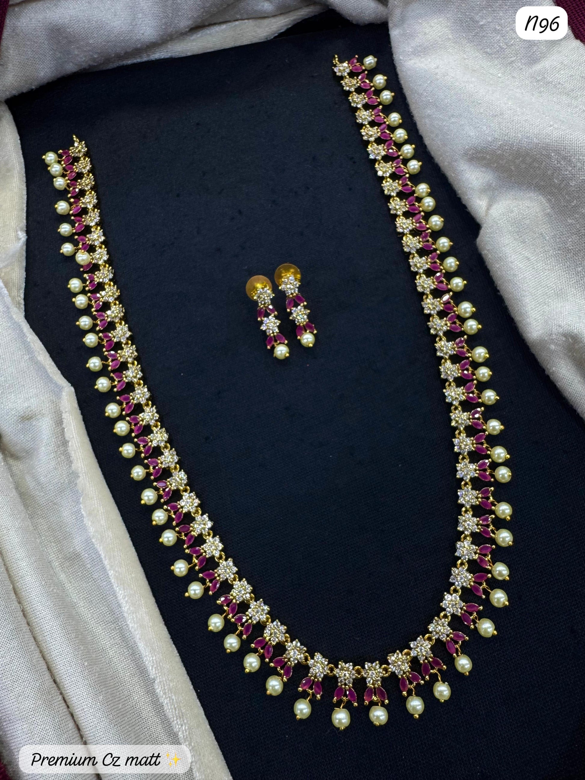 Premium AD Necklace Set – Ruby & Pearl Design with Matching Earrings