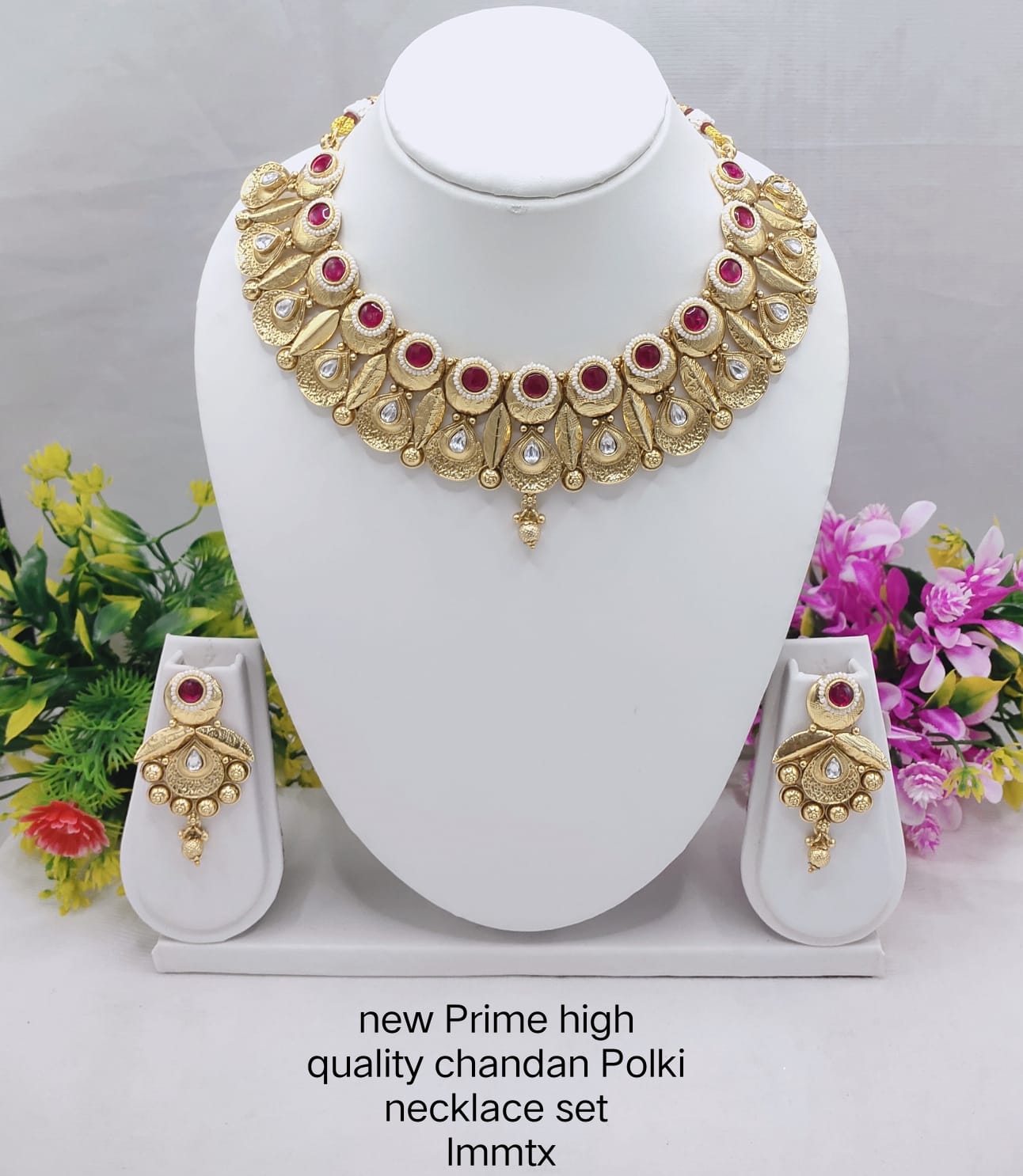 Elevate your traditional look with this Premium Chandan Polki Necklace Set, a timeless piece of artistry designed for elegance and grace. This intricately crafted set includes a beautifully detailed necklace and a pair of matching earrings, perfect for weddings, festivals, and special occasions. Adorned with red, green, and white stones set in a high-polish gold finish, it captures the essence of royal Indian jewelry with a modern touch. Whether you're a bride or a guest, this set adds a statement to any ethnic ensemble.