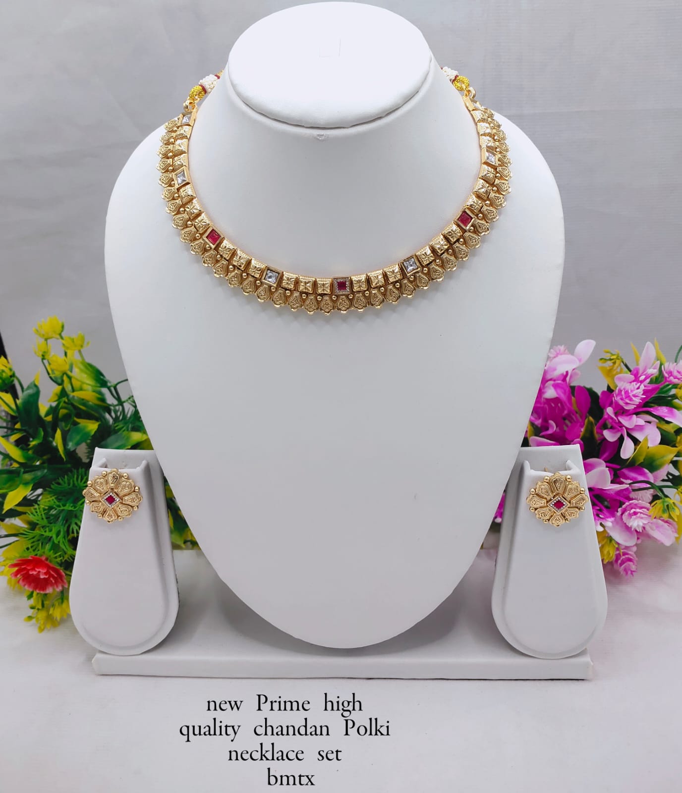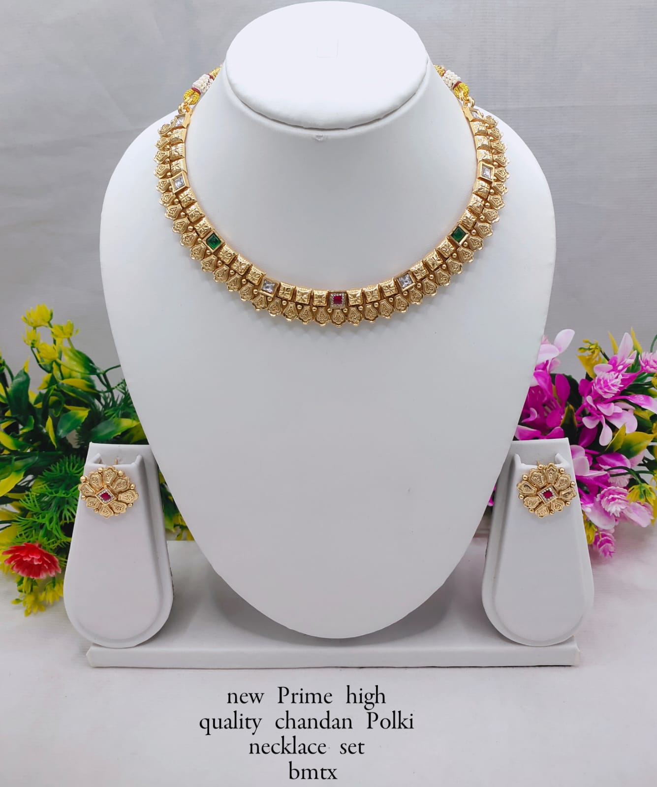 Add a touch of classic elegance to your ethnic ensemble with this Premium Copper Chandan Polki Necklace Set. Meticulously crafted with traditional Polki-style elements, this set features a structured copper base enhanced with square-cut stones and fine detailing. The matching floral stud earrings complement the necklace beautifully, making it perfect for both festive and formal occasions. Its durable copper finish and timeless design ensure it remains a favorite in your collection for years to come.