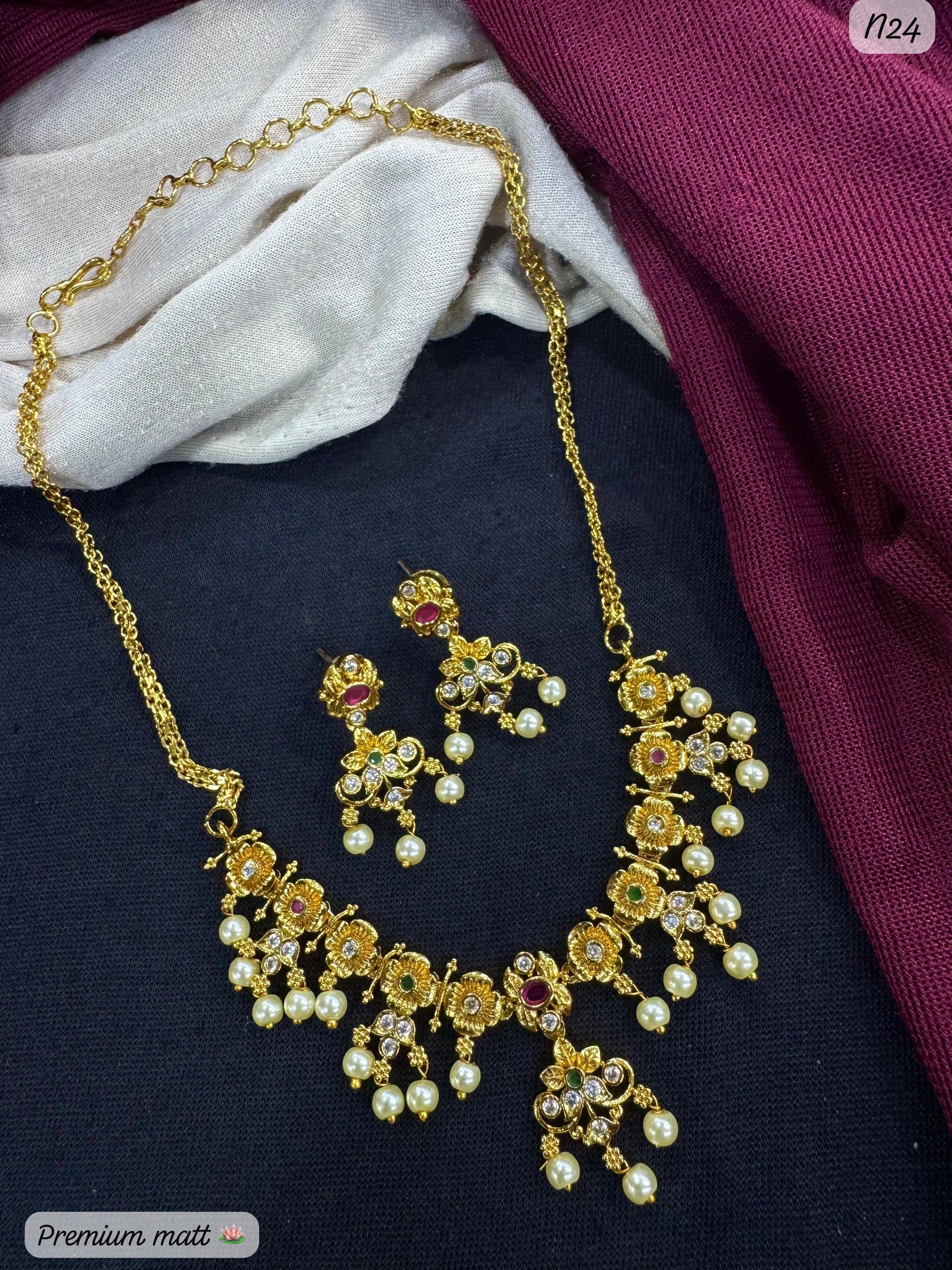 Premium Gold-Plated Floral AD Necklace Set with Pearl Drops & Matching Earrings