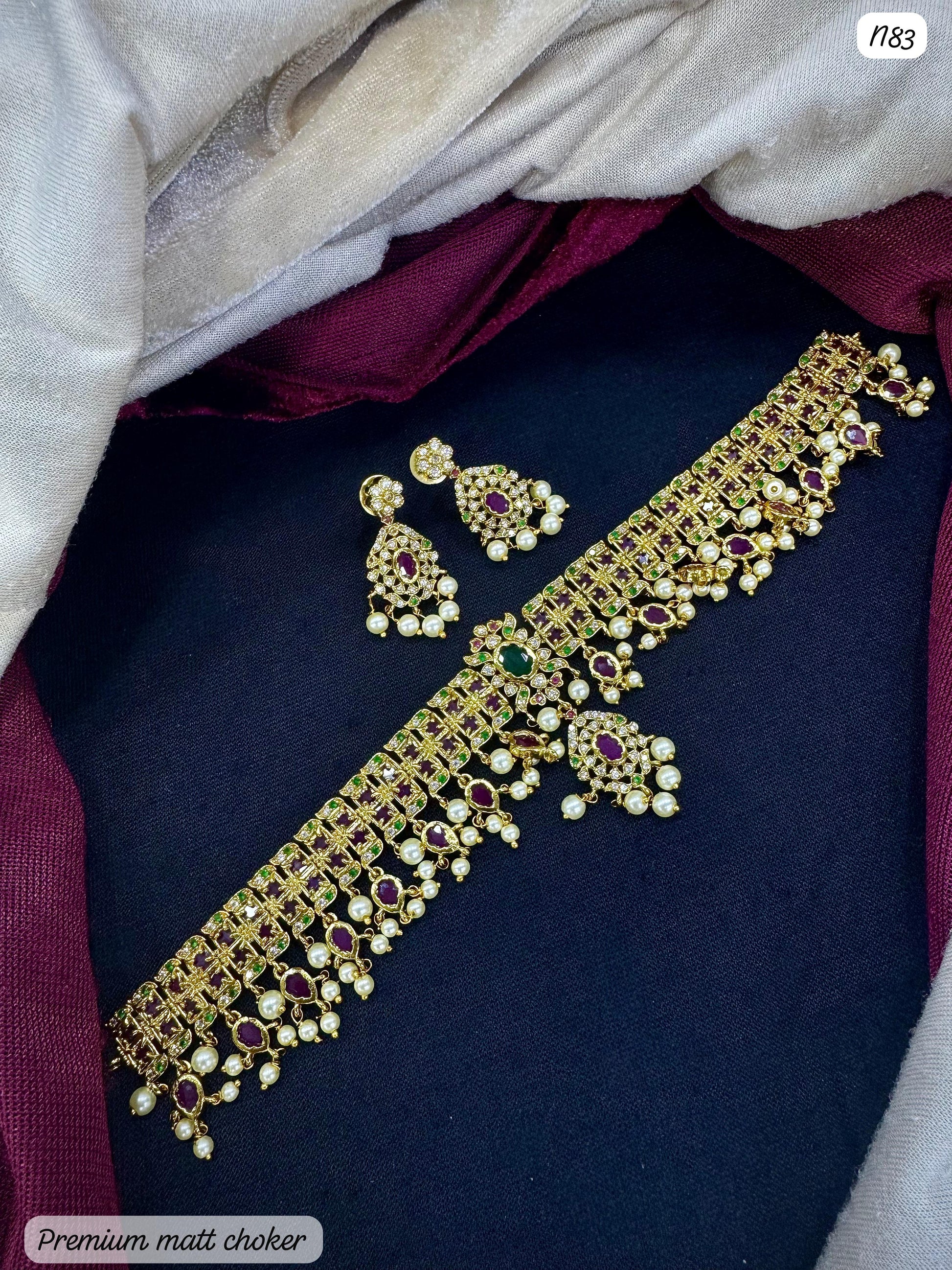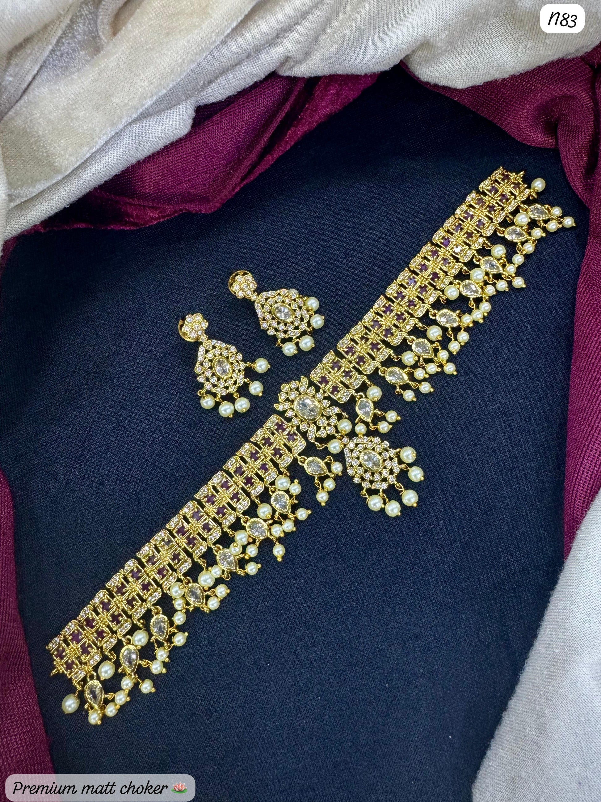 Premium Matte Finish Choker Necklace and Earring Set with Pearl Detailing