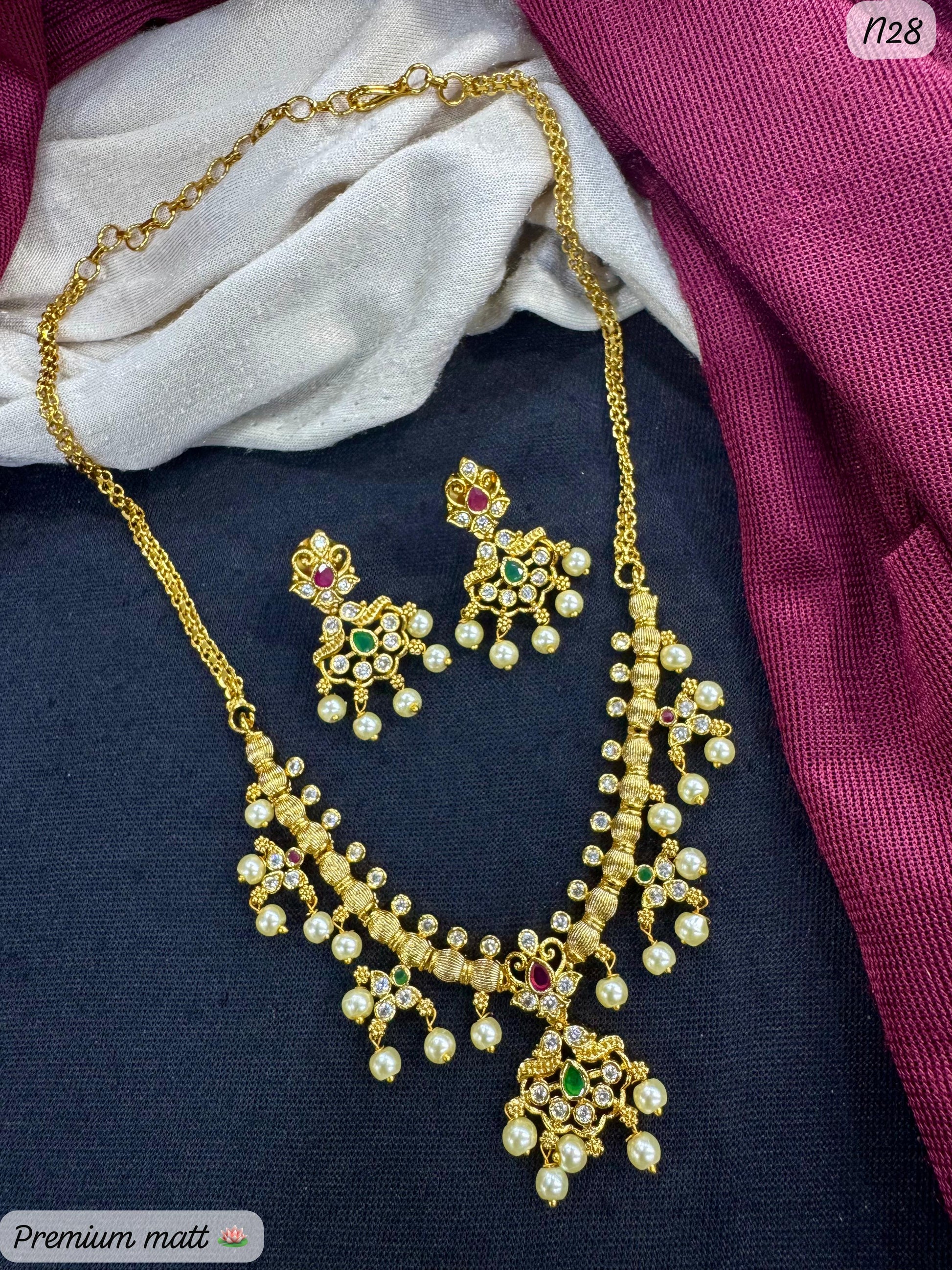 Premium Matte Gold-Plated Temple Design AD Necklace Set with Pearl Drops & Matching Earrings