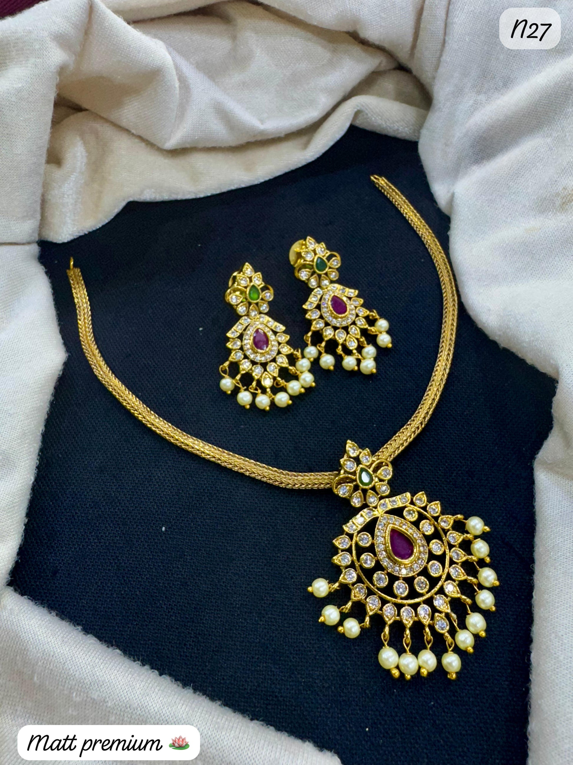 Make a statement of timeless elegance with this Matt Premium Teardrop Pendant Necklace Set, featuring a radiant gold finish. The centerpiece teardrop pendant is adorned with shimmering AD stones and a striking ruby-colored stone, beautifully enhanced with pearl drops for added charm. Matching earrings mirror the pendant design, making this set ideal for weddings, festivals, and traditional events. Crafted for elegance and comfort, this jewelry set adds a luxurious touch to any ethnic outfit.