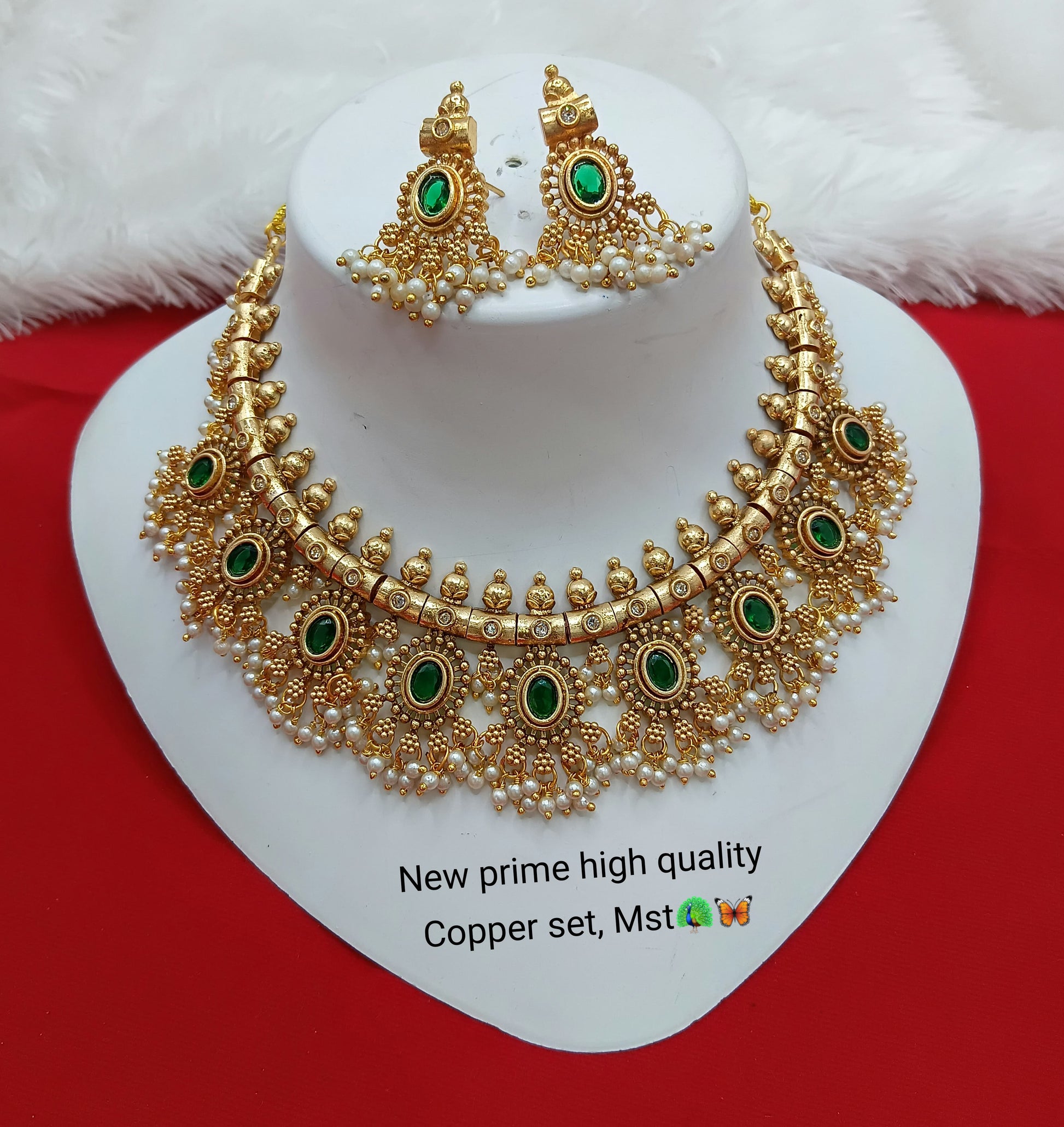 Elevate your traditional look with this Prime High-Quality Temple Choker Necklace Set. Crafted from premium copper and adorned with intricate temple-inspired motifs, this set features a stunning choker necklace paired with matching earrings. The antique finish and embedded stones bring an aura of grace and royalty, making it a perfect choice for weddings, festivals, and cultural celebrations.
