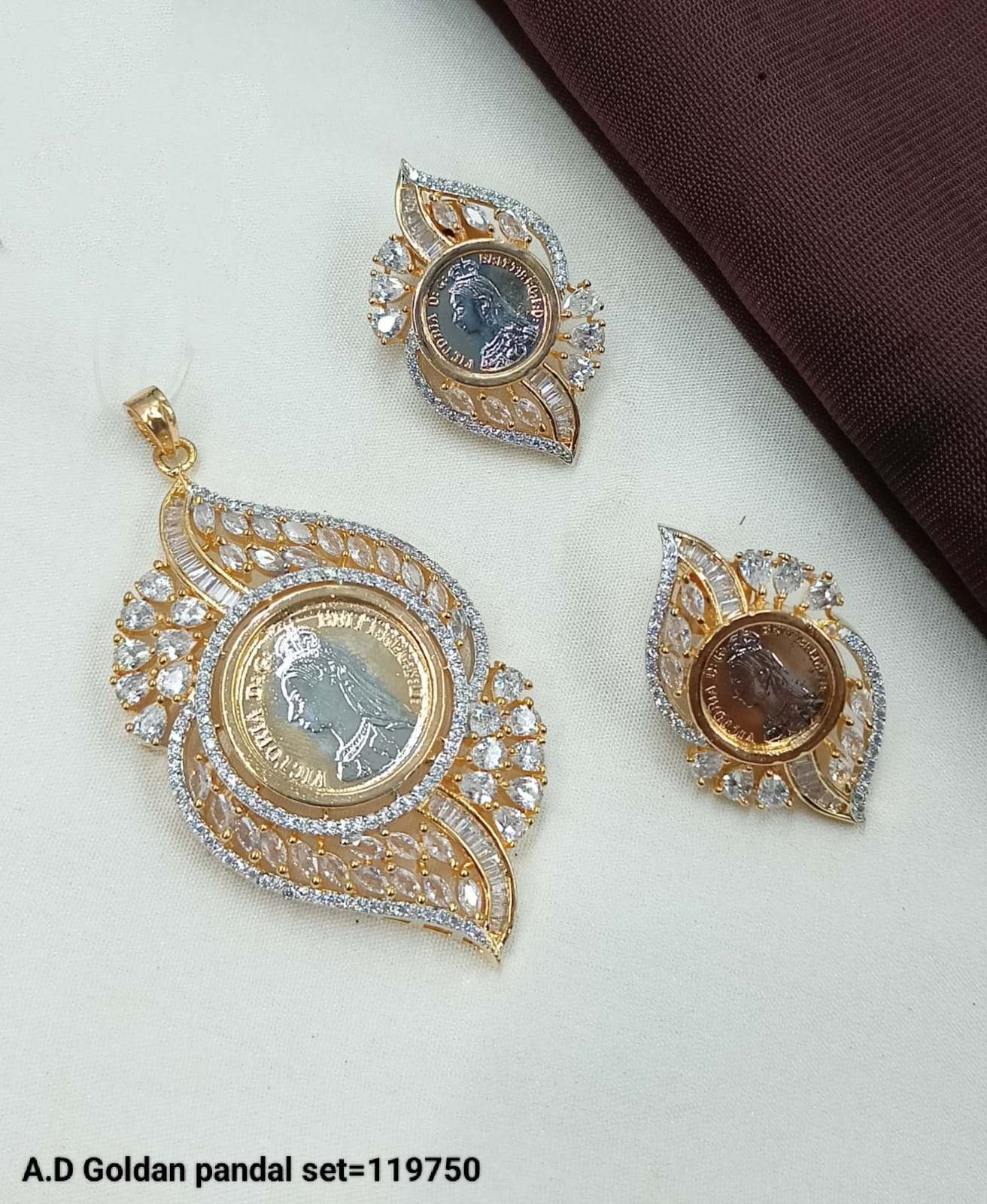 Add a royal touch to your jewelry collection with this elegant A.D Golden Pandal Set, beautifully crafted with a vintage Queen Victoria coin design at its center. This stunning set includes a pendant and matching earrings, all adorned with high-quality American Diamonds that sparkle with every movement. The intricate leaf-inspired design and dual-tone finish (gold and silver) make it a unique blend of antique charm and modern elegance. Perfect for traditional occasions, festive celebrations, or as a thoughtful gift for someone special.