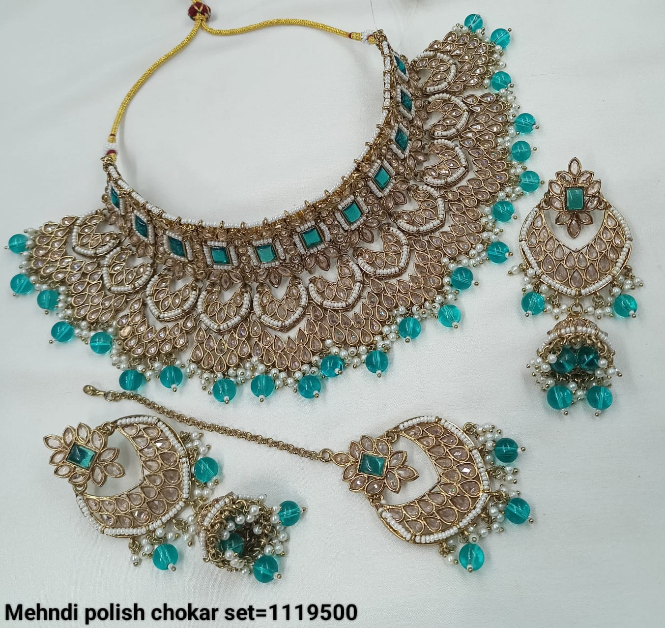 • Complete Bridal Set: Includes choker necklace, earrings, maang tikka.