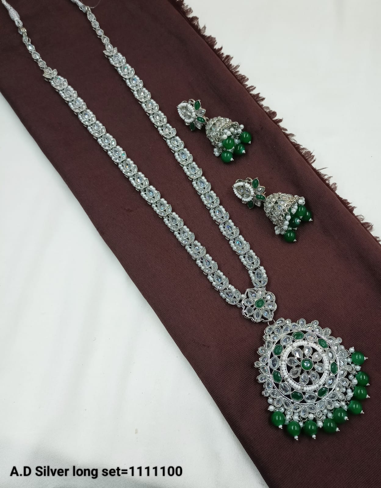 Elevate your traditional ensemble with this stunning AD Silver Long Necklace Set, designed to exude royal elegance and timeless beauty. Embellished with high-quality American diamonds and intricate craftsmanship, this set includes a long necklace and a matching pair of jhumka earrings.
