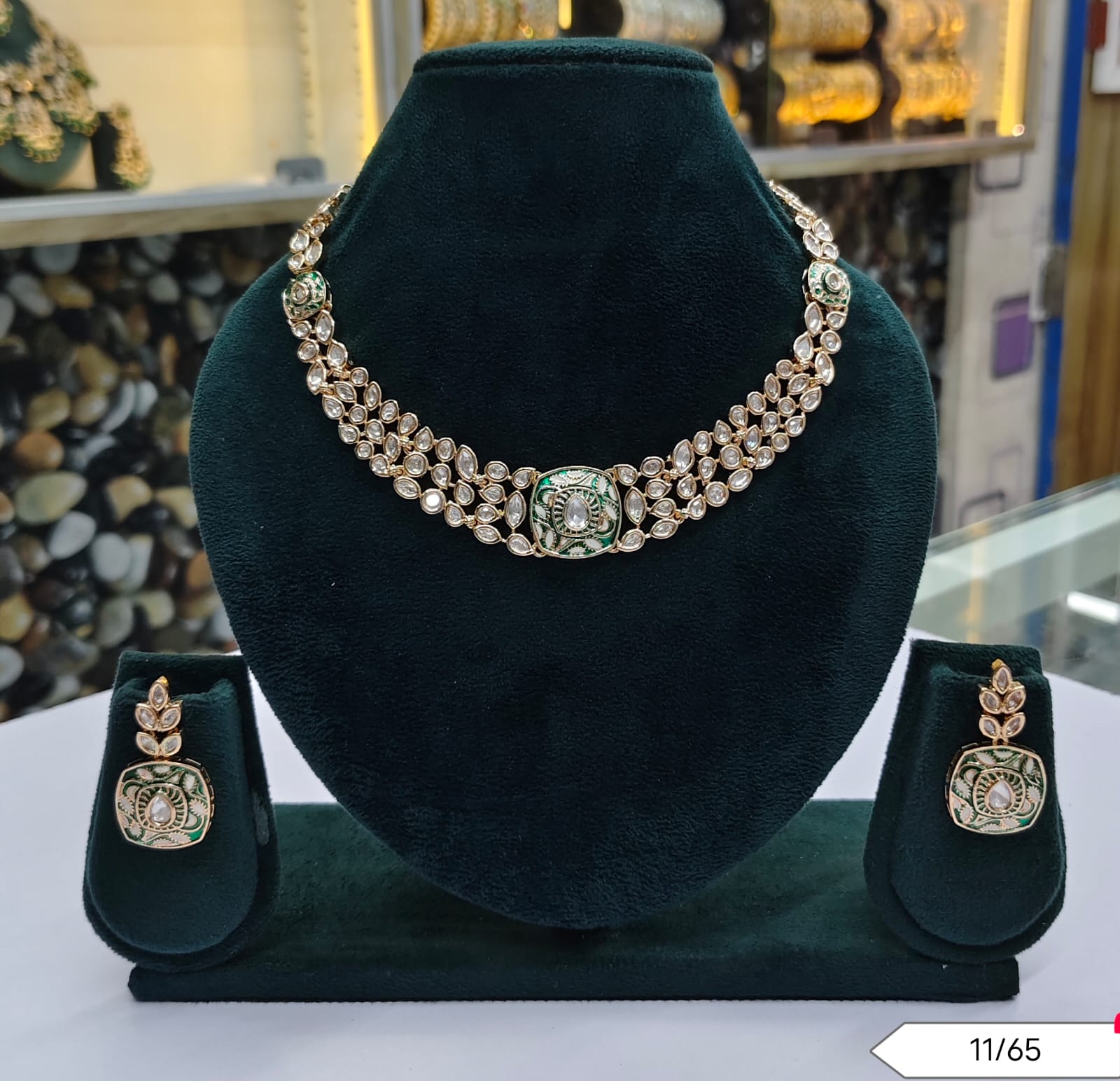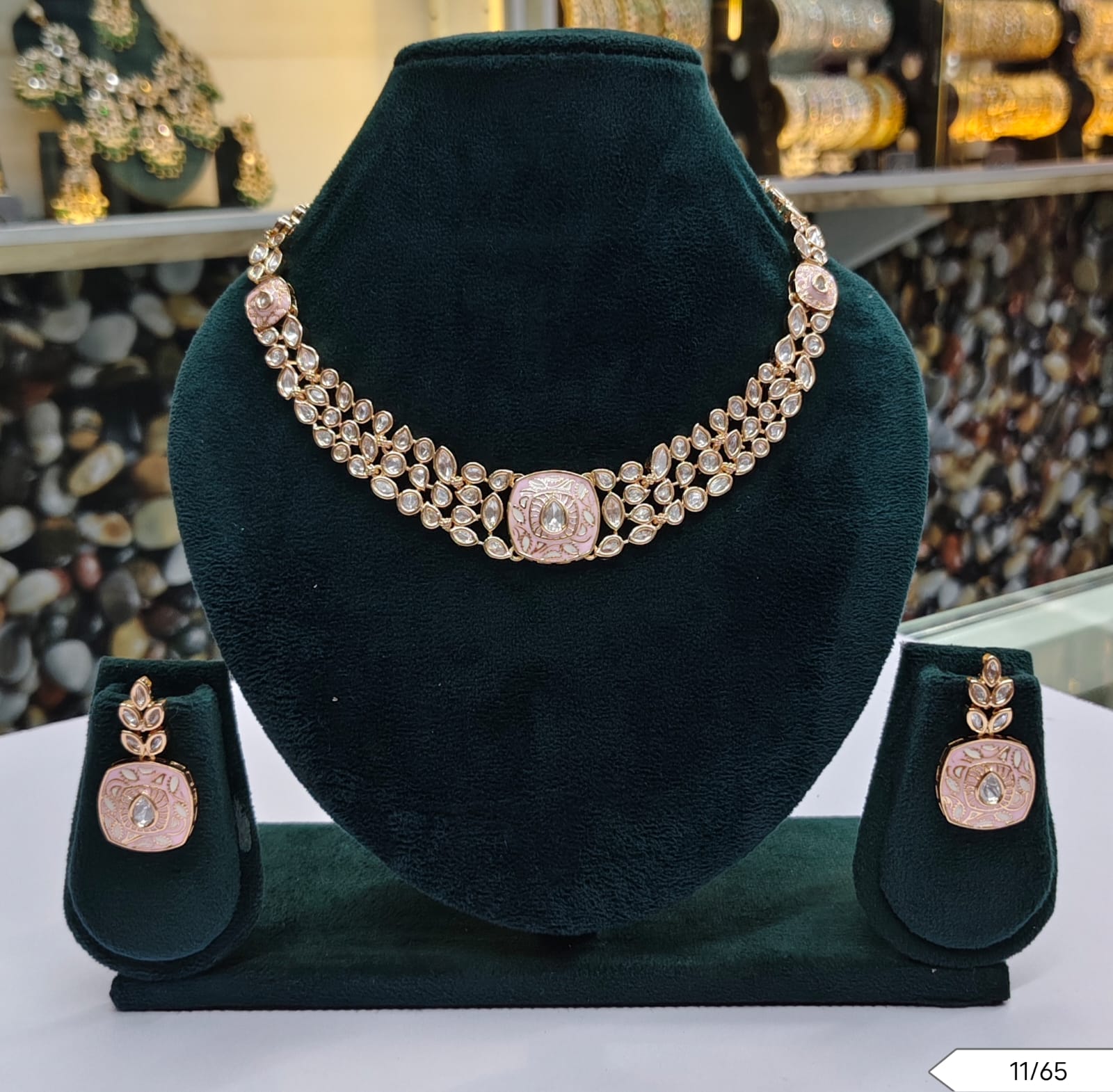 Elevate your traditional ensemble with this exquisite Regal Square Pendant Kundan Necklace & Earrings Set. Featuring a beautifully crafted square-shaped pendant with intricate meenakari detailing, this piece blends classic craftsmanship with a royal finish. The double-layered kundan stones across the neckline enhance the grandeur, making it ideal for weddings, festive occasions, or cultural celebrations.