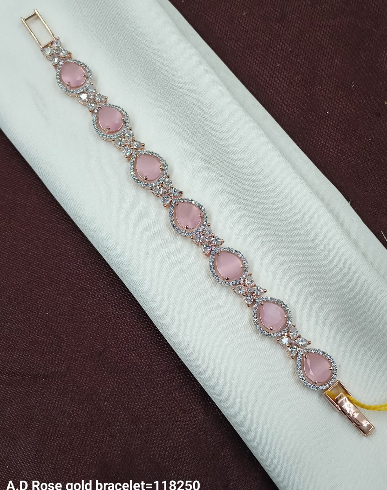 Bring a soft, graceful charm to your jewelry collection with this stunning A.D Rose Gold Bracelet, highlighted by elegant teardrop-shaped pink stones and dazzling American Diamonds. The romantic rose gold base enhances the delicate design, while the sparkle of the CZ accents adds a touch of luxury. Perfect for weddings, formal occasions, or thoughtful gifting, this bracelet is the epitome of timeless feminine beauty.