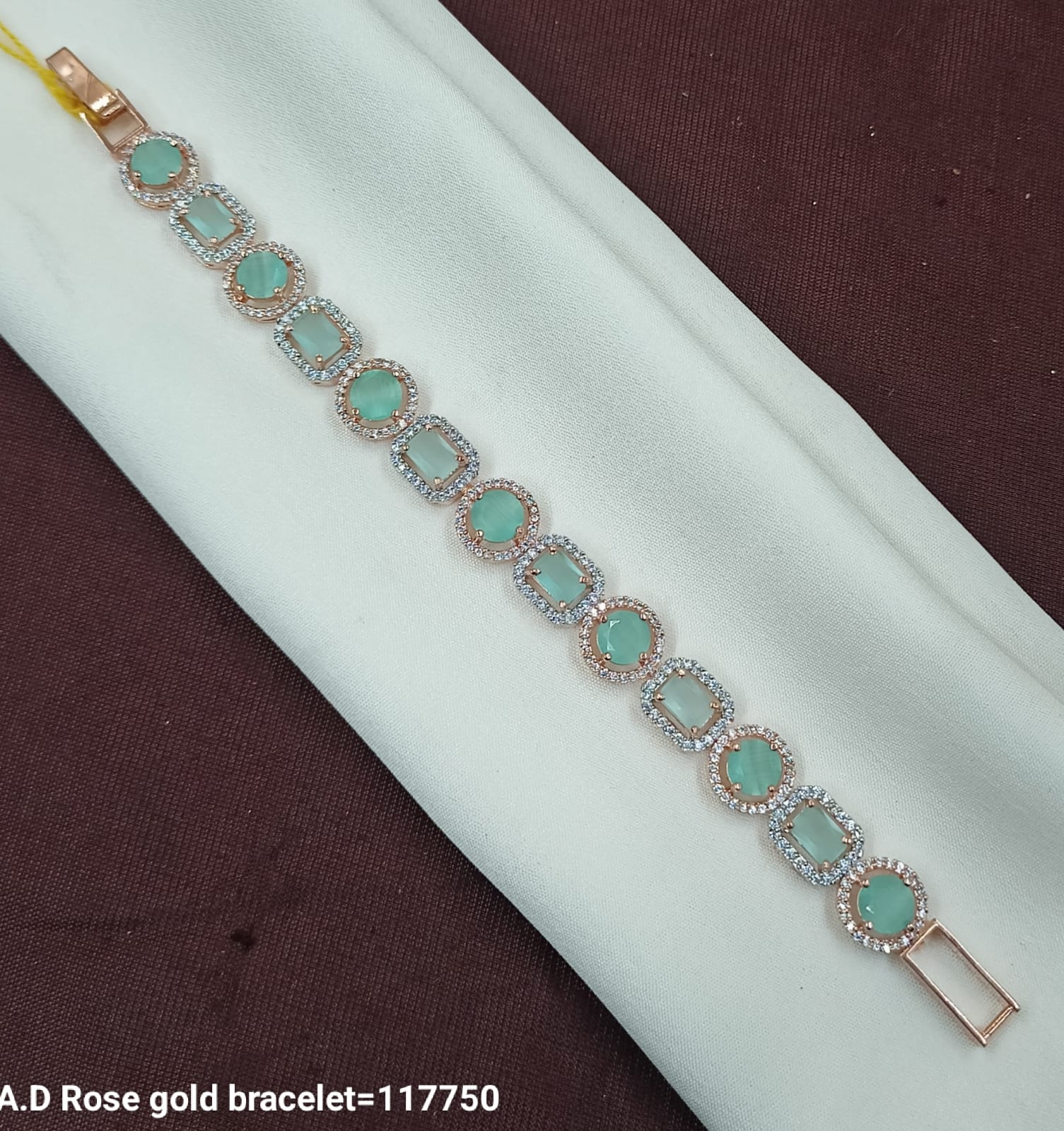 Refined and radiant, the Rose Gold Bracelet with Mint Green Oval & Square Stones from Lucentemarket is a graceful blend of classic charm and modern design. Alternating between oval and square mint green stones, each element is surrounded by sparkling American Diamonds (AD), enhancing the subtle elegance of the rose gold setting.This bracelet pairs beautifully with both ethnic and western attire, making it a versatile accessory for weddings, celebrations, or a touch of glam to your daily look.