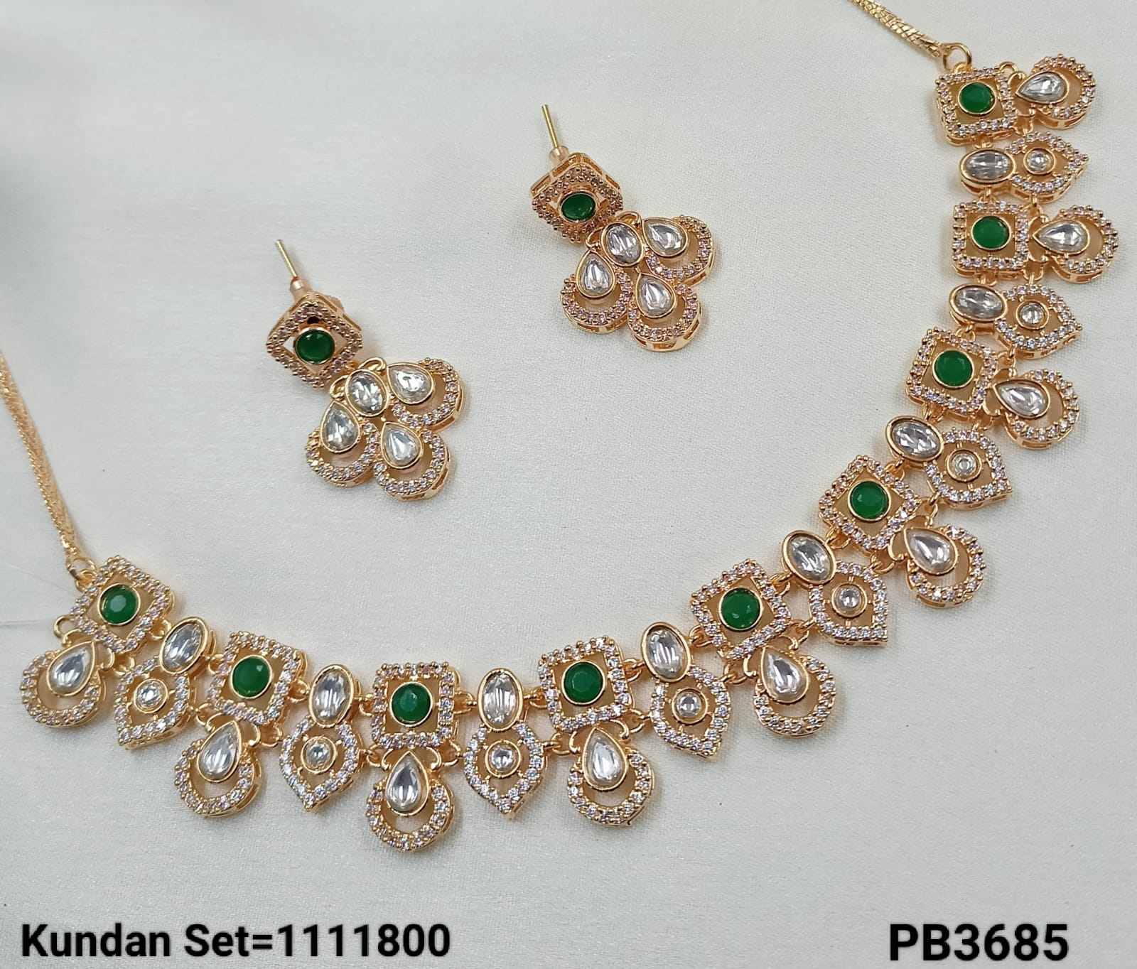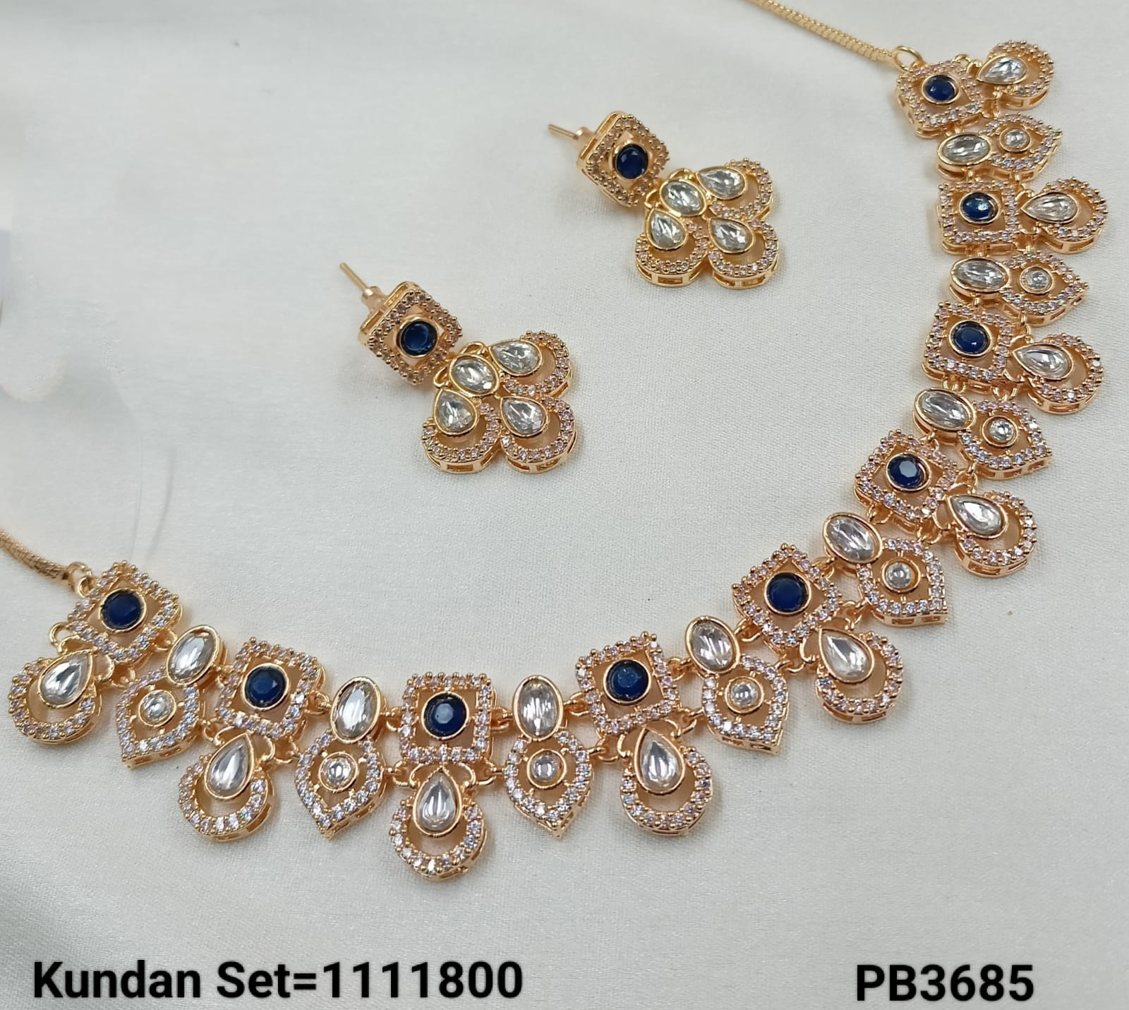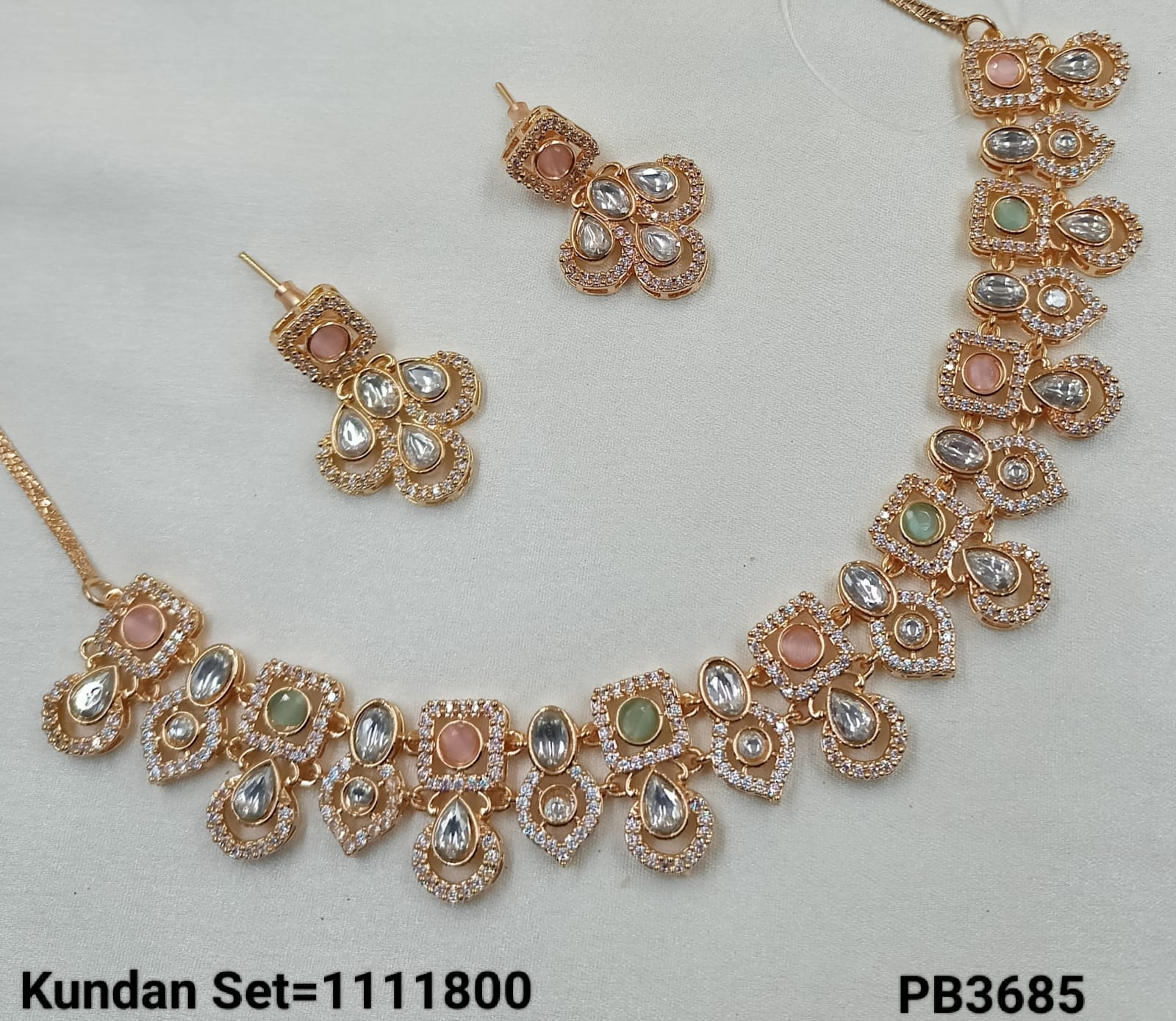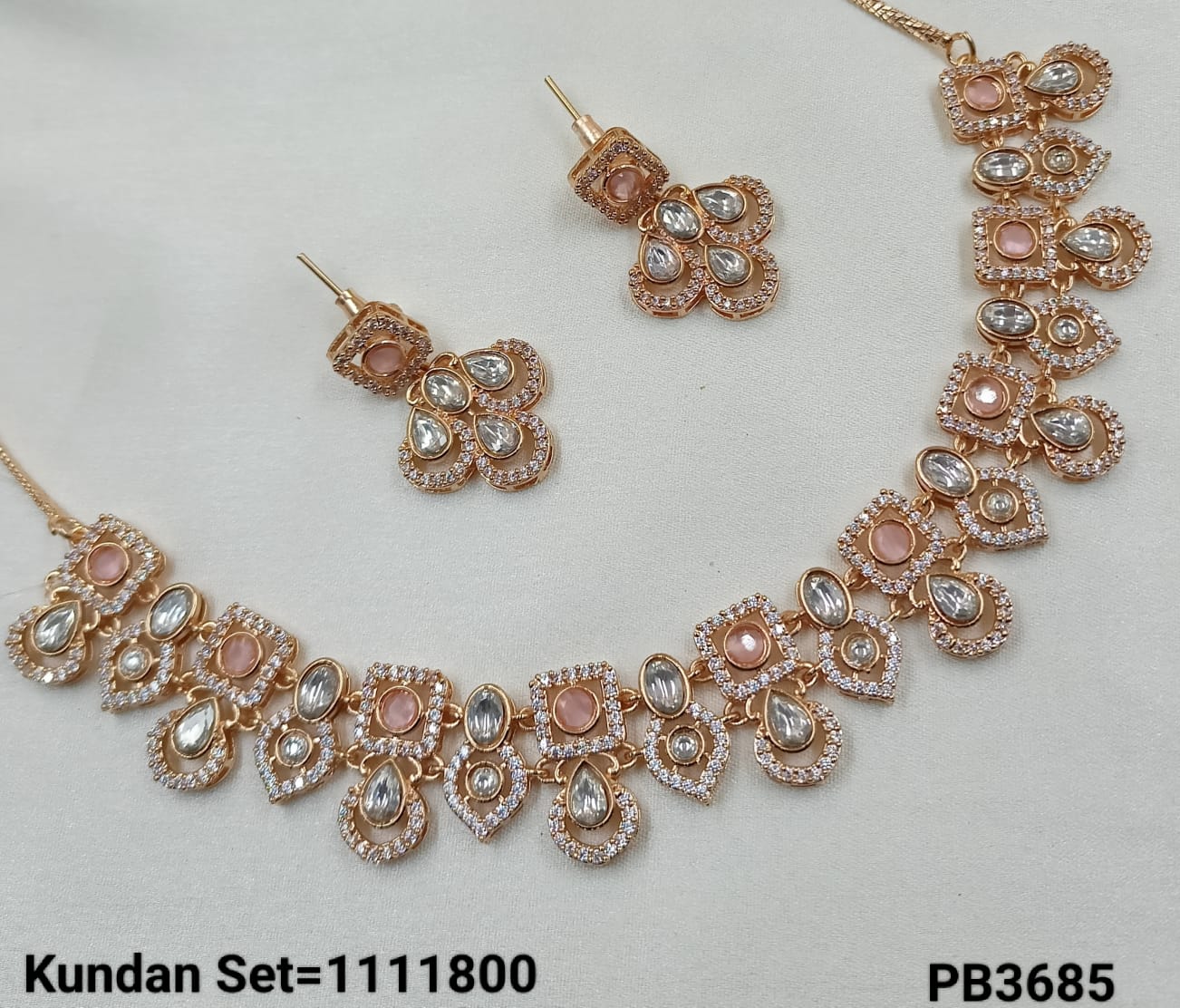 This exquisite necklace set features a rose gold plating combined with traditional Kundan craftsmanship, offering a sophisticated and timeless accessory for special occasions.
