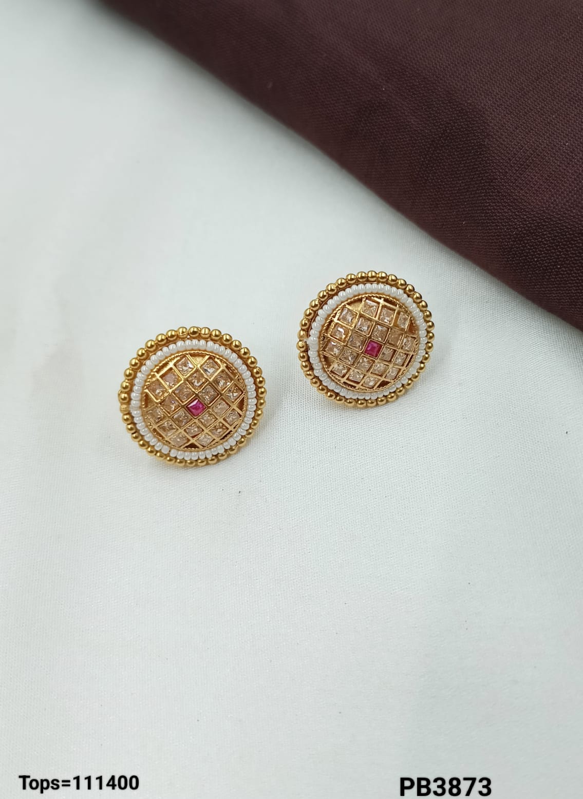 Bring elegance and sophistication to your jewelry collection with these stunning Round Gold-Plated Stud Earrings. Featuring a delicate lattice design adorned with sparkling stones and a subtle touch of red in the center, these earrings are bordered with tiny white pearls and gold beads for a regal finish. Perfect for festive occasions, traditional outfits, or everyday glam, these studs blend classic charm with modern craftsmanship.