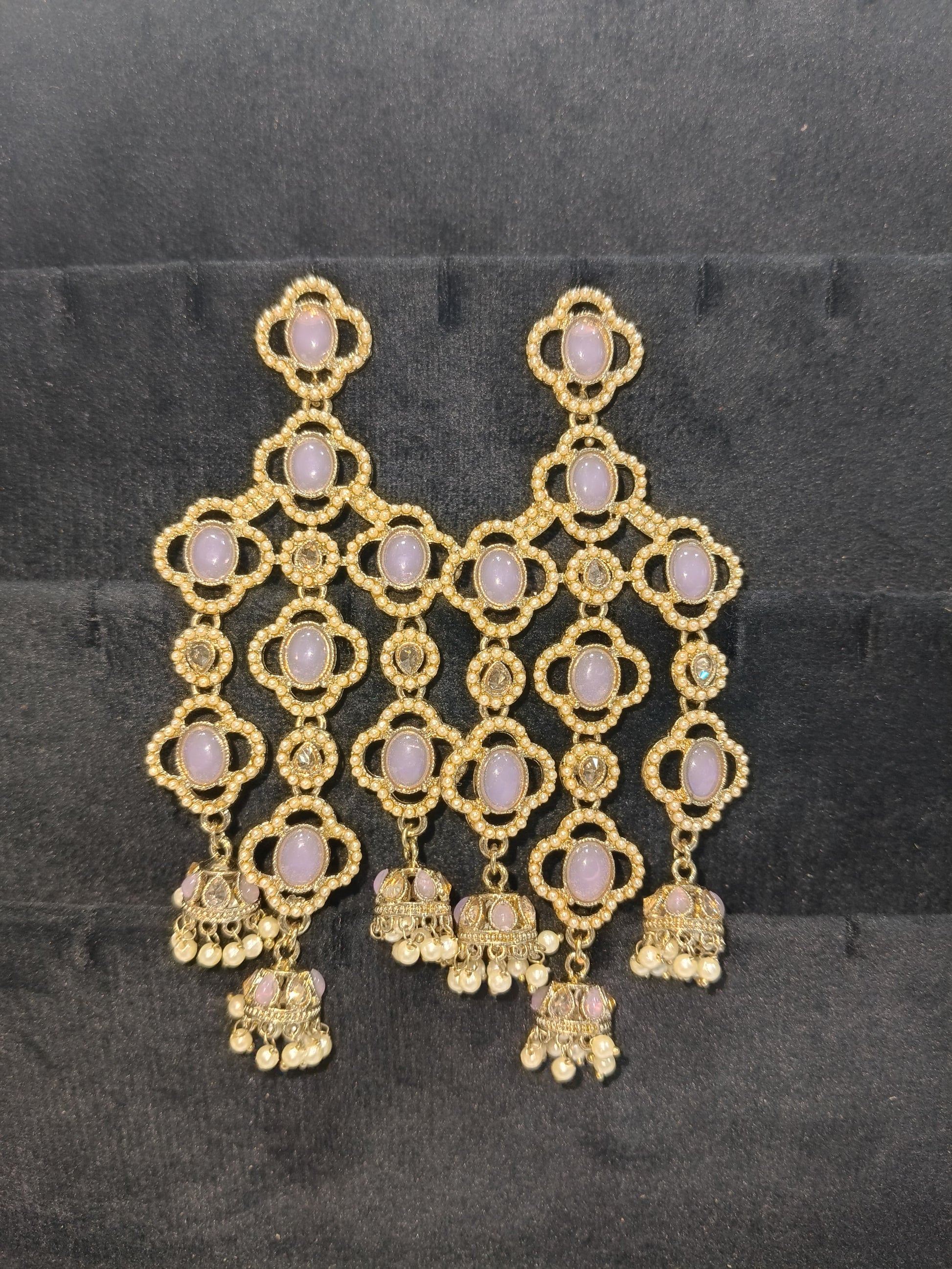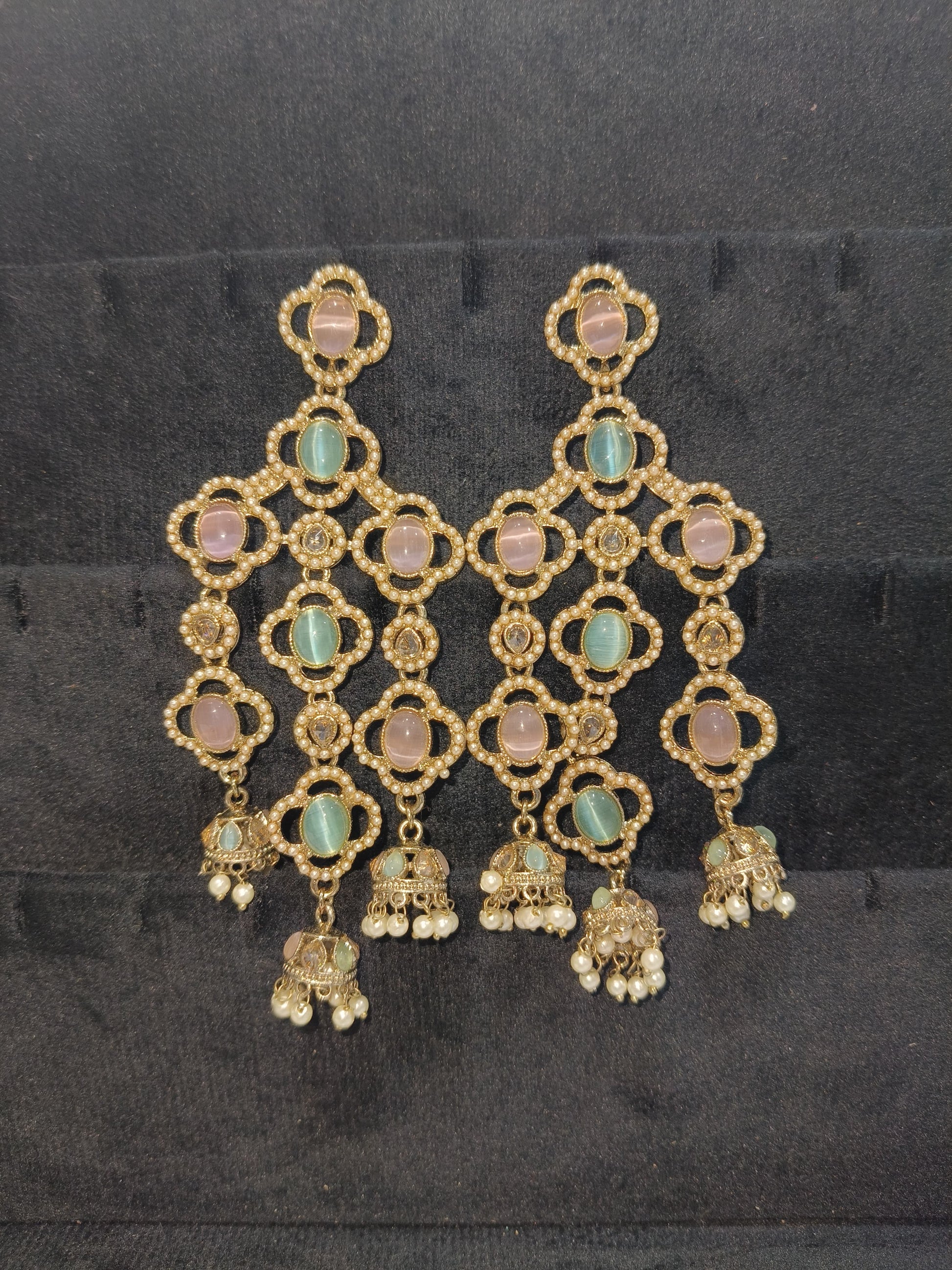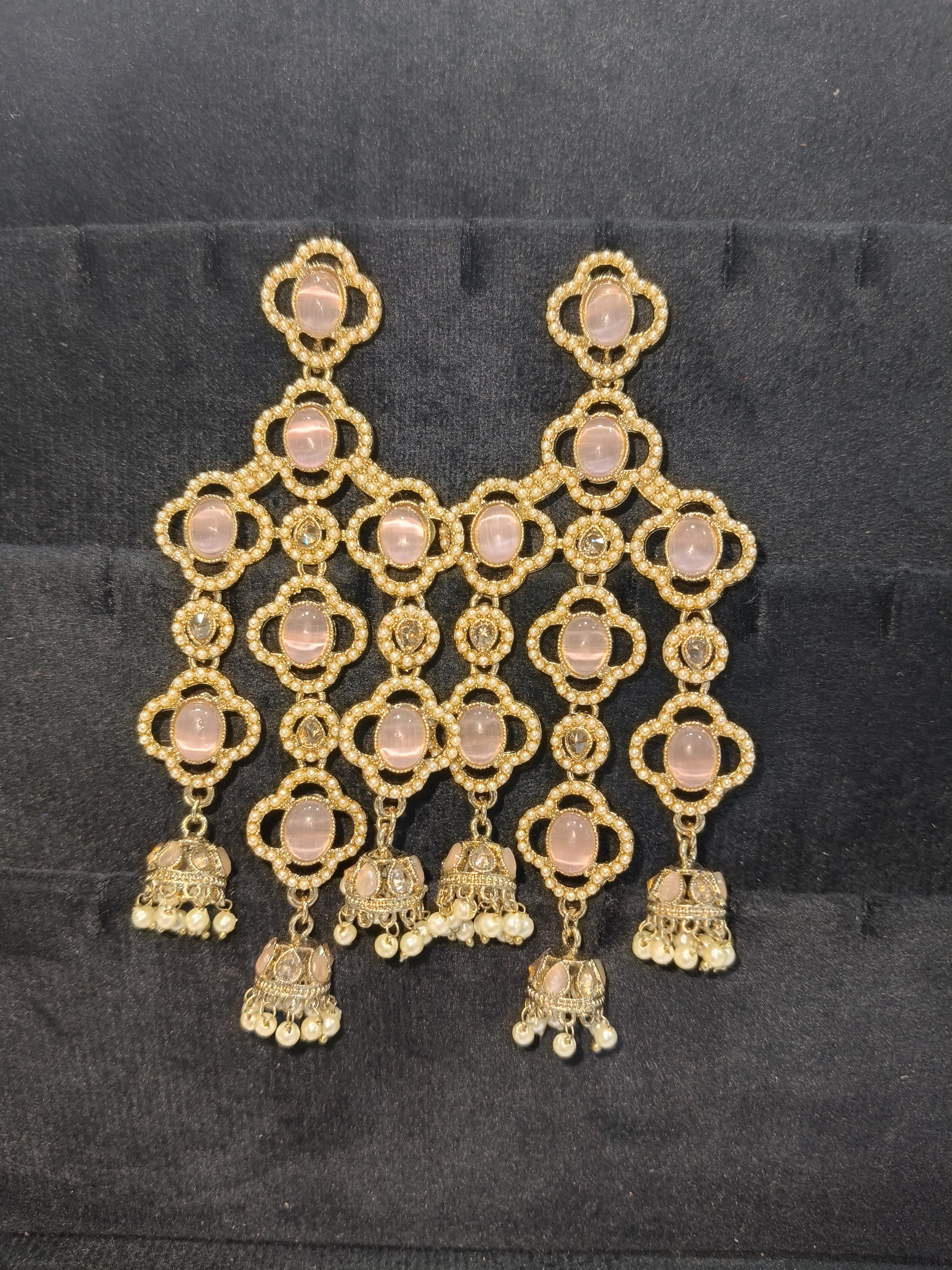Turn heads with these majestic multi-tiered Kundan earrings, beautifully handcrafted with baby pink stones, pearls, and intricate jhumka drops. These statement earrings cascade gracefully in a tiered floral design, perfect for weddings, festive occasions, or ethnic glam looks. The dazzling Kundan work and delicate detailing make them a standout piece in your jewelry collection.