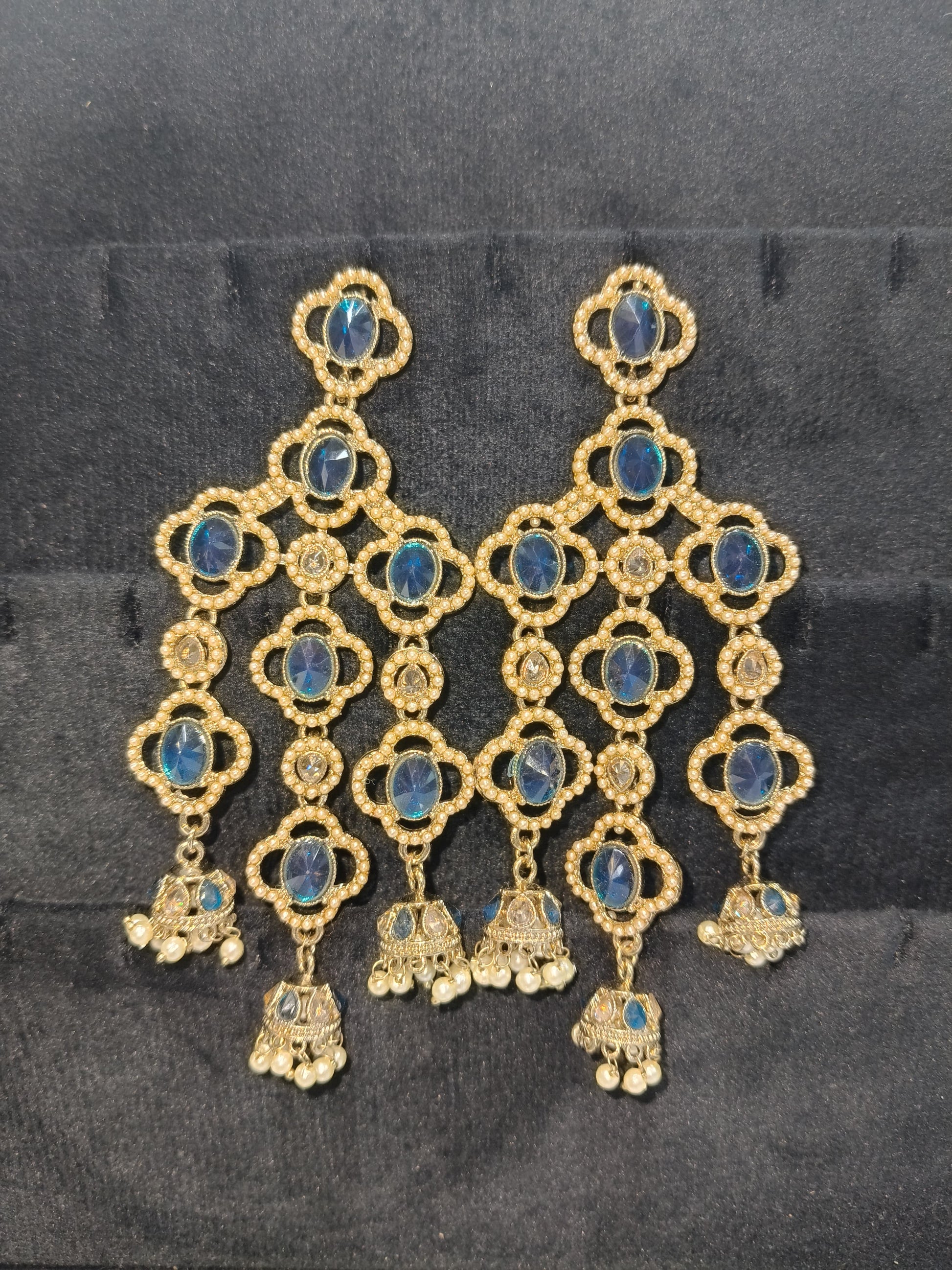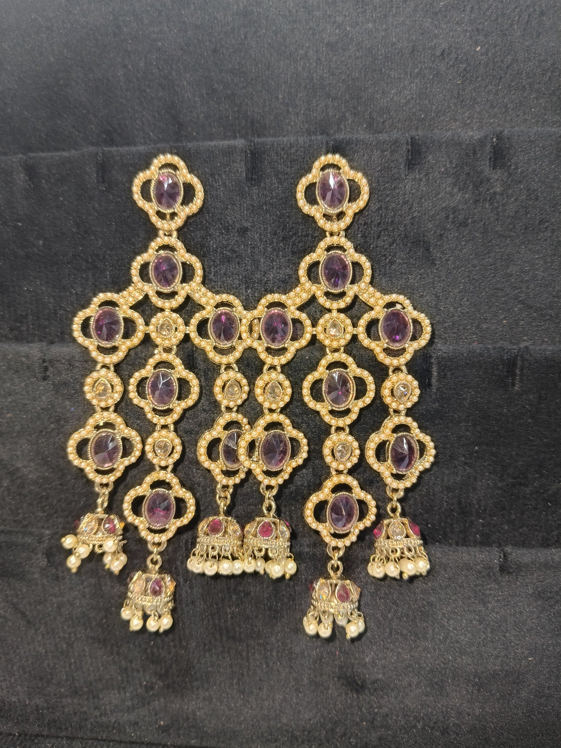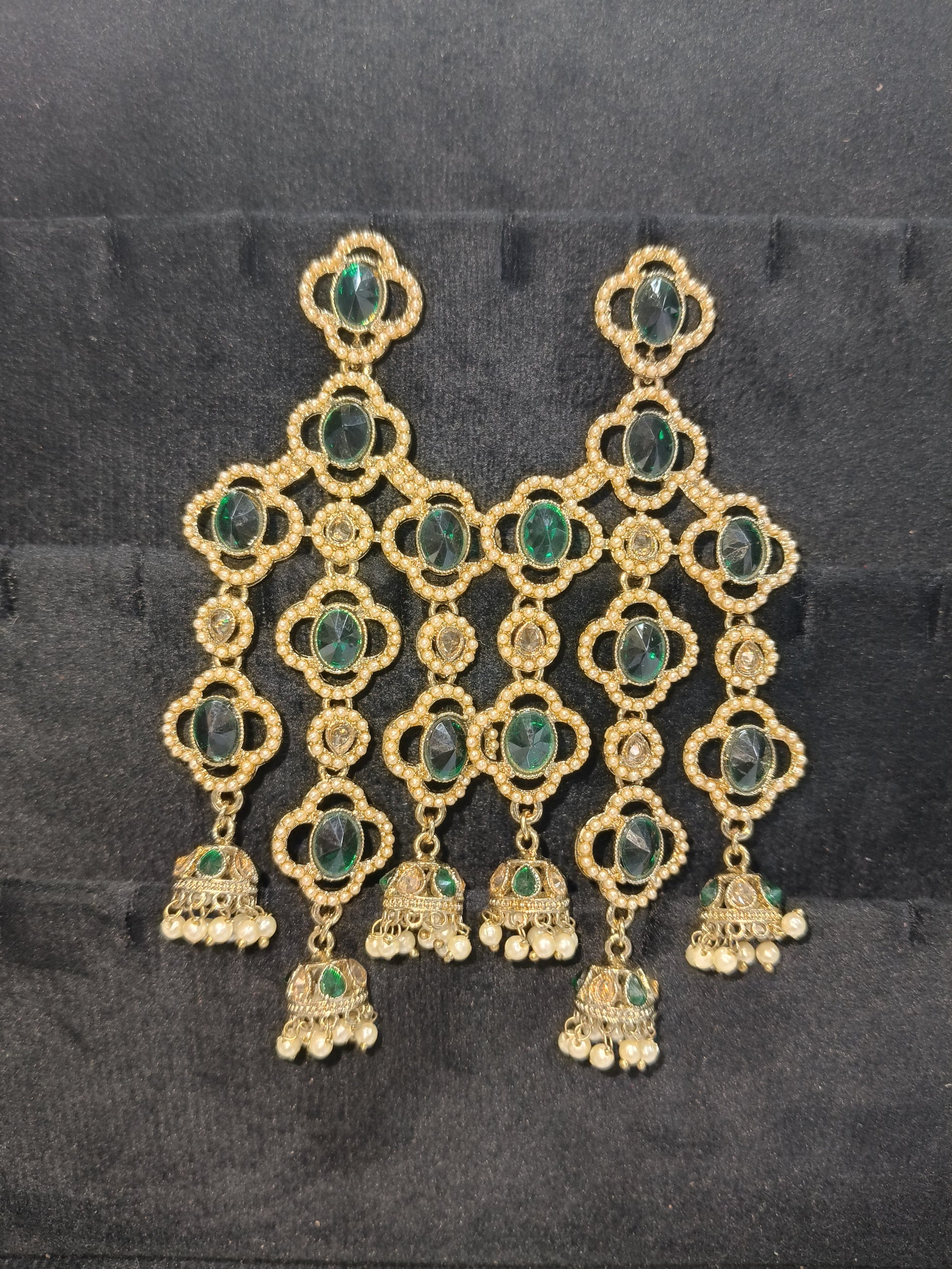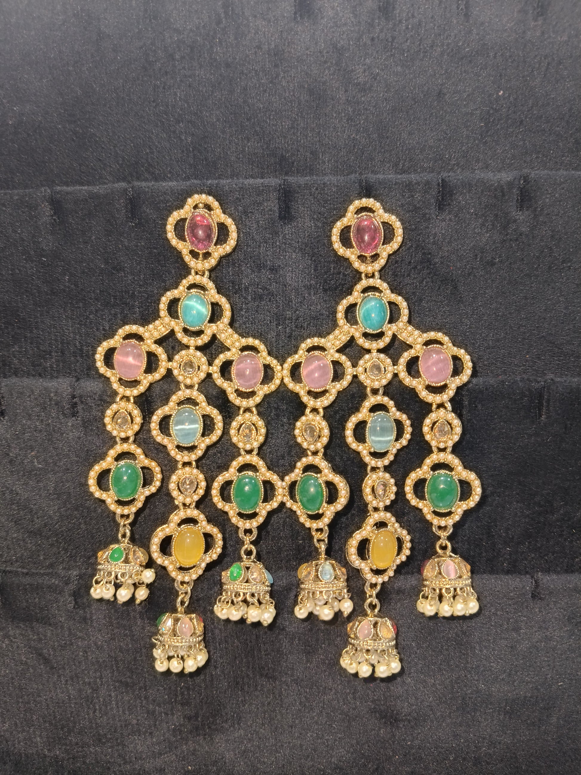 Turn heads with these majestic multi-tiered Kundan earrings, beautifully handcrafted with baby pink stones, pearls, and intricate jhumka drops. These statement earrings cascade gracefully in a tiered floral design, perfect for weddings, festive occasions, or ethnic glam looks. The dazzling Kundan work and delicate detailing make them a standout piece in your jewelry collection.