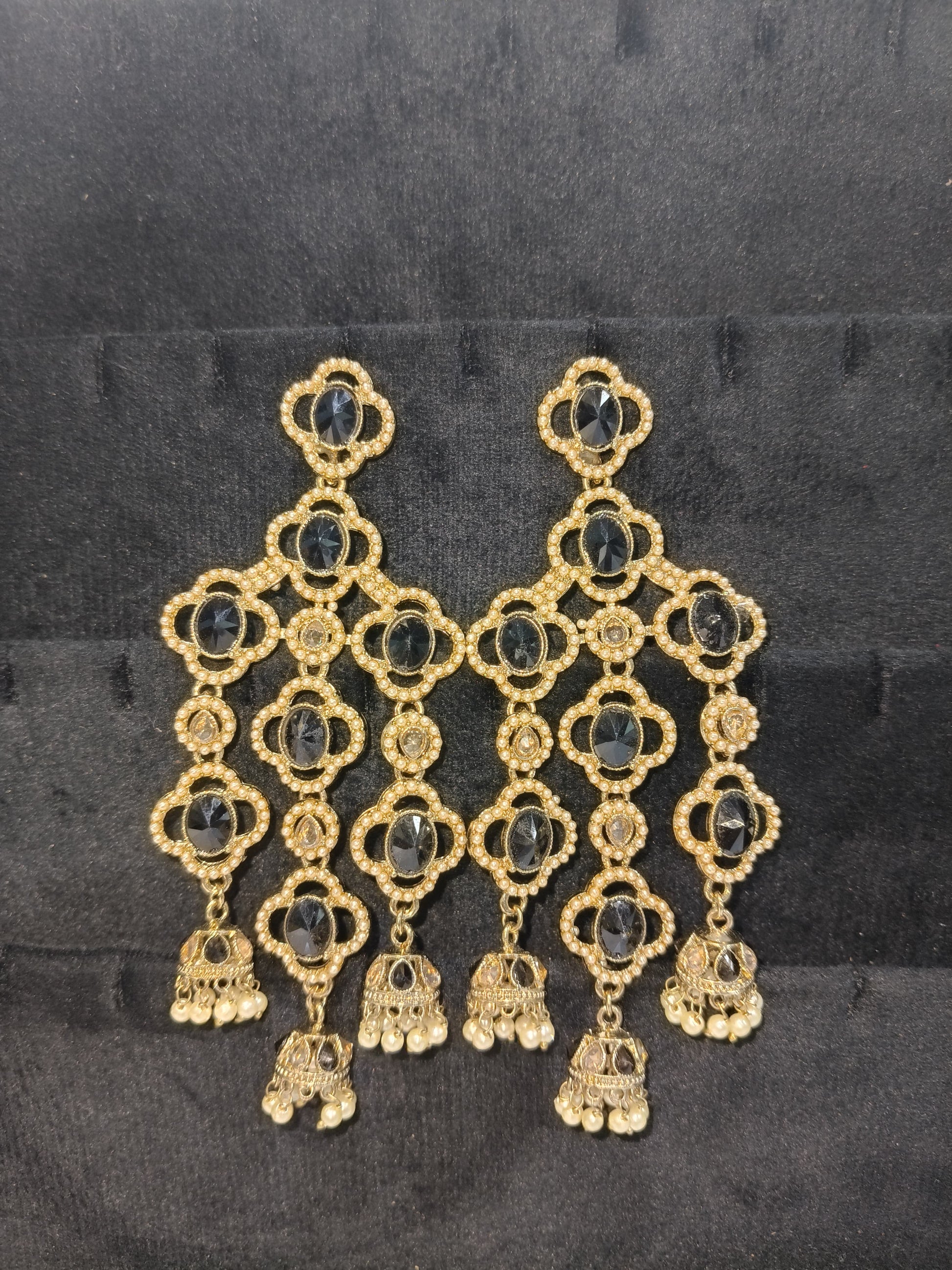 Design: Multi-tiered floral pattern with pearl-embellished jhumka drops
