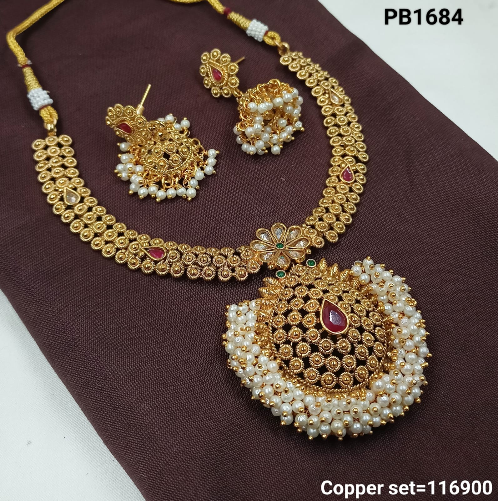 Royal Temple-Style Copper Necklace Set with Pearl Embellishments